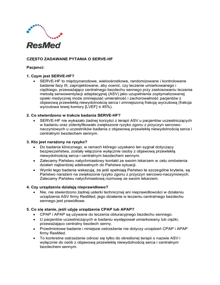 CZĘST TO ZADAWA ANE PYTA ANIA O SER RVE-HF Pacjenci: 1. Czym m jest SERV VE-HF? SERVE-HF F to międzyn narodowe, w wieloośrodk kowe, rando omizowanee i kontrolow wane badanie fazzy III, zapro ojektowane, aby ocenić ć, czy leczenie umiarkoowanego i ciężkiego, przeważają p ąco centraln nego bezdec chu senneg go przy zasttosowaniu le eczenia metodą serrwowentylac cji adaptacyyjnej (ASV) jako uzupe ełnienia zopptymalizowa anej ać umieraln opieki medycznej moż że zmniejsza ność i zacho orowalność pacjentów z objawową przewlekłą p niewydolno ością serca i zmniejszoną frakcją w wyrzutową (frakcja ( wyrzutowa lewej komo ory [LVEF] ≤ 45%). 2. Co s stwierdzono o w trakcie e badania S SERVE-HF? ? SERVE-HF F nie wykazało żadnej korzyści z terapii t ASV u pacjentów w uczestnic czących w badaniu oraz zidentyfikowało zw zwiększone ryzyko zgonu z przyczzyn sercowo onaczyniowyych u uczes stników bad dania z obja awową przew wlekłą niew wydolnością ą serca i centralnym bezdechem m sennym. ony na ryzy yko? 3. Kto jjest narażo Do badania a klinicznego, w ramacch którego uzyskano u ten sygnał dootyczący bezpieczeń ństwa, zosta ały włączon ne wyłącznie e osoby z objawową prrzewlekłą niewydolno ością serca i centralnym m bezdeche em sennym. P na atychmiastow wy kontakt ze swoim le ekarzem w celu omów wienia Zalecamy Państwu działań najbardziej ade ekwatnych do Państwa a sytuacji. o badania wskazują, w że e jeśli spełn niają Państw wo te szczeególne kryteria, są Wyniki tego Państwo na arażeni na zwiększone z e ryzyko zgo onu z przyczyn sercow wo-naczynio owych. Zalecamy Państwu P na atychmiastow wą rozmow wę ze swoim m lekarzem. urządzenia a działają nieprawidło n owo? 4. Czy u Nie, nie stw wierdzono żadnej ż usterrki techniczn nej ani niep prawidłowośści w działaniu urządzenia a ASV firmy ResMed; je ego działanie w leczeniu centralneego bezdec chu sennego je est prawidłow we. się stanie, jeśli użyję urządzenia u a CPAP lub b APAP? 5. Co s AP są używ wane do lecczenia obturracyjnego bezdechu seennego. CPAP i APA w uczestnic czących w b badaniu wys stępował um miarkowanyy lub ciężki, U pacjentów przeważają ąco centraln ny bezdech senny. owe badanie e i niniejsze e ostrzeżenie nie dotyc czy urządzeeń CPAP i APAP A Przedmioto firmy ResM Med. ne ostrzeże enie odnosi się tylko do o określonejj terapii o naazwie ASV i To konkretn wyłącznie do d osób z objawową o prrzewlekłą niewydolnością serca i ccentralnym bezdechem m sennym. Jeśli nie ma Pan/Pani pewności, czy Pana/Pani urządzenie jest urządzeniem ASV (lub urządzeniem stwarzającym ryzyko), może Pan/Pani to sprawdzić, dzwoniąc na niżej podany numer hotline dla swojego kraju. Hotline : +48 22 121 6423
