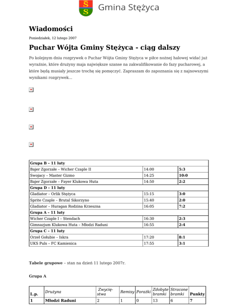 Wiadomości Poniedziałek, 12 lutego 2007 Puchar Wójta Gminy Stężyca - ciąg dalszy Po kolejnym dniu rozgrywek o Puchar Wójta Gminy Stężyca w piłce nożnej halowej widać już wyraźnie, które drużyny maja największe szanse na zakwalifikowanie do fazy pucharowej, a które będą musiały jeszcze trochę się pomęczyć. Zapraszam do zapoznania się z najnowszymi wynikami rozgrywek... Grupa B – 11 luty Bajer Zgorzałe – Wicher Czaple II 14:00 5:3 Swojacy – Master Gizmo 14:25 10:0 Bajer Zgorzałe – Fayer Klukowa Huta 14:50 2:2 Gladiator – Orlik Stężyca 15:15 3:0 Sprite Czaple – Brutal Sikorzyno 15:40 2:0 Gladiator – Huragan Rodzina Krzeszna 16:05 7:2 Wicher Czaple I – Stendach 16:30 2:3 Gimnazjum Klukowa Huta – Młodzi Raduni 16:55 2:4 Orzeł Gołubie – Iskra 17:20 8:1 UKS Puls – FC Kamienica 17:55 3:1 Grupa D – 11 luty Grupa A – 11 luty Grupa C – 11 luty Tabele grupowe – stan na dzień 11 lutego 2007r. Grupa A L.p. 1 Drużyna Zwycięstwa Remisy Porażki Zdobyte Stracone bramki bramki Punkty Młodzi Raduni 2 1 13 0 6 7 2 Sten-dach 2 1 0 11 4 7 3 Gimnazjum Klukowa Huta 1 0 2 5 11 3 4 UKS Klukowa Huta 0 2 0 3 3 2 5 Wicher Czaple 0 0 3 6 14 0 Grupa B 1 Bajer Zgorzałe 2 2 0 11 7 8 2 Fayer Klukowa Huta 2 1 0 8 4 7 3 Swojacy 1 1 1 11 3 4 4 Wicher Czaple 2 1 0 1 4 3 3 5 Master Gizmo 0 0 3 3 18 0 Grupa C 1 Orzeł Gołubie 3 0 0 21 1 9 2 UKS Puls 2 0 1 7 8 6 3 GKS Kamienica Szlachecka 1 0 1 14 4 3 4 Iskra 1 0 2 5 15 3 5 FC Kamienica Szl. 0 0 3 1 20 0 Grupa D 1 Gladiator 3 1 0 17 3 10 2 Sprite Czaple 2 0 1 7 7 6 3 Brutal Sikorzyno 1 1 1 2 3 4 4 Huragan Rodzina Krzeszna 0 1 2 5 11 1 5 Orlik Stężyca 0 1 2 5 11 1