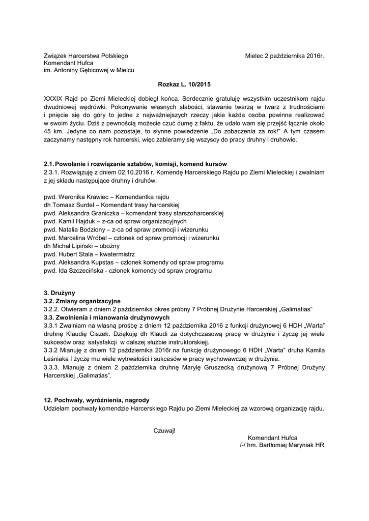 Związek Harcerstwa Polskiego Komendant Hufca im. Antoniny Gębicowej w Mielcu Mielec 2 października 2016r. Rozkaz L. 10/2015 XXXIX Rajd po Ziemi Mieleckiej dobiegł końca. Serdecznie gratuluję wszystkim uczestnikom rajdu dwudniowej wędrówki. Pokonywanie własnych słabości, stawanie twarzą w twarz z trudnościami i pnięcie się do góry to jedne z najważniejszych rzeczy jakie każda osoba powinna realizować w swoim życiu. Dziś z pewnością możecie czuć dumę z faktu, że udało wam się przejść łącznie około 45 km. Jedyne co nam pozostaje, to słynne powiedzenie „Do zobaczenia za rok!” A tym czasem zaczynamy następny rok harcerski, więc zabieramy się wszyscy do pracy druhny i druhowie. 2.1. Powołanie i rozwiązanie sztabów, komisji, komend kursów 2.3.1. Rozwiązuję z dniem 02.10.2016 r. Komendę Harcerskiego Rajdu po Ziemi Mieleckiej i zwalniam z jej składu następujące druhny i druhów: pwd. Weronika Krawiec – Komendantka rajdu dh Tomasz Surdel – Komendant trasy harcerskiej pwd. Aleksandra Graniczka – komendant trasy starszoharcerskiej pwd. Kamil Hajduk – z-ca od spraw organizacyjnych pwd. Natalia Bodziony – z-ca od spraw promocji i wizerunku pwd. Marcelina Wróbel – członek od spraw promocji i wizerunku dh Michał Lipiński – oboźny pwd. Hubert Stala – kwatermistrz pwd. Aleksandra Kupstas – członek komendy od spraw programu pwd. Ida Szczecińska - członek komendy od spraw programu 3. Drużyny 3.2. Zmiany organizacyjne 3.2.2. Otwieram z dniem 2 października okres próbny 7 Próbnej Drużynie Harcerskiej „Galimatias” 3.3. Zwolnienia i mianowania drużynowych 3.3.1 Zwalniam na własną prośbę z dniem 12 października 2016 z funkcji drużynowej 6 HDH „Warta” druhnę Klaudię Ciszek. Dziękuję dh Klaudi za dotychczasową pracę w drużynie i życzę jej wiele sukcesów oraz satysfakcji w dalszej służbie instruktorskiejj. 3.3.2 Mianuję z dniem 12 października 2016r.na funkcję drużynowego 6 HDH „Warta” druha Kamila Leśniaka i życzę mu wiele wytrwałości i sukcesów w pracy wychowawczej w drużynie. 3.3.3. Mianuję z dniem 2 października druhnę Marylę Gruszecką drużynową 7 Próbnej Drużyny Harcerskiej „Galimatias”. 12. Pochwały, wyróżnienia, nagrody Udzielam pochwały komendzie Harcerskiego Rajdu po Ziemi Mieleckiej za wzorową organizację rajdu. Czuwaj! Komendant Hufca /-/ hm. Bartłomiej Maryniak HR
