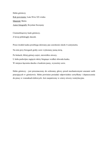 Hełm górniczy Rok powstania: Lata 50-te XX wieku Materiał: Skóra Autor fotografii: Krystian Szczęsny Ciemnobrązowy kask górniczy. Z lewej półokrągły daszek. Przez środek kasku przebiega skórzany pas szerokości około 4 centymetra. Na nim przy brzegach gruby szew wykonany jasną nicią. Po bokach, bliżej górnej części, niewielkie otwory. U dołu podwójne zagięcie skóry biegnące wzdłuż obwodu kasku. W miejscu łączenia daszka z kaskiem jasny, wyrazisty szew. Hełm górniczy - jest przeznaczony do ochronny głowy przed mechanicznymi urazami osób pracujących w górnictwie. Hełm powinien posiadać odpowiednie certyfikaty i dopuszczenia do pracy w warunkach dołowych. Jest zaopatrzony w cztery otwory wentylacyjne.