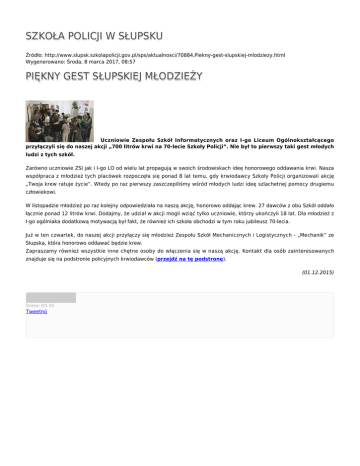SZKOŁA POLICJI W SŁUPSKU Źródło: http://www.slupsk.szkolapolicji.gov.pl/sps/aktualnosci/70884,Piekny-gest-slupskiej-mlodziezy.html Wygenerowano: Środa, 8 marca 2017, 08:57 PIĘKNY GEST SŁUPSKIEJ MŁODZIEŻY Uczniowie Zespołu Szkół Informatycznych oraz I-go Liceum Ogólnokształcącego przyłączyli się do naszej akcji „700 litrów krwi na 70-lecie Szkoły Policji”. Nie był to pierwszy taki gest młodych ludzi z tych szkół. Zarówno uczniowie ZSI jak i I-go LO od wielu lat propagują w swoich środowiskach ideę honorowego oddawania krwi. Nasza współpraca z młodzież tych placówek rozpoczęła się ponad 8 lat temu, gdy krwiodawcy Szkoły Policji organizowali akcję „Twoja krew ratuje życie”. Wtedy po raz pierwszy zaszczepiliśmy wśród młodych ludzi ideę szlachetnej pomocy drugiemu człowiekowi. W listopadzie młodzież po raz kolejny odpowiedziała na naszą akcję, honorowo oddając krew. 27 dawców z obu Szkół oddało łącznie ponad 12 litrów krwi. Dodajmy, że udział w akcji mogli wziąć tylko uczniowie, którzy ukończyli 18 lat. Dla młodzież z I-go ogólniaka dodatkową motywacją był fakt, że również ich szkoła obchodzi w tym roku jubileusz 70-lecia. Już w ten czwartek, do naszej akcji przyłączy się młodzież Zespołu Szkół Mechanicznych i Logistycznych - „Mechanik” ze Słupska, która honorowo oddawać będzie krew. Zapraszamy również wszystkie inne chętne osoby do włączenia się w naszą akcję. Kontakt dla osób zainteresowanych znajduje się na podstronie policyjnych krwiodawców (przejdź na tę podstronę). (01.12.2015) Ocena: 0/5 (0) Tweetnij