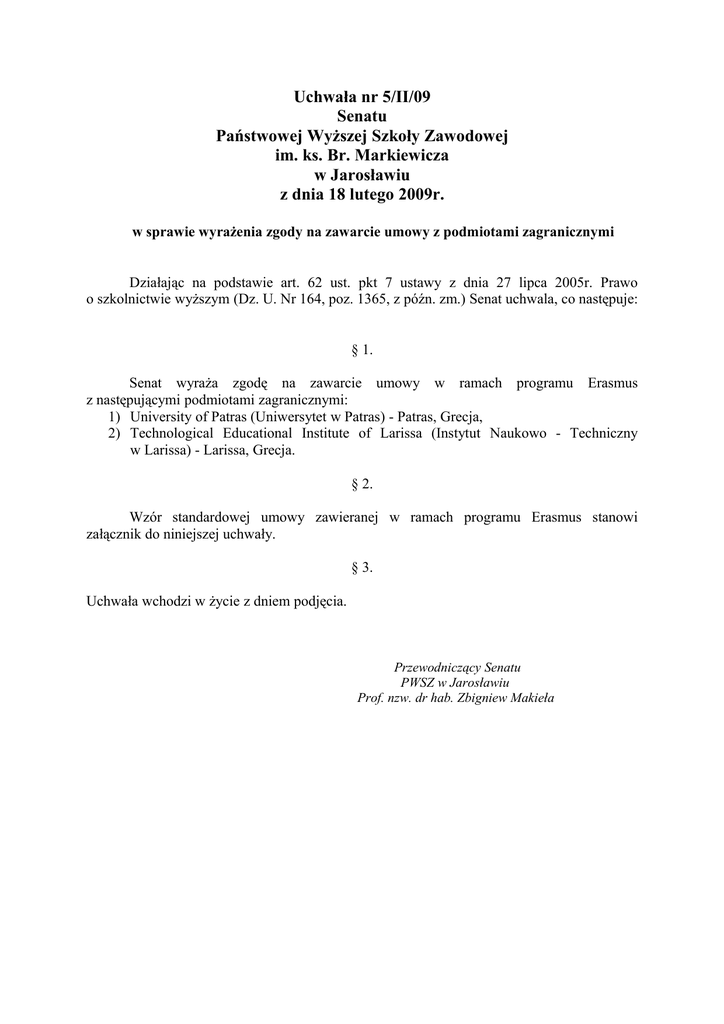 Uchwała nr 5/II/09 Senatu Państwowej Wyższej Szkoły Zawodowej im. ks. Br. Markiewicza w Jarosławiu z dnia 18 lutego 2009r. w sprawie wyrażenia zgody na zawarcie umowy z podmiotami zagranicznymi Działając na podstawie art. 62 ust. pkt 7 ustawy z dnia 27 lipca 2005r. Prawo o szkolnictwie wyższym (Dz. U. Nr 164, poz. 1365, z późn. zm.) Senat uchwala, co następuje: § 1. Senat wyraża zgodę na zawarcie umowy w ramach programu Erasmus z następującymi podmiotami zagranicznymi: 1) University of Patras (Uniwersytet w Patras) - Patras, Grecja, 2) Technological Educational Institute of Larissa (Instytut Naukowo - Techniczny w Larissa) - Larissa, Grecja. § 2. Wzór standardowej umowy zawieranej w ramach programu Erasmus stanowi załącznik do niniejszej uchwały. § 3. Uchwała wchodzi w życie z dniem podjęcia. Przewodniczący Senatu PWSZ w Jarosławiu Prof. nzw. dr hab. Zbigniew Makieła