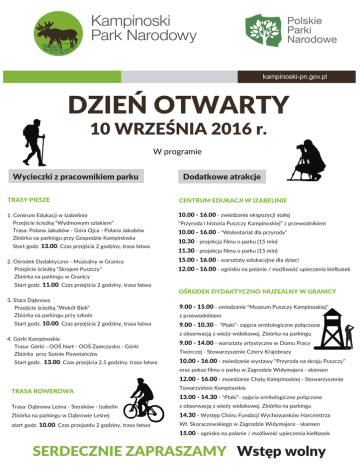 kampinoski-pn.gov.pl DZIEÑ OTWARTY 10 WRZEŒNIA 2016 r. W programie Wycieczki z pracownikiem parku Dodatkowe atrakcje TRASY PIESZE CENTRUM EDUKACJI W IZABELINIE 1. Centrum Edukacji w Izabelinie Przejœcie œcie¿k¹ “Wydmowym szlakiem” Trasa: Polana Jakubów - Góra Ojca - Polana Jakubów Zbiórka na parkingu przy Gospodzie Kampinówka 10.00 - 16.00 - zwiedzanie ekspozycji sta³ej Start godz. 13.00. Czas przejœcia 2 godziny, trasa ³atwa 2. Oœrodek Dydaktyczno - Muzealny w Granicy Przejœcie œcie¿k¹ “Skrajem Puszczy” Zbiórka na parkingu w Granicy “Przyroda i historia Puszczy Kampinoskiej” z przewodnikiem 10.00 - 16.00 - “Wolontariat dla przyrody” 10.30 - projekcja filmu o parku (15 min) 11.30 - projekcja filmu o parku (15 min) 15.00 - 16.00 - warsztaty edukacyjne dla dzieci 12.00 - 16.00 - ognisko na polanie / mo¿liwoœæ upieczenia kie³basek Start godz. 11.00. Czas przejœcia 2 godziny, trasa ³atwa OŒRODEK DYDAKTYCZNO-MUZEALNY W GRANICY 3. Stara D¹browa Przejœcie œcie¿k¹ “Wokó³ Bieli” Zbiórka na parkingu przy szkole Start godz. 10.00. Czas przejœcia 2 godziny, trasa ³atwa 9.00 - 15.00 - zwiedzanie “Muzeum Puszczy Kampinoskiej” z przewodnikiem 9.00 - 10.30 - “Ptaki”- zajêcia ornitologiczne po³¹czone z obserwacj¹ z wie¿y widokowej. Zbiórka na parkingu 4. Górki Kampinoskie Trasa: Górki - OOŒ Nart - OOŒ Zamczysko - Górki Zbiórka przy Soœnie Powstañców Start godz. 13.00. Czas przejœcia 2,5 godziny, trasa ³atwa 9.00 - 14.00 - warsztaty artystyczne w Domu Pracy Twórczej - Stowarzyszenie Cztery Krajobrazy 10.00 - 16.00 - zwiedzanie wystawy “Przyroda na skraju Puszczy” oraz pokaz filmu o parku w Zagrodzie Widymajera - skansen 12.00 - 16.00 - zwiedzanie Chaty Kampinoskiej - Stowarzyszenie TRASA ROWEROWA Towarzystwo Kampinoskie 13.00 - 14.30 - “Ptaki”- zajêcia ornitologiczne po³¹czone Trasa: D¹browa Leœna - Sieraków - Izabelin z obserwacj¹ z wie¿y widokowej. Zbiórka na parkingu Zbiórka na parkingu w D¹browie Leœnej 14.30 - Wystêp Chóru Fundacji Wychowanków Harcmistrza start godz. 10.00. Czas przejazdu 2 godziny, trasa ³atwa W³. Skoraczewskiego w Zagrodzie Widymajera - skansen 15.00 - ognisko na polanie / mo¿liwoœæ upieczenia kie³basek SERDECZNIE ZAPRASZAMY Wstêp wolny