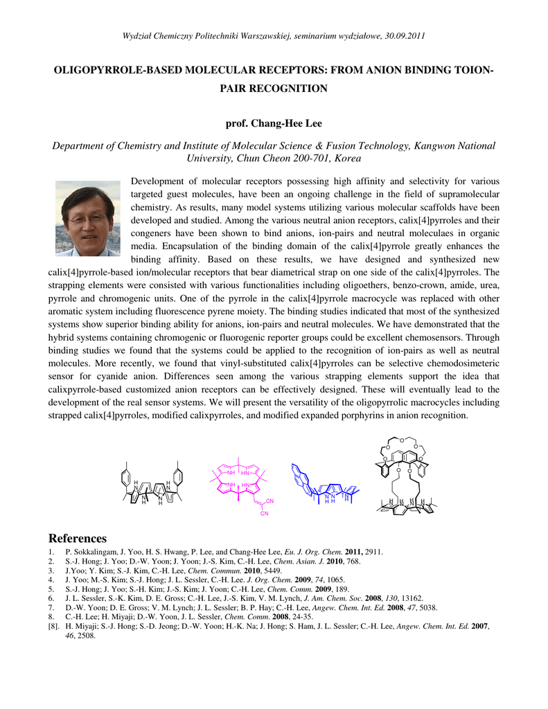 Wydział Chemiczny Politechniki Warszawskiej, seminarium wydziałowe, 30.09.2011 OLIGOPYRROLE-BASED MOLECULAR RECEPTORS: FROM ANION BINDING TOIONPAIR RECOGNITION prof. Chang-Hee Lee Department of Chemistry and Institute of Molecular Science & Fusion Technology, Kangwon National University, Chun Cheon 200-701, Korea Development of molecular receptors possessing high affinity and selectivity for various targeted guest molecules, have been an ongoing challenge in the field of supramolecular chemistry. As results, many model systems utilizing various molecular scaffolds have been developed and studied. Among the various neutral anion receptors, calix[4]pyrroles and their congeners have been shown to bind anions, ion-pairs and neutral moleculaes in organic media. Encapsulation of the binding domain of the calix[4]pyrrole greatly enhances the binding affinity. Based on these results, we have designed and synthesized new calix[4]pyrrole-based ion/molecular receptors that bear diametrical strap on one side of the calix[4]pyrroles. The strapping elements were consisted with various functionalities including oligoethers, benzo-crown, amide, urea, pyrrole and chromogenic units. One of the pyrrole in the calix[4]pyrrole macrocycle was replaced with other aromatic system including fluorescence pyrene moiety. The binding studies indicated that most of the synthesized systems show superior binding ability for anions, ion-pairs and neutral molecules. We have demonstrated that the hybrid systems containing chromogenic or fluorogenic reporter groups could be excellent chemosensors. Through binding studies we found that the systems could be applied to the recognition of ion-pairs as well as neutral molecules. More recently, we found that vinyl-substituted calix[4]pyrroles can be selective chemodosimeteric sensor for cyanide anion. Differences seen among the various strapping elements support the idea that calixpyrrole-based customized anion receptors can be effectively designed. These will eventually lead to the development of the real sensor systems. We will present the versatility of the oligopyrrolic macrocycles including strapped calix[4]pyrroles, modified calixpyrroles, and modified expanded porphyrins in anion recognition. O O O O H N H N N H N H NH HN NH HN O O CN N N H H N H H N H N O H N H N CN References 1. 2. 3. 4. 5. 6. 7. 8. [8]. P. Sokkalingam, J. Yoo, H. S. Hwang, P. Lee, and Chang-Hee Lee, Eu. J. Org. Chem. 2011, 2911. S.-J. Hong; J. Yoo; D.-W. Yoon; J. Yoon; J.-S. Kim, C.-H. Lee, Chem. Asian. J. 2010, 768. J.Yoo; Y. Kim; S.-J. Kim, C.-H. Lee, Chem. Commun. 2010, 5449. J. Yoo; M.-S. Kim; S.-J. Hong; J. L. Sessler, C.-H. Lee. J. Org. Chem. 2009, 74, 1065. S.-J. Hong; J. Yoo; S.-H. Kim; J.-S. Kim; J. Yoon; C.-H. Lee, Chem. Comm. 2009, 189. J. L. Sessler, S.-K. Kim, D. E. Gross; C.-H. Lee, J.-S. Kim, V. M. Lynch, J. Am. Chem. Soc. 2008, 130, 13162. D.-W. Yoon; D. E. Gross; V. M. Lynch; J. L. Sessler; B. P. Hay; C.-H. Lee, Angew. Chem. Int. Ed. 2008, 47, 5038. C.-H. Lee; H. Miyaji; D.-W. Yoon, J. L. Sessler, Chem. Comm. 2008, 24-35. H. Miyaji; S.-J. Hong; S.-D. Jeong; D.-W. Yoon; H.-K. Na; J. Hong; S. Ham, J. L. Sessler; C.-H. Lee, Angew. Chem. Int. Ed. 2007, 46, 2508.