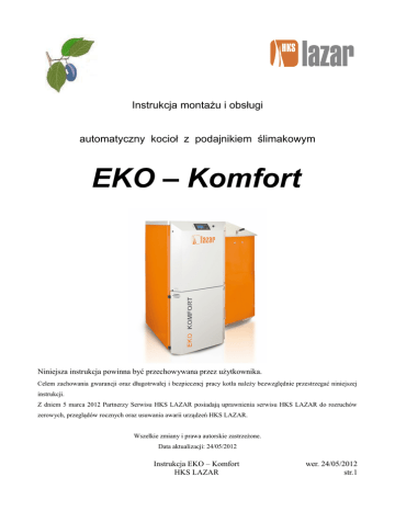 Instrukcja montażu i obsługi automatyczny kocioł z podajnikiem ślimakowym EKO – Komfort Niniejsza instrukcja powinna być przechowywana przez użytkownika. Celem zachowania gwarancji oraz długotrwałej i bezpiecznej pracy kotła należy bezwzględnie przestrzegać niniejszej instrukcji. Z dniem 5 marca 2012 Partnerzy Serwisu HKS LAZAR posiadają uprawnienia serwisu HKS LAZAR do rozruchów zerowych, przeglądów rocznych oraz usuwania awarii urządzeń HKS LAZAR. Wszelkie zmiany i prawa autorskie zastrzeżone. Data aktualizacji: 24/05/2012 Instrukcja EKO – Komfort HKS LAZAR wer. 24/05/2012 str.1 Szanowni Użytkownicy kotła EKO– Komfort! Dziękujemy za zaufanie jakim nas Państwo obdarzyli. Dołożymy wszelkich starań, aby użytkowanie naszego urządzenia było bezawaryjne, komfortowe i przyniosło Państwu wiele satysfakcji. Zakupiony przez Państwa kocioł retortowy EKO – Komfort należy do grona urządzeń zaprojektowanych według najnowszych standardów oraz trendów w technice grzewczej. Kocioł wyposażony jest w palnik retortowy, przystosowany do spalanie paliw stałych w postaci węgla typu eko-groszek oraz granulatu pellet. Unikalna budowa wymiennika i palnika sprawiają, iż osiąga on wysoką sprawność przy jednoczesnym zachowaniu niskiej emisji substancji szkodliwych dla środowiska naturalnego. Cechy te sprawiły, że kotły EKO – Komfort otrzymały świadectwo urządzenia spełniającego kryteria standardu energetyczno – ekologicznego. Prosimy o zapoznanie się z niniejszą instrukcją oraz załączoną instrukcją sterownika, aby użytkowanie kotła było bezpieczne. W przypadku jakichkolwiek wątpliwości służymy pomocą. Z poważaniem Marcin Lazar Instrukcja EKO – Komfort HKS LAZAR wer. 24/05/2012 str.2 Spis treści 1 Informacje ogólne.............................................................................................................................4 2 Zalecenia...........................................................................................................................................4 3 Wymagania dotyczące bezpieczeństwa............................................................................................5 4 Dane techniczne kotła.......................................................................................................................7 5 Budowa kotła..................................................................................................................................12 5.1 EKO – Komfort Automat........................................................................................................16 6 Rodzaje paliwa...............................................................................................................................18 7 Instrukcja obsługi dla użytkownika................................................................................................19 7.1 Rozpoczęcie pracy kotła.........................................................................................................19 7.2 Praca kotła...............................................................................................................................19 7.3 Konserwacja oraz czyszczenie kotła.......................................................................................21 7.4 Wygaszanie kotła....................................................................................................................23 7.5 Uwagi szczególne dla spalania granulatu pelet......................................................................24 8 Instrukcja instalacji kotła................................................................................................................25 8.1 Wnoszenie kotła......................................................................................................................26 8.2 Kotłownia – umiejscowienie urządzenia................................................................................26 8.3 Instalacja grzewcza.................................................................................................................27 8.3.1 Praca kotła w układzie zamkniętym................................................................................30 9 Serwisowanie kotła.........................................................................................................................34 9.1 Kontrola przed rozruchem......................................................................................................34 9.2 Rozruch zerowy......................................................................................................................35 9.3 Usuwanie awarii.....................................................................................................................35 9.4 Przegląd roczny.......................................................................................................................36 10 Likwidacja urządzenia po okresie użytkowania...........................................................................37 11 Warunki gwarancji i odpowiedzialności.......................................................................................37 12 Atesty i deklaracje........................................................................................................................40 13 Schemat elektryczny.....................................................................................................................44 Instrukcja EKO – Komfort HKS LAZAR wer. 24/05/2012 str.3 1 Informacje ogólne. Kocioł EKO – Komfort jest ekologicznym kotłem retortowym wyposażonym w stalowy wymiennik. Zastosowany w nim automatyczny podajnik ślimakowy umożliwia spalanie paliw stałych w postaci węglą oraz granulatu pelet. Odbiór wytworzonego w procesie spalania ciepła gwarantuje unikalny okrągły wymiennik o wysokiej sprawności. Kocioł wyposażony jest w prosty i przejrzysty sterownik z os