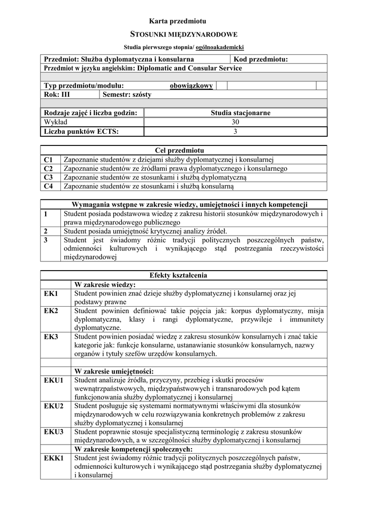 Karta przedmiotu STOSUNKI MIĘDZYNARODOWE Studia pierwszego stopnia/ ogólnoakademicki Przedmiot: Służba dyplomatyczna i konsularna Kod przedmiotu: Przedmiot w języku angielskim: Diplomatic and Consular Service Typ przedmiotu/modułu: Rok: III Semestr: szósty obowiązkowy Rodzaje zajęć i liczba godzin: Wykład Liczba punktów ECTS: C1 C2 C3 C4 1 2 3 Studia stacjonarne 30 3 Cel przedmiotu Zapoznanie studentów z dziejami służby dyplomatycznej i konsularnej Zapoznanie studentów ze źródłami prawa dyplomatycznego i konsularnego Zapoznanie studentów ze stosunkami i służbą dyplomatyczną Zapoznanie studentów ze stosunkami i służbą konsularną Wymagania wstępne w zakresie wiedzy, umiejętności i innych kompetencji Student posiada podstawowa wiedzę z zakresu historii stosunków międzynarodowych i prawa międzynarodowego publicznego Student posiada umiejętność krytycznej analizy źródeł. Student jest świadomy różnic tradycji politycznych poszczególnych państw, odmienności kulturowych i wynikającego stąd postrzegania rzeczywistości międzynarodowej Efekty kształcenia EK1 EK2 EK3 EKU1 EKU2 EKU3 EKK1 W zakresie wiedzy: Student powinien znać dzieje służby dyplomatycznej i konsularnej oraz jej podstawy prawne Student powinien definiować takie pojęcia jak: korpus dyplomatyczny, misja dyplomatyczna, klasy i rangi dyplomatyczne, przywileje i immunitety dyplomatyczne. Student powinien posiadać wiedzę z zakresu stosunków konsularnych i znać takie kategorie jak: funkcje konsularne, ustanawianie stosunków konsularnych, nazwy organów i tytuły szefów urzędów konsularnych. W zakresie umiejętności: Student analizuje źródła, przyczyny, przebieg i skutki procesów wewnątrzpaństwowych, międzypaństwowych i transnarodowych pod kątem funkcjonowania służby dyplomatycznej i konsularnej Student posługuje się systemami normatywnymi właściwymi dla stosunków międzynarodowych w celu rozwiązywania konkretnych problemów z zakresu służby dyplomatycznej i konsularnej Student poprawnie stosuje specjalistyczną terminologię z zakresu stosunków międzynarodowych, a w szczególności służby dyplomatycznej i konsularnej W zakresie kompetencji społecznych: Student jest świadomy różnic tradycji politycznych poszczególnych państw, odmienności kulturowych i wynikającego stąd postrzegania służby dyplomatycznej i konsularnej EKK2 EKK3 W1 W2 W3 W4 W5 W6 W7 Student ma świadomość znaczenia zachowywania się w sposób profesjonalny i etyczny, poszerzoną o umiejętność aktywnego propagowania i egzekwowania takich postaw w szczególności w zakresie służby dyplomatycznej i konsularnej Student jest wrażliwy na naruszanie norm prawa i etyki międzynarodowej w zakresie służby dyplomatycznej i konsularnej Treści programowe przedmiotu Forma zajęć - wykłady Treści programowe Rys historyczny służby dyplomatycznej Podstawy prawne służby dyplomatycznej Stosunki dyplomatyczne Służba dyplomatyczna Rys historyczny i podstawy prawne służby konsularnej Stosunki konsularne Służba konsularna Liczba godzin 3 6 3 6 3 3 6 Metody i środki dydaktyczne 1 2 3 Wykład konwersatoryjny Metoda problemowa i symulacyjna Analiza tekstów z dyskusją Sposoby oceniania Ocenianie kształtujące F1 F2 P1 P2 Prezentacje multimedialne Referaty problemowe Ocenianie podsumowujące Obecność na zajęciach Egzamin Obciążenie pracą studenta Forma aktywności Godziny kontaktowe z wykładowcą, realizowane w formie zajęć dydaktycznych – łączna liczba godzin w semestrze Godziny kontaktowe z wykładowcą realizowane w formie (np. konsultacji) – łączna liczba godzin w semestrze Przygotowanie się do zajęć (np. laboratorium) – łączna liczba godzin w semestrze Praca własna studenta Suma Sumaryczna liczba punktów ECTS dla przedmiotu/modułu 1 2 3 4 Średnia liczba godzin na realizowanie aktywności 30 5 20 35 90 3 Literatura podstawowa i uzupełniająca J. Sutor, Prawo dyplomatyczne i konsularne, Warszawa 2010 I. Gawłowicz, Międzynarodowe prawo dyplomatyczne, Warszawa 2011 Prawo dyplomatyczne i konsularne: wybór dokumentów, oprac. A. Przyborowska – Klimczak, W. Staszewski, Lublin 2005 W. Kozyra, Informacje z konsulatów polskich w Niemczech w materiałach Ministerstwa Spraw Wewnętrznych Rzeczypospolitej Polskiej z lat 1918 – 1939. W: Konsulaty na pograniczu polsko – niemieckim i polsko – czechosłowackim w latach 1918 – 1939, red. R. Kaczmarek, M. Masnyk, Katowice 2004, s. 26 – 41 EKW1 EKW2 EKW3 EKU1 EKU2 EKU3 EKK1 EKK2 EKK3 K_W02 K_W10 K_W18 +++ +++ + ++ +++ ++ K_W08 K_W03 K_W11 K_W06 K_W07 K_W09 K_U06 K_U07 K_U09 K_U08 K_U11 K_U12 K_U11 K_U06 K_U09 K_K02 K_K03 K_K04 K_K04 K_K06 K_K11 K_K07 K_K08 K_K09 +++ ++ + +++ ++ + +++ ++ + ++ ++ ++ +++ +++ +++ +++ ++ + +++ +++ + +++ +++ ++ +++ ++ ++ +++ +++ + +++ + + +++ +++ +++ +++ ++ + +++ + ++ +++ ++ + +++ ++ + Sposoby oceniania Metody i środki dydaktyczne Treści programowe Cele przedmiotu Stopień w jakim efekty kształcenia związane są z przedmiotem Odniesienie danego efektu do efektów specjalnościowych Stopień w jakim efekty kształcenia związane są z przedmiotem Efekt kształcenia Odniesienie danego efektu kształcenia do efektów zdefiniowanych dla całego programu (PEK) Macierz efektów kształcenia C1, C2 W1, W2 1, 2 F1, P1, P2 C3, C4 W3, W4, W5 2,3 F2, P1, P2 C2, C4 W6, W7 1, 2 F1, P1, P2 C1, C3 W5, W6, W7 1,2 F2, P1, P2 C4, C2 W1, W3,W7 1,3 F1, P1, P2 C1, C3, W5, W6 2,3 F2, P1, P2 C2, C3 W6, W7 1,2 F1, P1, P2 C1, C4 W4, W7 1,3 F2, P1, P2 C2, C4 W1, W2, W6 2,3 F1, P1, P2 Formy oceny - szczegóły Na ocenę 2 (ndst) Na ocenę 3 (dst) Na ocenę 3+ (dst+) Na ocenę 4 (db) Na ocenę 4+ (db+) Na ocenę 5 (bdb) (w zakresie wiedzy, umiejętności i kompetencji społecznych) Student nie potrafi wymienić podstawowych pojęć z zakresu wiedzy o przedmiocie: służba dyplomatyczna i konsularna Student potrafi wymienić podstawowe pojęcia i terminy z zakresu wiedzy o przedmiocie: służba 