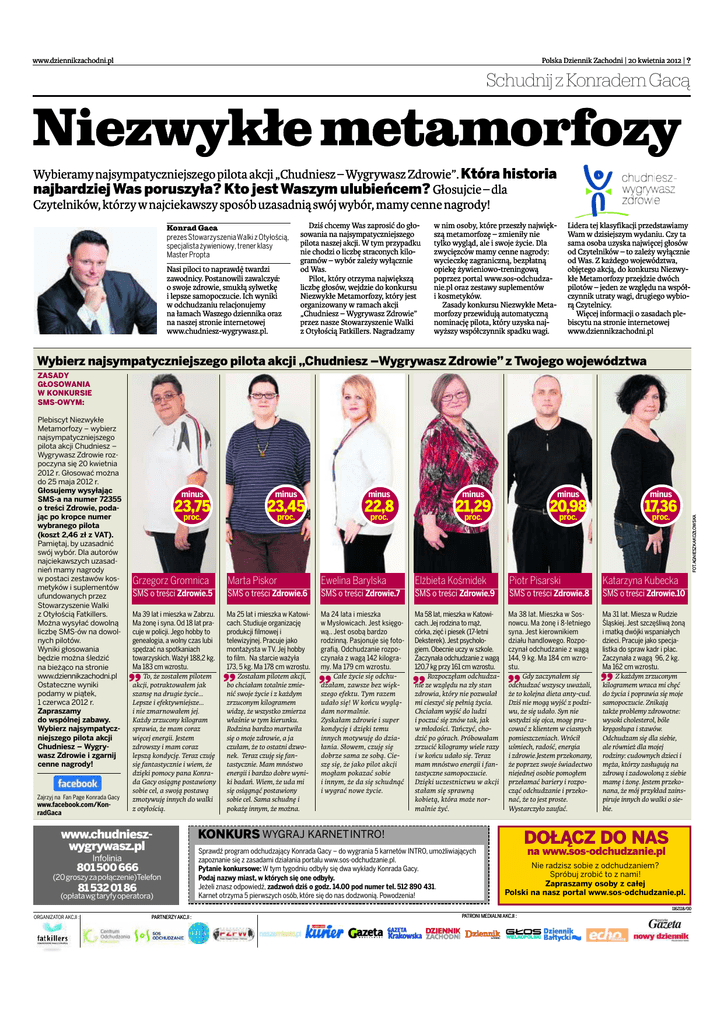 Polska Dziennik Zachodni | 20 kwietnia 2012 | ? www.dziennikzachodni.pl Schudnij z Konradem Gac¹ Gacą Magazyn Niezwykłe metamorfozy Wybieramy najsympatyczniejszego pilota akcji „Chudniesz – Wygrywasz Zdrowie”. Która historia najbardziej Was poruszyła? Kto jest Waszym ulubieńcem? Głosujcie – dla Czytelników, którzy w najciekawszy sposób uzasadnią swój wybór, mamy cenne nagrody! Konrad Gaca prezes Stowarzyszenia Walki z Otyłością, specjalista żywieniowy, trener klasy Master Propta Nasi piloci to naprawdę naprawdê twardzi zawodnicy. Postanowili zawalczyæ zawalczyć o swoje zdrowie, smukłą sylwetkę i lepsze samopoczucie. Ich wyniki w odchudzaniu relacjonujemy na łamach Waszego dziennika oraz na naszej stronie internetowej www.chudniesz-wygrywasz.pl. Dziś chcemy Was zaprosić do głosowania na najsympatyczniejszego pilota naszej akcji. W tym przypadku nie chodzi o liczbę straconych kilogramów – wybór zależy wyłącznie od Was. Pilot, który otrzyma największą liczbę głosów, wejdzie do konkursu Niezwykłe Metamorfozy, który jest organizowany w ramach akcji „Chudniesz – Wygrywasz Zdrowie” przez nasze Stowarzyszenie Walki z Otyłością Fatkillers. Nagradzamy w nim osoby, które przeszły największą metamorfozę – zmieniły nie tylko wygląd, ale i swoje życie. Dla zwycięzców mamy cenne nagrody: wycieczkę zagraniczną, bezpłatną opiekę żywieniowo-treningową poprzez portal www.sos-odchudzanie.pl oraz zestawy suplementów i kosmetyków. Zasady konkursu Niezwykłe Metamorfozy przewidują automatyczną nominację pilota, który uzyska najwyższy współczynnik spadku wagi. Lidera tej klasyfikacji przedstawiamy Wam w dzisiejszym wydaniu. Czy ta sama osoba uzyska najwięcej głosów od Czytelników – to zależy wyłącznie od Was. Z każdego województwa, objętego akcją, do konkursu Niezwykłe Metamorfozy przejdzie dwóch pilotów – jeden ze względu na współczynnik utraty wagi, drugiego wybiorą Czytelnicy. Więcej informacji o zasadach plebiscytu na stronie internetowej www.dziennikzachodni.pl Wybierz najsympatyczniejszego pilota akcji „Chudniesz –Wygrywasz Zdrowie” z Twojego województwa ZASADY GŁOSOWANIA W KONKURSIE SMS-OWYM: Zajrzyj na Fan Page Konrada Gacy www.facebook.com/KonradGaca minus minus 23,75 minus 23,45 proc. minus 22,8 proc. minus 21,29 proc. minus 20,98 proc. 17,36 proc. proc. Grzegorz Gromnica Marta Piskor Ewelina Barylska Elżbieta Kośmidek Piotr Pisarski Katarzyna Kubecka SMS o treści Zdrowie.5 SMS o treści Zdrowie.6 SMS o treści Zdrowie.7 SMS o treści Zdrowie.9 SMS o treści Zdrowie.8 SMS o treści Zdrowie.10 Ma 39 lat i mieszka w Zabrzu. Ma żonę i syna. Od 18 lat pracuje w policji. Jego hobby to genealogia, a wolny czas lubi spędzać na spotkaniach towarzyskich. Ważył 188,2 kg. Ma 183 cm wzrostu. To, że zostałem pilotem akcji, potraktowałem jak szansę na drugie życie... Lepsze i efektywniejsze… i nie zmarnowałem jej. Każdy zrzucony kilogram sprawia, że mam coraz więcej energii. Jestem zdrowszy i mam coraz lepszą kondycję. Teraz czuję się fantastycznie i wiem, że dzięki pomocy pana Konrada Gacy osiągnę postawiony sobie cel, a swoją postawą zmotywuję innych do walki z otyłością. Ma 25 lat i mieszka w Katowicach. Studiuje organizację produkcji filmowej i telewizyjnej. Pracuje jako montażysta w TV. Jej hobby to film. Na starcie ważyła 173, 5 kg. Ma 178 cm wzrostu. Zostałam pilotem akcji, bo chciałam totalnie zmienić swoje życie i z każdym zrzuconym kilogramem widzę, że wszystko zmierza właśnie w tym kierunku. Rodzina bardzo martwiła się o moje zdrowie, a ja czułam, że to ostatni dzwonek. Teraz czuję się fantastycznie. Mam mnóstwo energii i bardzo dobre wyniki badań. Wiem, że uda mi się osiągnąć postawiony sobie cel. Sama schudnę i pokażę innym, że można. Ma 24 lata i mieszka w Mysłowicach. Jest księgową.. Jest osobą bardzo rodzinną. Pasjonuje się fotografią. Odchudzanie rozpoczynała z wagą 142 kilogramy. Ma 179 cm wzrostu. Całe życie się odchudzałam, zawsze bez większego efektu. Tym razem udało się! W końcu wyglądam normalnie. Zyskałam zdrowie i super kondycję i dzięki temu innych motywuję do działania. Słowem, czuję się dobrze sama ze sobą. Cieszę się, że jako pilot akcji mogłam pokazać sobie i innym, że da się schudnąć i wygrać nowe życie. Ma 58 lat, mieszka w Katowicach. Jej rodzina to mąż, córka, zięć i piesek (17-letni Deksterek). Jest psychologiem. Obecnie uczy w szkole. Zaczynała odchudzanie z wagą 120,7 kg przy 161 cm wzrostu. Rozpoczęłam odchudzanie ze względu na zły stan zdrowia, który nie pozwalał mi cieszyć się pełnią życia. Chciałam wyjść do ludzi i poczuć się znów tak, jak w młodości. Tańczyć, chodzić po górach. Próbowałam zrzucić kilogramy wiele razy i w końcu udało się. Teraz mam mnóstwo energii i fantastyczne samopoczucie. Dzięki uczestnictwu w akcji stałam się sprawną kobietą, która może normalnie żyć. Ma 38 lat. Mieszka w Sosnowcu. Ma żonę i 8-letniego syna. Jest kierownikiem działu handlowego. Rozpoczynał odchudzanie z wagą 144, 9 kg. Ma 184 cm wzrostu. Gdy zaczynałem się odchudzać wszyscy uważali, że to kolejna dieta anty-cud. Dziś nie mogą wyjść z podziwu, że się udało. Syn nie wstydzi się ojca, mogę pracować z klientem w ciasnych pomieszczeniach. Wrócił uśmiech, radość, energia i zdrowie.Jestem przekonany, że poprzez swoje świadectwo niejednej osobie pomogłem przełamać bariery i rozpocząć odchudzanie i przekonać, że to jest proste. Wystarczyło zaufać. Ma 31 lat. Miesza w Rudzie Śląskiej. Jest szczęśliwą żoną i matką dwójki wspaniałych dzieci. Pracuje jako specjalistka do spraw kadr i płac. Zaczynała z wagą 96, 2 kg. Ma 162 cm wzrostu. Z każdym zrzuconym kilogramem wraca mi chęć do życia i poprawia się moje samopoczucie. Znikają także problemy zdrowotne: wysoki cholesterol, bóle k