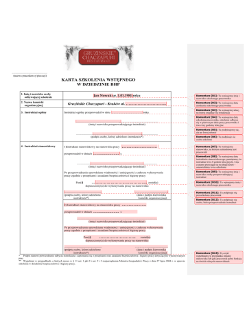 ................................................. (nazwa pracodawcy/pieczęć) KARTA SZKOLENIA WSTĘPNEGO W DZIEDZINIE BHP 1. Imię i nazwisko osoby odbywającej szkolenie 2. Nazwa komórki organizacyjnej 3. InstruktaŜ ogólny Jan Nowak ur. 1.01.1981 roku Gruzińskie Chaczapuri - Kraków ul. ………………………….. InstruktaŜ ogólny przeprowadził w dniu ………………………….. roku ............................................................,..................................................... (imię i nazwisko przeprowadzającego instruktaŜ) ................................................................................................................. (podpis osoby, której udzielono instruktaŜu*) 4. InstruktaŜ stanowiskowy 1)InstruktaŜ stanowiskowy na stanowisku pracy ………………………… przeprowadził w dniach …………………… r. ............................................................................................................... (imię i nazwisko przeprowadzającego instruktaŜ) Po przeprowadzeniu sprawdzianu wiadomości i umiejętności z zakresu wykonywania pracy zgodnie z przepisami i zasadami bezpieczeństwa i higieny pracy Pan(i) …………………………………….. został(a) dopuszczony(a) do wykonywania pracy na stanowisku .................................................... (podpis osoby, której udzielono instruktaŜu*) 2) InstruktaŜ stanowiskowy na stanowisku pracy …………….......................... (data i podpis kierownika komórki organizacyjnej) ………………… Komentarz [B1]: Tu wpisujemy imię i nazwisko szkolonego pracownika Komentarz [B2]: Tu wpisujemy datę urodzenia szkolonego pracownika Komentarz [B3]: Tu wpisujemy ulicę, na której znajduje się restauracja Komentarz [B4]: Tu wpisujemy datę szkolenia pracownika, szkolenie odbywa się w pierwszym dniu pracy pracownika i trwa trzy godziny lekcyjne Komentarz [B5]: Tu podpisujemy się, ale po lewej stronie Komentarz [B6]: Tu podpisuje się osoba szkolona Komentarz [B7]: Tu wpisujemy stanowisko, na którym zatrudniony jest pracownik Komentarz [B8]: Tu wpisujemy datę instruktaŜu stanowiskowego, pamiętamy, Ŝe instruktaŜ trwa 8 godzin lekcyjnych, więc czasami przeciąga się na drugi dzień – omawialiśmy to na szkoleniu Komentarz [B9]: Tu wpisujemy imię i nazwisko osoby przeprowadzającej instruktaŜ Komentarz [B10]: Tu wpisujemy imię i nazwisko szkolonego pracownika Komentarz [B11]: Tu podpisuje się przeszkolony pracownik Komentarz [B12]: Tu podpisuje się osoba, która przeprowadzała instruktaŜ przeprowadził w dniach …………………… r. ............................................................................................................... (imię i nazwisko przeprowadzającego instruktaŜ) Po przeprowadzeniu sprawdzianu wiadomości i umiejętności z zakresu wykonywania pracy zgodnie z przepisami i zasadami bezpieczeństwa i higieny pracy Pan(i) ……………………….. został(a) dopuszczony(a) do wykonywania pracy na stanowisku .................................................... (podpis osoby, której udzielono instruktaŜu*) …………….......................... (data i podpis kierownika komórki organizacyjnej) * Podpis stanowi potwierdzenie odbycia instruktaŜu i zapoznania się z przepisami oraz zasadami bezpieczeństwa i higieny pracy dotyczącymi wykonywanych prac. ** Wypełniać w przypadkach, o których mowa w § 11 ust. 1 pkt 2 i ust. 2 i 3 rozporządzenia Ministra Gospodarki i Pracy z dnia 27 lipca 2004 r. w sprawie szkolenia w dziedzinie bezpieczeństwa i higieny pracy. Komentarz [B13]: Tą część wypełniamy w przypadku zmiany stanowiska lub gdy pracownik pełni funkcję na dwóch róŜnych stanowiskach