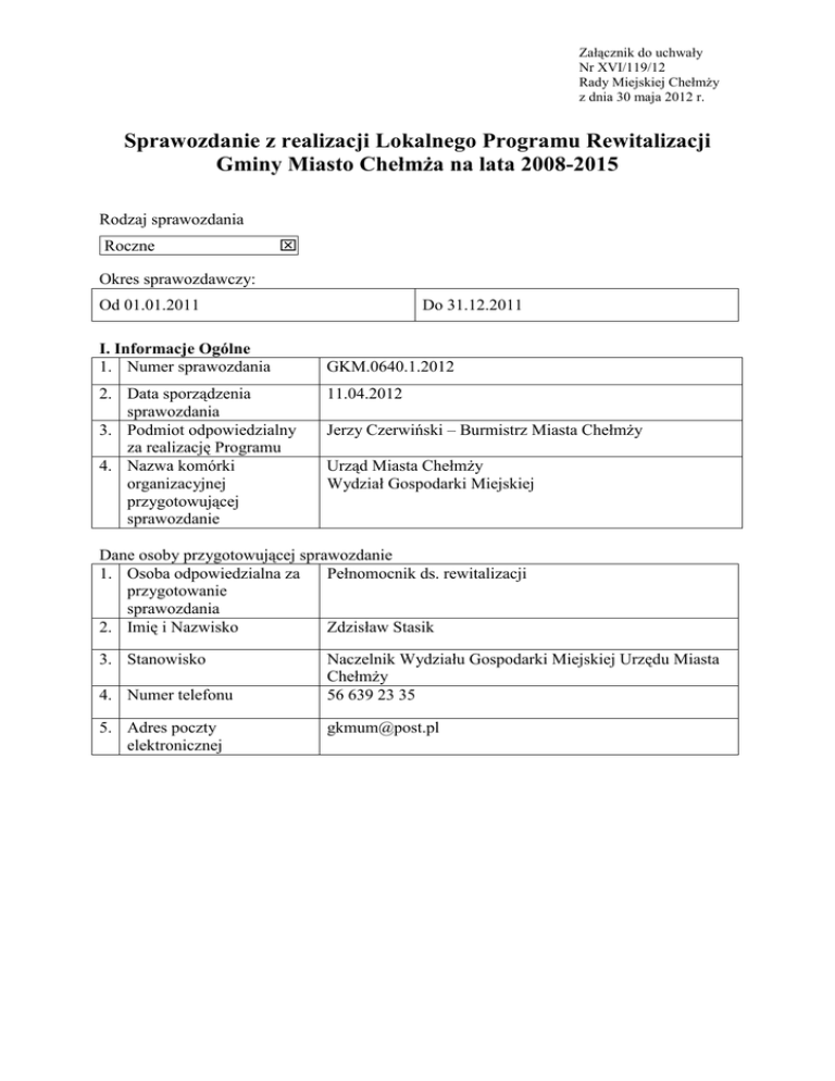 Załącznik do uchwały Nr XVI/119/12 Rady Miejskiej ChełmŜy z dnia 30 maja 2012 r. Sprawozdanie z realizacji Lokalnego Programu Rewitalizacji Gminy Miasto ChełmŜa na lata 2008-2015 Rodzaj sprawozdania Roczne Okres sprawozdawczy: Od 01.01.2011 I. Informacje Ogólne 1. Numer sprawozdania 2. Data sporządzenia sprawozdania 3. Podmiot odpowiedzialny za realizację Programu 4. Nazwa komórki organizacyjnej przygotowującej sprawozdanie Do 31.12.2011 GKM.0640.1.2012 11.04.2012 Jerzy Czerwiński – Burmistrz Miasta ChełmŜy Urząd Miasta ChełmŜy Wydział Gospodarki Miejskiej Dane osoby przygotowującej sprawozdanie 1. Osoba odpowiedzialna za Pełnomocnik ds. rewitalizacji przygotowanie sprawozdania 2. Imię i Nazwisko Zdzisław Stasik 3. Stanowisko 4. Numer telefonu 5. Adres poczty elektronicznej Naczelnik Wydziału Gospodarki Miejskiej Urzędu Miasta ChełmŜy 56 639 23 35 [email protected] II. Przebieg realizacji i postęp rzeczowy Programu 1. Lista projektów zgłoszonych do realizacji w ramach Programu w okresie sprawozdawczym Lp. Nazwa projektu Podmiot realizujący Okres realizacji Szacunkowy koszt 1. Rewitalizacja strefy śródmiejskiej ChełmŜy w części zlokalizowanej przy Jeziorze ChełmŜyńskim od ul. Tumskiej do ul. Toruńskiej – etap I Gmina Miasto ChełmŜa 2007-2011 6 000 000,00 PLN 2. Rewitalizacja strefy śródmiejskiej ChełmŜy w części zlokalizowanej przy Jeziorze ChełmŜyńskim od ul. Tumskiej do ul. Toruńskiej – etap II Gmina Miasto ChełmŜa 2011-2015 686 601,46 PLN 3. Budowa, przebudowa i rozbudowa infrastruktury terenów przy Jeziorze ChełmŜyńskim będących w granicach administracyjnych miasta, słuŜącej wypoczynkowi, turystyce i rekreacji: etap II – rewitalizacja strefy śródmiejskiej Gmina Miasto ChełmŜa 2011-2013 1 019 508,32 PLN Cel zadania Pobudzenie aktywności gospodarczej w strefie przyjeziornej poprzez stworzenie warunków do rozwoju gospodarczego w tej części miasta; Tworzenie sprzyjających warunków do podejmowania działalności przez indywidualne podmioty; Tworzenie środowiska przyjaznego mieszkańcom strefy śródmiejskiej oraz całego miasta poprzez stworzenie komfortowych warunków wypoczynku; Propagowanie aktywnych form spędzania wolnego czasu wśród młodzieŜy, poprzez stworzenie miejsc sprzyjających takiej formie wypoczynku. Strefa śródmiejska ChełmŜy przyjazna mieszkańcom i turystom, jako podstawa zrównowaŜonego rozwoju społeczno-gospodarczego miasta. 2 4. Budowa, przebudowa i rozbudowa infrastruktury terenów przy Jeziorze ChełmŜyńskim będących w granicach administracyjnych miasta, słuŜącej wypoczynkowi, turystyce i rekreacji: etap III – doposaŜenie skate parku Gmina Miasto ChełmŜa 2011 167 285,96 PLN Podniesienie atrakcyjności i funkcjonalności terenów rewitalizowanych połoŜonych w strefie przyjeziornej, w tym zapewnienie szerokiego dostępu do infrastruktury aktywnego wypoczynku w okolicach Bulwaru 1000-lecia. 5. Budowa, przebudowa i rozbudowa infrastruktury terenów przy Jeziorze ChełmŜyńskim będących w granicach administracyjnych miasta, słuŜącej wypoczynkowi, turystyce i rekreacji: etap I – rozbudowa infrastruktury wypoczynkowej Gmina Miasto ChełmŜa 2011-2013 4 153 777,45 PLN ZrównowaŜony rozwój infrastruktury słuŜącej wypoczynkowi oraz pobudzaniu turystyki opartej na endogenicznych cechach strefy przyjeziornej poprzez rozbudowę, rozwój i wielofunkcyjne wykorzystanie słuŜącej wypoczynkowi strefy śródmieścia zlokalizowanej przy Jeziorze ChełmŜyńskim. 6. Adaptacja pomieszczenia Świetlicy Miejskiej przy ul. Tumskiej na potrzeby Punktu Informacji Turystycznej Gmina Miasto ChełmŜa 2011-2012 50 000,00 PLN Rozwój usług związanych z obsługą ruchu turystycznego. 7. Remont, modernizacja, adaptacja nieruchomości na cele działalności kulturalnej i edukacyjnej Powiatowa i Miejska Biblioteka Publiczna im. J. Prejsa w ChełmŜy 2009-2011 670 000,00 PLN Wyrównywanie dostępu do dóbr i usług kultury poprzez modernizację obiektów o charakterze kulturalnym. 8. Modernizacja obiektów i terenu Klubu Sportowo-Turystycznego „Włókniarz” w ChełmŜy Klub SportowoTurystyczny „Włókniarz” 2008-2011 550 000,00 PLN Propagowanie aktywnych form spędzania wolnego czasu wśród młodzieŜy, poprzez stworzenie miejsc sprzyjających takiej formie wypoczynku. 3 2008-2012 1 897 094,01 PLN Podniesienie atrakcyjności gminy miasta ChełmŜy poprzez poprawę zagospodarowania gminy w infrastrukturę drogową i wyeksponowanie jej walorów endogenicznych. Powiatowa i Miejska Biblioteka Publiczna im. Juliana Prejsa w ChełmŜy 2011 171 288,00 PLN Stworzenie warunków sprzyjających umacnianiu nawyków czytelniczych wśród mieszkańców miasta oraz eliminowanie barier ograniczających dostęp do usług kultury. 11. Czytaj z nami – propagowanie Powiatowa czytelnictwa wśród dzieci i Miejska Biblioteka i młodzieŜy Publiczna im. Juliana Prejsa w ChełmŜy 2011 24 000,00 PLN Popularyzacja czytelnictwa wśród najmłodszych mieszkańców miasta gwarantująca prawidłowy rozwój intelektualny chełmŜyńskiej młodzieŜy. 12. Aktywizacja społeczno-zawodowa szansą na niezaleŜność Miejski Ośrodek Pomocy Społecznej w ChełmŜy 2011 226 454,23 PLN Przeciwdziałanie wykluczeniu społecznemu i aktywizacja zawodowa osób bezrobotnych korzystających z pomocy społecznej. 13. „Nie rezygnuj z marzeń” Stowarzyszenie Pomocy Rodzinie „WSPARCIE” w ChełmŜy 2011 10 000,00 PLN Poprawa jakości Ŝycia dzieci z rodzin zmarginalizowanych poprzez częściowe zaspokojenie ich potrzeb kulturalno-edukacyjnych. 9. Budowa dróg publicznych w ChełmŜy: etap I – budowa ul. Kościuszki w ChełmŜy na odcinku od Lecznicy Zwierząt do granicy miasta oraz etap II – Rewitalizacja strefy śródmiejskiej ChełmŜy w części zlokalizowanej przy Jeziorze ChełmŜyńskim od ul. Tumskiej do ul. Toruńskiej – etap III: modernizacja ul. Tumskiej 10. Modernizacja Biblioteki Gmina Mias