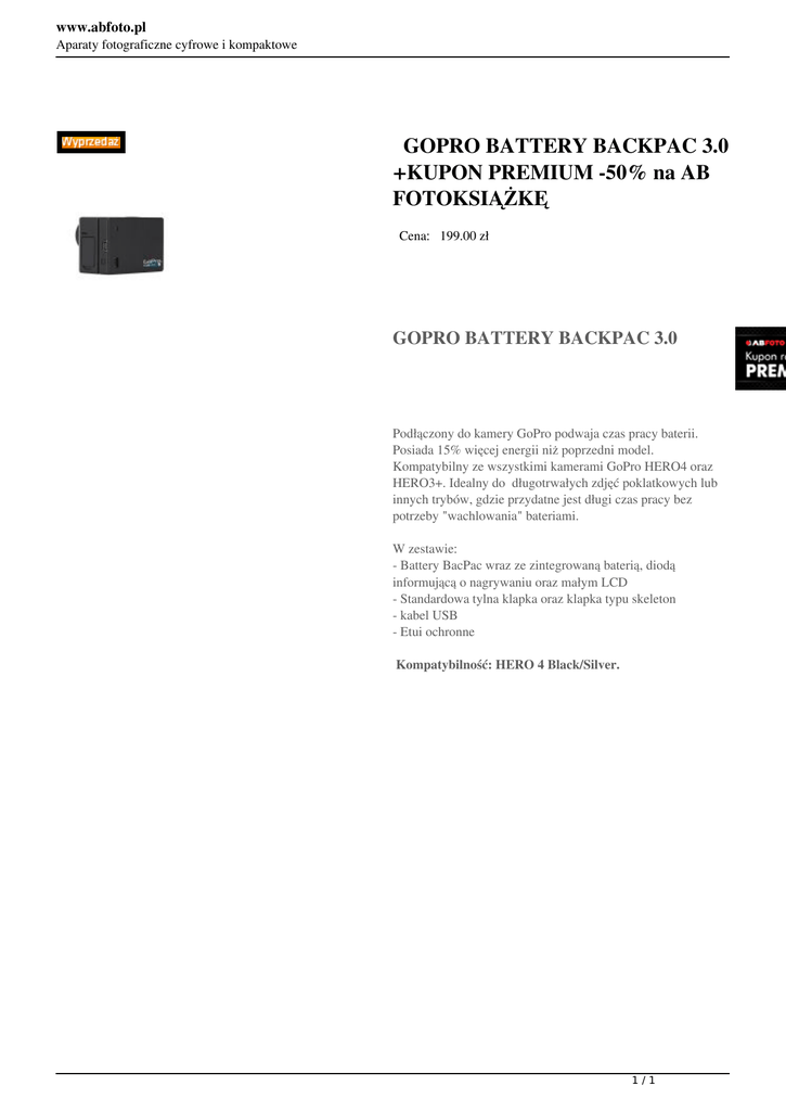 www.abfoto.pl Aparaty fotograficzne cyfrowe i kompaktowe GOPRO BATTERY BACKPAC 3.0 +KUPON PREMIUM -50% na AB FOTOKSIĄŻKĘ Cena: 199.00 zł GOPRO BATTERY BACKPAC 3.0 Podłączony do kamery GoPro podwaja czas pracy baterii. Posiada 15% więcej energii niż poprzedni model. Kompatybilny ze wszystkimi kamerami GoPro HERO4 oraz HERO3+. Idealny do długotrwałych zdjęć poklatkowych lub innych trybów, gdzie przydatne jest długi czas pracy bez potrzeby "wachlowania" bateriami. W zestawie: - Battery BacPac wraz ze zintegrowaną baterią, diodą informującą o nagrywaniu oraz małym LCD - Standardowa tylna klapka oraz klapka typu skeleton - kabel USB - Etui ochronne Kompatybilność: HERO 4 Black/Silver. 1/1 Powered by TCPDF (www.tcpdf.org)