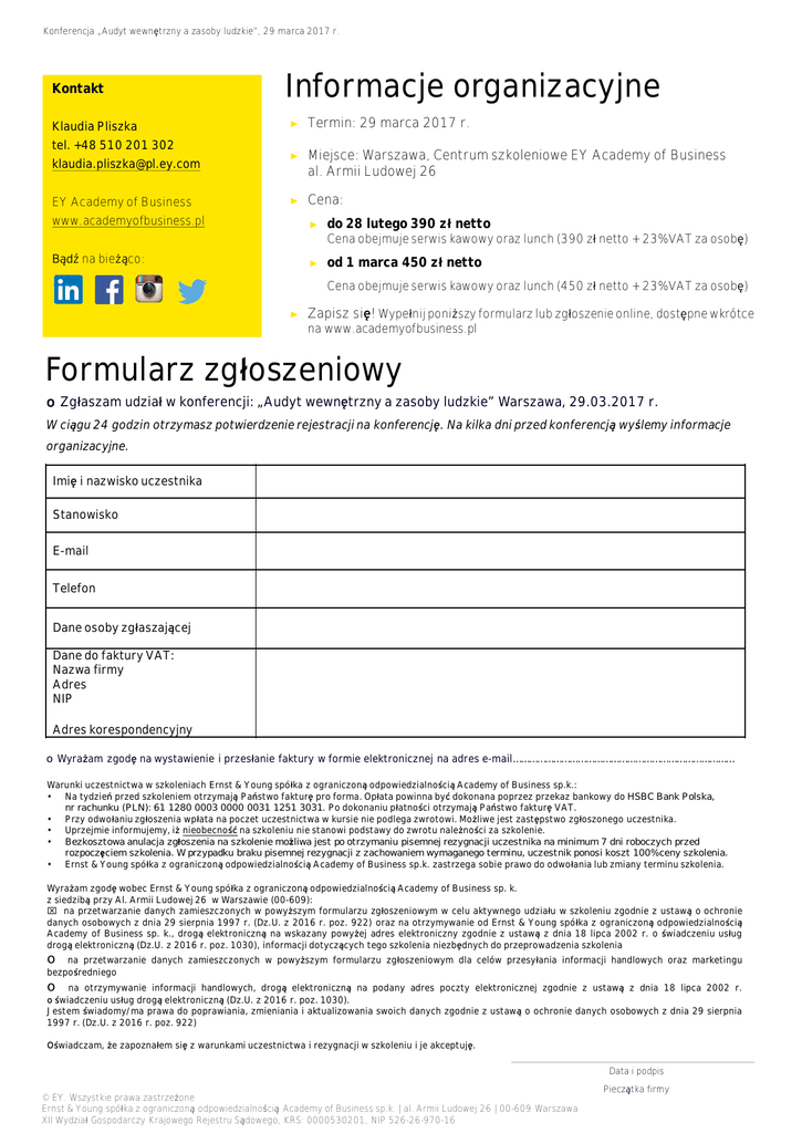 Konferencja „Audyt wewnętrzny a zasoby ludzkie”, 29 marca 2017 r. Kontakt Klaudia Pliszka tel. +48 510 201 302 [email protected] EY Academy of Business Informacje organizacyjne ► Termin: 29 marca 2017 r. ► Miejsce: Warszawa, Centrum szkoleniowe EY Academy of Business al. Armii Ludowej 26 ► Cena: www.academyofbusiness.pl ► do 28 lutego 390 zł netto Cena obejmuje serwis kawowy oraz lunch (390 zł netto + 23% VAT za osobę) Bądź na bieżąco: ► od 1 marca 450 zł netto Cena obejmuje serwis kawowy oraz lunch (450 zł netto + 23% VAT za osobę) ► Zapisz się! Wypełnij poniższy formularz lub zgłoszenie online, dostępne wkrótce na www.academyofbusiness.pl Formularz zgłoszeniowy o Zgłaszam udział w konferencji: „Audyt wewnętrzny a zasoby ludzkie” Warszawa, 29.03.2017 r. W ciągu 24 godzin otrzymasz potwierdzenie rejestracji na konferencję. Na kilka dni przed konferencją wyślemy informacje organizacyjne. Imię i nazwisko uczestnika Stanowisko E-mail Telefon Dane osoby zgłaszającej Dane do faktury VAT: Nazwa firmy Adres NIP Adres korespondencyjny o Wyrażam zgodę na wystawienie i przesłanie faktury w formie elektronicznej na adres e-mail……………………………………………………………………… Warunki uczestnictwa w szkoleniach Ernst & Young spółka z ograniczoną odpowiedzialnością Academy of Business sp.k.: • Na tydzień przed szkoleniem otrzymają Państwo fakturę pro forma. Opłata powinna być dokonana poprzez przekaz bankowy do HSBC Bank Polska, nr rachunku (PLN): 61 1280 0003 0000 0031 1251 3031. Po dokonaniu płatności otrzymają Państwo fakturę VAT. • Przy odwołaniu zgłoszenia wpłata na poczet uczestnictwa w kursie nie podlega zwrotowi. Możliwe jest zastępstwo zgłoszonego uczestnika. • Uprzejmie informujemy, iż nieobecność na szkoleniu nie stanowi podstawy do zwrotu należności za szkolenie. • Bezkosztowa anulacja zgłoszenia na szkolenie możliwa jest po otrzymaniu pisemnej rezygnacji uczestnika na minimum 7 dni roboczych przed rozpoczęciem szkolenia. W przypadku braku pisemnej rezygnacji z zachowaniem wymaganego terminu, uczestnik ponosi koszt 100% ceny szkolenia. • Ernst & Young spółka z ograniczoną odpowiedzialnością Academy of Business sp.k. zastrzega sobie prawo do odwołania lub zmiany terminu szkolenia. Wyrażam zgodę wobec Ernst & Young spółka z ograniczoną odpowiedzialnością Academy of Business sp. k. z siedzibą przy Al. Armii Ludowej 26 w Warszawie (00-609): x na przetwarzanie danych zamieszczonych w powyższym formularzu zgłoszeniowym w celu aktywnego udziału w szkoleniu zgodnie z ustawą o ochronie danych osobowych z dnia 29 sierpnia 1997 r. (Dz.U. z 2016 r. poz. 922) oraz na otrzymywanie od Ernst & Young spółka z ograniczoną odpowiedzialnością Academy of Business sp. k., drogą elektroniczną na wskazany powyżej adres elektroniczny zgodnie z ustawą z dnia 18 lipca 2002 r. o świadczeniu usług drogą elektroniczną (Dz.U. z 2016 r. poz. 1030), informacji dotyczących tego szkolenia niezbędnych do przeprowadzenia szkolenia o na przetwarzanie danych zamieszczonych w powyższym formularzu zgłoszeniowym dla celów przesyłania informacji handlowych oraz marketingu bezpośredniego o na otrzymywanie informacji handlowych, drogą elektroniczną na podany adres poczty elektronicznej zgodnie z ustawą z dnia 18 lipca 2002 r. o świadczeniu usług drogą elektroniczną (Dz.U. z 2016 r. poz. 1030). Jestem świadomy/ma prawa do poprawiania, zmieniania i aktualizowania swoich danych zgodnie z ustawą o ochronie danych osobowych z dnia 29 sierpnia 1997 r. (Dz.U. z 2016 r. poz. 922) Oświadczam, że zapoznałem się z warunkami uczestnictwa i rezygnacji w szkoleniu i je akceptuję. Data i podpis © EY. Wszystkie prawa zastrzeżone Ernst & Young spółka z ograniczoną odpowiedzialnością Academy of Business sp.k. | al. Armii Ludowej 26 | 00-609 Warszawa XII Wydział Gospodarczy Krajowego Rejestru Sądowego, KRS: 0000530201, NIP 526-26-970-16 Pieczątka firmy