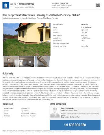 tel. (022) 763 96 00 email: [email protected] www: minsk.pln.com.pl Dom na sprzedaż Stanisławów Pierwszy Stanisławów Pierwszy - 240 m2 Lokalizacja: mazowieckie, legionowski, Stanisławów Pierwszy, Stanisławów Pierwszy numer oferty D-191-7 cena 610 000 PLN dom sprzedaż, metraż 240 m2 pow. działki 660 m2 zabudowa 1/2 bliźniaka rok budowy 2007 informacje dodatkowe materiał budynku ceramika Opis oferty Połówka bliźniaka 240m2 / 170m2 posadowiona na działce 660m2. Dom wybudowany jak dla siebie z materiałów o podwyższonej jakości. Rozkład pomieszczeń na parterze: Wiatrołap, holl z schodkami dębowymi, widna kuchnia otwarta na salon z przewidzianym kominkiem z rozprowadzeniem nawiewów na górną kondygnację. Z salonu wyjście na taras i ogród obsiany trawą. Ponad to znajduje się gabinet, łazienka z toaletą i garaż w bryle budynku stykający się z sąsiadem. W kuchni i łazience ogrzewanie podłogowe. Na górnej kondygnacji mamy na półpiętrze sypialnię znajdująca się bezpośrednio nad garażem, wyżej pokój kąpielowy i 3 sypialnie z balkonami holl i schowek. Budynek jest w przygotowany do odbioru technicznego. Cena raczej nie podlega negocjacjom, ale istnieje możliwość wykończenia pod klucz nieruchomości za dopłata w ramach negocjacji ceny. Okna w budynku PCV pięciokomorowe, ocieplenie dachu wełna mineralną ponad 25 cm stropy ocieplone styropianem 10cm. Dachówka cementowa, ogrodzenie od frontu drewniane deski i słupki klinkierowe, po bokach i na tyle jest siatka. Podjazd wyłożony kostka brukową. Media: woda miejska, gaz ziemny, kanalizacja - szambo. Dojazd do posesji wewnętrzną drogą gminną. Budynek usytuowany na podwyższonym terenie nieopodal Kanału Królewskiego. POLECAM I ZACHĘCAM DO OGLĄDANIA. Pośrednik prowadzący Teresa Kwiatkowska, nr licencji 4887 Lokalizacja Osoba kontaktowa Irena Dąbrowska województwo mazowieckie powiat legionowski [email protected] miasto Stanisławów Pierwszy dzielnica Stanisławów Pierwszy Chętnie udzielę dodatkowych informacji związanych z tą ofertą. Zapraszam do kontaktu! tel. 509 000 080 Zawsze dążymy do tego, aby informacje o proponowanych przez nas ofertach były jak najbardziej dokładne. Niekiedy jednak, ze względu na fakt, iż uzyskujemy je od osób trzecich nie jest możliwe ich zweryfikowanie, wobec czego należy traktować je orientacyjnie i nie stanowią one oferty w rozumieniu kodeksu cywilnego.