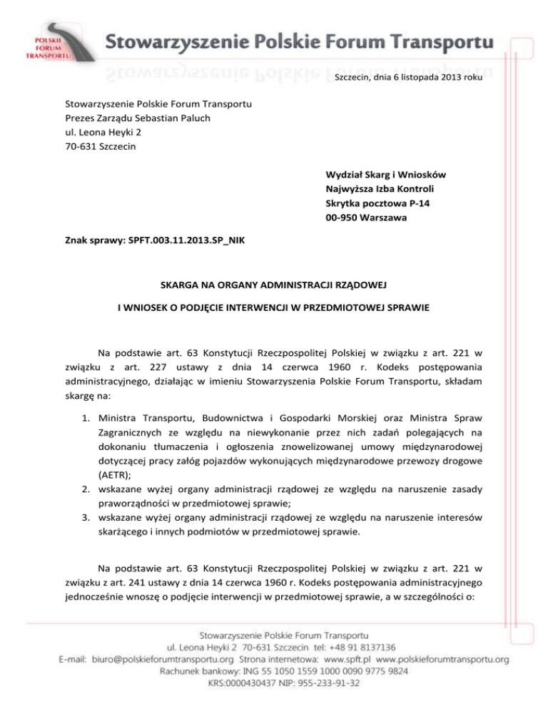 Szczecin, dnia 6 listopada 2013 roku Stowarzyszenie Polskie Forum Transportu Prezes Zarządu Sebastian Paluch ul. Leona Heyki 2 70-631 Szczecin Wydział Skarg i Wniosków Najwyższa Izba Kontroli Skrytka pocztowa P-14 00-950 Warszawa Znak sprawy: SPFT.003.11.2013.SP_NIK SKARGA NA ORGANY ADMINISTRACJI RZĄDOWEJ I WNIOSEK O PODJĘCIE INTERWENCJI W PRZEDMIOTOWEJ SPRAWIE Na podstawie art. 63 Konstytucji Rzeczpospolitej Polskiej w związku z art. 221 w związku z art. 227 ustawy z dnia 14 czerwca 1960 r. Kodeks postępowania administracyjnego, działając w imieniu Stowarzyszenia Polskie Forum Transportu, składam skargę na: 1. Ministra Transportu, Budownictwa i Gospodarki Morskiej oraz Ministra Spraw Zagranicznych ze względu na niewykonanie przez nich zadań polegających na dokonaniu tłumaczenia i ogłoszenia znowelizowanej umowy międzynarodowej dotyczącej pracy załóg pojazdów wykonujących międzynarodowe przewozy drogowe (AETR); 2. wskazane wyżej organy administracji rządowej ze względu na naruszenie zasady praworządności w przedmiotowej sprawie; 3. wskazane wyżej organy administracji rządowej ze względu na naruszenie interesów skarżącego i innych podmiotów w przedmiotowej sprawie. Na podstawie art. 63 Konstytucji Rzeczpospolitej Polskiej w związku z art. 221 w związku z art. 241 ustawy z dnia 14 czerwca 1960 r. Kodeks postępowania administracyjnego jednocześnie wnoszę o podjęcie interwencji w przedmiotowej sprawie, a w szczególności o: 1. przeprowadzenie kontroli działalności powyższych organów administracji rządowej; 2. usprawnienie organizacji powyższych organów administracji rządowej; 3. wzmocnienie praworządności poprzez wyeliminowanie obecnego stanu rzeczy. UZASADNIENIE Wskazuję, że umowa międzynarodowa dotycząca pracy załóg pojazdów wykonujących międzynarodowe przewozy drogowe (AETR) ratyfikowana przez Polskę stanowi jedno z najważniejszych źródeł prawa transportowego. Nowelizacja niniejszej umowy dokonana w 2010 r. wprowadziła natomiast istotne zmiany dotyczące czasu pracy kierowców, przerw i odpoczynku. Umowa AETR do czasu jej nowelizacji stanowiła w Polsce źródło powszechnie obowiązującego prawa w państwie zgodnie z art. 87 Konstytucji Rzeczpospolitej Polskiej i adresaci, znający jej treść, mogli bezpośrednio stosować regulacje w niej zawarte. W celu dostosowania przepisów prawnych do rozporządzenia (WE) nr 561/2006 Parlamentu Europejskiego i Rady z dnia 15 marca 2006 r. w sprawie harmonizacji przepisów odnoszących się do transportu drogowego zaistniała konieczność zmiany wskazanej umowy. W związku z tym Europejska Komisja Gospodarcza ONZ opublikowała ujednoliconą treść umowy AETR w językach angielskim, francuskim i rosyjskim. Warunkiem obowiązywania znowelizowanej umowy w Polsce było dokonanie oficjalnego tłumaczenia tekstu umowy oraz jej ogłoszenie w Dzienniku Ustaw Rzeczpospolitej Polskiej. Zgodnie z art. 6. ustawy z dnia 7 października 1999 r. o języku polskim (Dz.U. 1999 nr 90 poz. 999 z późn. zm.) umowy międzynarodowe zawierane przez Rzeczpospolitą Polską powinny mieć polską wersję językową, stanowiącą podstawę wykładni, chyba że przepisy szczególne stanowią inaczej. Ponadto na podstawie art. 18 ustawy z dnia 14 kwietnia 2000 r. o umowach międzynarodowych (Dz.U. 2000 nr 39 poz. 443 z późn. zm.) ratyfikowana umowa międzynarodowa wraz z dotyczącymi jej oświadczeniami rządowymi oraz umowa międzynarodowa, o ile stanowi umowę wykonawczą w stosunku do ratyfikowanej umowy międzynarodowej lub zmienia ratyfikowaną umowę międzynarodową, jest ogłaszana niezwłocznie wraz z dotyczącymi jej oświadczeniami rządowymi, a w przypadku konieczności dokonania tłumaczenia – również z tekstem tego tłumaczenia na język polski, w Dzienniku Ustaw Rzeczypospolitej Polskiej. Na podstawie art. 3 wymienionej ustawy z zastrzeżeniem przepisów ustawy, czynności w stosunkach międzynarodowych dotyczących zawierania umów międzynarodowych, związania Rzeczypospolitej Polskiej umowami oraz obowiązywania i wypowiadania umów międzynarodowych dokonuje minister właściwy do spraw zagranicznych. Natomiast zgodnie z art. 20 ust. 1 wskazanej ustawy minister kierujący działem administracji rządowej właściwy do spraw, których dotyczy umowa międzynarodowa jest odpowiedzialny m.in. za korzystanie z praw wynikających z umowy międzynarodowej. Przedmiotową kwestię reguluje także Rozporządzenie Rady Ministrów z dnia 28 sierpnia 2000 r. w sprawie wykonania niektórych przepisów ustawy o umowach międzynarodowych (Dz.U. z dnia 22 września 2000 r.). Zgodnie z paragrafem 11 wskazanego rozporządzenia ogłoszenie ratyfikowanej umowy międzynarodowej obejmuje m.in. zamieszczenie w Dzienniku Ustaw polskiego tekstu umowy międzynarodowej. Natomiast zgodnie z paragrafem 13 tegoż rozporządzenia minister kierujący działem administracji rządowej właściwy do spraw, których dotyczy umowa międzynarodowa, przekazuje, po podpisaniu umowy międzynarodowej, jej oryginał, a w przypadku umowy wielostronnej kopię uwierzytelnioną przez depozytariusza umowy międzynarodowej – ministrowi właściwemu do spraw zagranicznych. Na podstawie paragrafu 14 minister właściwy do spraw zagranicznych udostępnia informacje dotyczące umów międzynarodowych, których depozytariuszem jest strona polska, a także udostępnia teksty umów międzynarodowych wiążących Rzeczpospolitą Polską oraz informacje o stanie stosunków traktatowych Rzeczypospolitej Polskiej. Mając na uwadze powyższe przepisy prawne wskazuję, że do chwili obecnej nie przetłumaczono oraz nie opublikowano zmian umowy AETR ani też ujednoliconego tekstu tejże umowy mimo, że została ona znowelizowana 20 września 2010 r. Można zatem stwierdzić, że wbrew powszechnemu przekonaniu organów kontrolnych oraz wykonujących przewóz drogowy znowelizowana umowa międzynarodowa od kilku lat w Polsce nie obowiązuje. Um