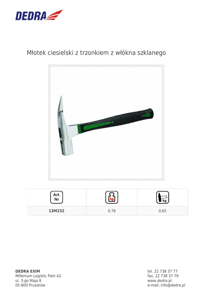 Młotek ciesielski z trzonkiem z włókna szklanego 13M232 DEDRA EXIM Millenium Logistic Park A2 ul. 3-go Maja 8 05-800 Pruszków 0,78 0,65 tel. 22 738 37 77 fax. 22 738 37 79 www.dedra.pl e-mail: [email protected]