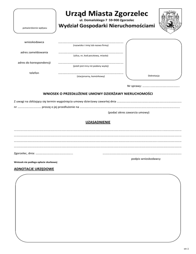 Urząd Miasta Zgorzelec ul. Domańskiego 7 59-900 Zgorzelec potwierdzenie wpływu wnioskodawca Wydział Gospodarki Nieruchomościami …………………………………………….……………………………. (nazwisko i imię lub nazwa firmy) adres zameldowania …………………………………………….…..………………………. (ulica, nr, kod pocztowy, miasto) adres do korespondencji ………………………………………………….………………………. (jeżeli jest inny niż podany wyżej) telefon ………………………………………………………..………………… (stacjonarny, komórkowy) Dekretacja Nr sprawy: ………..……………………………….. WNIOSEK O PRZEDŁUŻENIE UMOWY DZIERŻAWY NIERUCHOMOŚCI Z uwagi na zbliżający się termin wygaśnięcia umowy dzierżawy zawartej dnia ………………………………..………………………………..……… nr …………………………. proszę o jej przedłużenie na ………………………………………………………………………….……………………………………….. (podać okres zawarcia umowy) UZASADNIENIE ……………………………………………………………………………………………………………………………………………………………………………..…………………… …………………………………………………………………………………………………………………………………………………………………………..……………………… ………………………………………………………………………………………………………………………………………………………………………..………………………… ……………………………………………………………………………………………………………………………………………………………………..…………………………… Zgorzelec, dnia: ……………………….………………... ………………………………………………………………………………………….. podpis wnioskodawcy Wniosek nie podlega opłacie skarbowej ADNOTACJE URZĘDOWE str.1 POUCZENIE 1) Wydzierżawianie gruntu może odbywać się w drodze bezprzetargowej na wniosek osoby zainteresowanej dzierżawą, pod warunkiem, że inne osoby nie złożą wniosku o wydzierżawienie tego samego gruntu, 2) Zawieranie kolejnych umów na dzierżawę tej samej nieruchomości z dotychczasowym Dzierżawcą następuje zgodnie z obowiązującymi przepisami ustawy o gospodarce nieruchomościami. 3) Wydzierżawianie gruntu odbywa się w drodze przetargu, w przypadku złożenia kilku wniosków o wydzierżawienie tego samego gruntu lub przeznaczenia przez Burmistrza Miasta Zgorzelec gruntu stanowiącego własność Gminy Miejskiej Zgorzelec do przetargu. 4) Dzierżawca oprócz czynszu za dzierżawę płaci również podatek od nieruchomości lub podatek rolny. 5) Sprawa załatwiania w trybie cywilno-prawnym, nie obowiązują przepisy Kodeksu Postępowania Administracyjnego. Czas przygotowania nieruchomości do wydzierżawienia od momentu podjęcia pierwszych czynności do podpisania umowy dzierżawy – uzależniony jest od uzyskania niezbędnych opinii. str.2