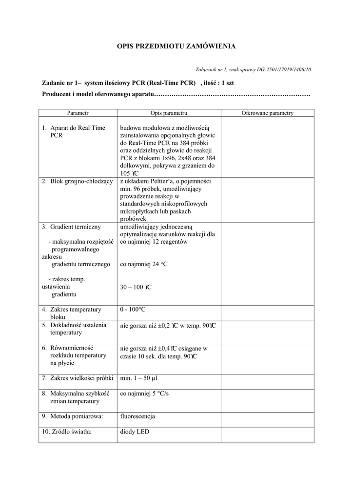 OPIS PRZEDMIOTU ZAMÓWIENIA Załącznik nr 1, znak sprawy DG-2501/17919/1406/10 Zadanie nr 1– system ilościowy PCR (Real-Time PCR) , ilość : 1 szt Producent i model oferowanego aparatu……………………………………………………………… Parametr Opis parametru 1. Aparat do Real Time PCR budowa modułowa z moŜliwością zainstalowania opcjonalnych głowic do Real-Time PCR na 384 próbki oraz oddzielnych głowic do reakcji PCR z blokami 1x96, 2x48 oraz 384 dołkowymi, pokrywa z grzaniem do 105 °C 2. Blok grzejno-chłodzący z układami Peltier’a, o pojemności min. 96 próbek, umoŜliwiający prowadzenie reakcji w standardowych niskoprofilowych mikropłytkach lub paskach probówek umoŜliwiający jednoczesną 3. Gradient termiczny optymalizację warunków reakcji dla - maksymalna rozpiętość co najmniej 12 reagentów programowalnego zakresu gradientu termicznego co najmniej 24 °C - zakres temp. ustawienia gradientu 30 – 100 °C 4. Zakres temperatury bloku 5. Dokładność ustalenia temperatury 0 - 100°C 6. Równomierność rozkładu temperatury na płycie nie gorsza niŜ ±0,4°C osiągane w czasie 10 sek. dla temp. 90°C 7. Zakres wielkości próbki min. 1 – 50 µl 8. Maksymalna szybkość zmian temperatury co najmniej 5 °C/s 9. Metoda pomiarowa: fluorescencja 10. Źródło światła: diody LED nie gorsza niŜ ±0,2 °C w temp. 90°C Oferowane parametry 11. Zakres spektralny światła wzbudzającego nie mniejszy niŜ 450 – 730 nm 12. Zakres stosowanych barwników SYBR GREEN, FAM, HEX, VIC, TET, Cal Gold 540, ROX, TEXAS RED, Cal Red 610, Cy5, Quasar 670, Quasar 705 Urządzenie musi być przygotowane (skalibrowane) fabrycznie do pracy z tymi barwnikami bez potrzeby przeprowadzenia kalibracji przez uŜytkownika urządzenie wyposaŜone w komplet filtrów światła wzbudzającego i emitowanego zainstalowanych dla kaŜdego z 5 kanałów. KaŜdy kanał pomiarowy musi być wyposaŜony w indywidualną diodę LED o długości światła optymalnej do barwników przypisanych do urządzenia. MoŜliwość oznaczania jednocześnie do 5 genów w jednej próbce. Dodatkowy kanał dostosowany do techniki FRET (wzbudzenie FAM, detekcja HEX) 13. Multipleks 5 kanałowy 14. Oprogramowanie Oprogramowanie musi zapewniać: akwizycję i obróbkę wyników, kilka trybów rejestracji danych w tym opcja szybkiego pomiaru dla pojedynczego kanału, moŜliwość programowania płytki doświadczalnej przed, w trakcie lub po zakończeniu pomiaru, analizę względnego stęŜenia DNA „gene expression” poprzez pomiar ∆CT lub ∆∆CT z wieloma genami referencyjnymi, moŜliwość jednoczesnej analizy ekspresji genów dla próbek pochodzących z róŜnych pomiarów, analizę z zaprogramowanym punktem końcowym pomiaru „end-point”, analizę alleli (dyskryminacja alleli), moŜliwość eksportu zapisanych wyników analiz do innych aplikacji (Microsoft Excel, Word, PowerPoint). Wymagane jest oprogramowanie do analizy krzywych topnienia wysokiej rozdzielczości (HRM) – licencja na co najmniej dwa stanowiska. 15. Stacja robocza 16. Gwarancja 17. Serwis 18. Instalacja i uruchomienie laptop dedykowany do aparatu lub komputer stacjonarny o min. parametrach: procesor dual core 2,5 GHz, 2GB RAM, dysk - 250GB, Windows 7, LCD minimalnie 17” o rozdz. 1280 × 1024. Podłączenie do komputera poprzez port USB 2.0 min. 2 lata od daty uruchomienia organizacja serwisowa działająca w Polsce, czas reakcji serwisu 48 h w okresie gwarancyjnym, wymagane świadczenie serwisu równieŜ po upływie okresu gwarancji na warunkach pogwarancyjnych. po instalacji i uruchomieniu urządzenia, przeprowadzenie szkolenia (min. 4 h). Instrukcja obsługi w języku polskim (min. 1 kopia) Zadanie nr 2- Bramka elektrostatyczna- ilość: szt. 1 Producent i model oferowanego aparatu…………………………………………………… Parametr Kompatybilność Usuwanie ładunków Brak wpływu na komorę waŜenia Wymiary elektrody prętów elektrody Wymiary U-bramki Temperatura pracy Wilgotność (zakres stosowalności) Napięcie wyjściowe Max prąd przebicia ZuŜycie prądu Ochrona Zasilanie Instalacja Opis wymagań dla parametru MoŜliwość ustawienia bramki przy dowolnej wadze analitycznej „+” i „-„ Brak generowania ruchów powietrza 14x16,5 mm 270x180 mm 5-45°C 20-65% RH 6,7 kV Ik<5mA 15 VA IP54 220-230V/50 Hz nie Gwarancja 24 m-ce Instrukcja W języku polskim Serwis Autoryzowany serwis na terenie Oferowane parametry Polski