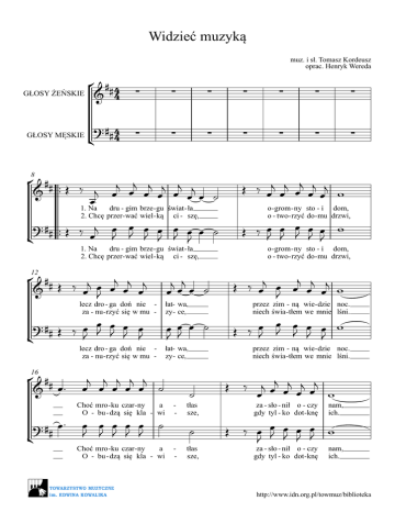 Widzieć muzyką GŁOSY ŻEŃSKIE GŁOSY MĘSKIE muz. i sł. Tomasz Kordeusz oprac. Henryk Wereda ° ## 4 & 4 ∑ ∑ ∑ ∑ ∑ ∑ ∑ ? ## 4 4 ¢ ∑ ∑ ∑ ∑ ∑ ∑ ∑ ° ## ™ & ™Œ ‰ j œ 8 j j j j j j œ œ œ œ œ œ œ ˙ Œ ‰ œj œj œj œj j w œ œ œ œ œ œ œ œ ˙ J J J J J J Œ ‰ œJ œJ œJ œJ œ w J 1. Na dru - gim brze - gu świat - ła 2. Chcę przer- wać wiel - ką ci - szę, ? ## ™™ Œ ‰ j œ ¢ o - grom - ny sto - i dom, o - two - rzyć do - mu drzwi, 1. Na dru - gim brze - gu świat - ła 2. Chcę przer- wać wiel - ką ci - szę, ° ## j j j j & Œ ‰ œ œJ œ œ œ 12 ° ## & œ™ 16 ¢ ? ## œ ™ j j œ œ œ ˙ j Œ ‰ œj œ œ œj œj w J œ œ œ ˙ J J œ œ Œ ‰ œJ J J œJ œJ w lecz dro - ga doń nie za - nu - rzyć się w mu - łat- wa, zy- ce, lecz dro - ga doń nie za - nu - rzyć się w mu - łat- wa, zy- ce, ? ## Œ ‰ œ œJ œJ œ œ J J J ¢ j j j j j œ œ œ œ œ ˙ Choć mro - ku czar - ny a O - bu - dzą się kla - wi œ œ œ œ œ J J J J J ˙ Choć mro - ku czar - ny a O - bu - dzą się kla - wi o - grom - ny sto - i dom, o - two - rzyć do - mu drzwi, - ˙ przez zim - ną wie- dzie noc. niech świa - tłem we mnie lśni. Œ tłas sze, ˙ - przez zim - ną wie- dzie noc. niech świa - tłem we mnie lśni. tłas sze, Œ ‰ j œj œj j œj œ œ w za - sło - nił o - czy gdy tyl - ko dot - knę nam, ich. za - sło - nił o - czy gdy tyl - ko dot - knę nam, ich. ‰ œ œJ œJ œ œJ w J J http://www.idn.org.pl/towmuz/biblioteka ° ## & w 2 20 ¢ 24 ¢ ? ## Ó œ œ œ J œœ œ j œœ œ ˙˙ ˙ œ œ J ˙ ser - ce dro - gę Moc - no wie - rzę ? ## w ° ## & Ó œœ œ j œœ œ œ œœ zna, w to, ser - ce dro - gę Moc - no wie - rzę j œj ˙ œ œ ˙ Ó ˙ ˙ w w w œ œ œ œ œJ œJ œJ œJ w w Wi - dzę mu - zy - ką, ™™ j œj œ œ œj œ j œ œ œ ˙ ‰ j j œj œ œ œ œ œ œ œJ œ œ œ ˙ J J J ‰ œ œ œJ J J przy so- bie blis- kich lu - dzi mam, Ó ™™ doj - dzie - my tam. że przyj - dzie świt. przy so- bie blis- kich lu - dzi mam, ° ## j j & œ œ™ Œ œj œj œ œ™ Œ œj œj ˙ ™ 29 po - zwa - lam po - zwa - lam 3 j j j w œ œ œ œ™ œ œ œ w w nu - tom prze - wod - ni - kom po - pro - wa - dzić rę - ce. Wi - dzę mu- zy - nu - tom prze - wod - ni - kom po - pro - wa - dzić rę - ce. Wi - dzę mu - zy - ? ## œ œ ™ Œ œ œ œ œ ™ Œ œ œ ˙™ J ¢ J J J J J ° ## ˙ ™™ & b˙˙ ™ 34 ˙™ ? ## ˙™ ką ¢ j j œ œj œ œœ œœ œœ doj - dzie - my tam. że przyj - dzie świt. zna, w to, Wi - dzę mu - zy - ką, œ œ œJ J j œ œœ ką j j ‰ œj œ œj œ œ œ ˙ ‰ œJ ˙ zu - peł - nie in - ny œ œ œ œ œ J J J zu - peł - nie in - ny 38 j j ° ## œ œ œj œj & ˙ œœ œœ œ œ œ œ z ko - lo - rów tę ? ## ˙ œ œ œ œ œJ œJ œJ œJ ¢ z ko - lo - rów tę świat, - - świat, œ œ œ œ™ œ 3œ œ w w J J J j j œj j œ œ œ ˙ świat pe - łen barw, œ œ œJ œ ˙ J J J świat pe - łen barw, j j œj j œ œ œ co dla nas ma œ œ œJ œ J J J co dla nas ma jj œœ œ ˙ œœ œœ œœ ˙˙ ∑ ∑ ∑ ∑ ∑ ∑ œœ œ ˙ œJ œJ œ ˙ ∑ ∑ ∑ ∑ ∑ ∑ czę. czę. http://www.idn.org.pl/towmuz/biblioteka ° ## & 3 46 ∑ Œ ‰ j œj œj œj j œj j œ œ œ ˙ œ Ze świa - ta jas - nej stro - ny ¢ ? ## ∑ Œ ‰ œj œJ œJ œJ œ œJ œ œ ˙ J J Ze świa - ta jas - nej stro - ny Œ ‰ œj œj œj œj j œ w Œ ‰ œJ œJ œJ œJ œ J w prze - bi - ja się przez mgłę prze - bi - ja się przez mgłę ° ## j j j j j j & Œ ‰ œ œJ œ œ œ œ œ œ ˙ j Œ ‰ œj œ œ œj œj w J ? ## Œ ‰ œ œJ œJ œ œ œ œ œ ˙ J J J J J ¢ œ œ œ œ œ Œ ‰ J J J J J 51 ten nie - ga - sną - cy pro - myk, ten nie - ga - sną - cy pro - myk, ° ## j j j j j œ™ œ œ œ œ œ ˙ & 55 ˙ ? ## œ ™ œJ œJ œJ œJ œJ ˙ ¢ ko - li - brem wpa - da w dło - nie, ˙ 60 Śpie - wam ra - zem z nim, ? ## œ œ œ œ œ J ¢ J ˙ Śpie - wam ra - zem z nim, ° ## & Ó 65 j j œ œ œ przy so - bie ¢ ? ## Ó œ œ œ J J przy so - bie ˙˙ ˙ j œ œœ j œ œœ Œ ‰ œ œJ œJ œ œJ w J J w w w w Ó œ œ œ œ œJ œJ œJ œJ w w Ó że war- to żyć. że war- to żyć. j j œ œ œ œ œ ˙ œ œ œ œ œ ˙ J J blis - kich lu - dzi mieć, zszedł, w j œ œœ blis - kich lu - dzi mieć, w Œ ‰ j œj œj œj œj œ w na- dzie - i da - je j œœ œ zszedł, co z pię - cio - li - nii na- dzie - i da - je ko - li - brem wpa - da w dło - nie, j ° ## j & œœœ œœœ œœ œœ œœ œ œ œ co z pię - cio - li - nii pić. pić. j j ˙ œ œ œ ˙ Wi - dzieć mu - zy - ką, œ œ œJ J ˙ ‰ j j œj œj œ™ œ œ Œ ˙ Wi - dzieć mu - zy - ką, ‰ œ œ œJ œJ œ ™ J J po - zwo - lić po - zwo - lić nu - tom nu - tom j j œ œ prze - wod- Œ œ œ J J prze - wod- http://www.idn.org.pl/towmuz/biblioteka ° ## j & œ œ™ Œ œj œj ˙ ™ 4 j j œ œ 69 ni - kom po - pro - wa ? ## œ œ ™ Œ œ œ J ¢ J J ni - kom - dzić rę œ œ J J ˙™ po - pro - wa - dzić rę ° ## & œ j œ œ j œ œj ˙ ? ## œ œ œ J œ œ J J ˙ 74 dzie - ją ¢ dzie - ją ° ## & ˙ j œ œœ j œ œœ z ko - lo - rów tę œ œ œ œ œJ œJ œJ œJ ? ## ˙ z ko - lo - rów tę ° ## & 81 ¢ j œ œœ Ø CODA ? ## ∑ Ó - Ó œ œ™ œ 3œ œ J w w ce. - Wi - dzieć mu - zy ce. Wi - dzieć mu - zy j œj œj j œ œ ˙ œ œ œJ œ J J J ˙ b˙˙˙ ™™™ ‰ œj ˙™ ˙™ - ką, - z na- ‰ œJ ką, z na- j œj œj j œ œ co dla nas co dla nas j œ œ œœ œœ ˙ ˙˙ ∑ ∑ œ œ œ œJ œJ œ ˙ ˙ ∑ ∑ j œ œœ - - czę. ma œ œ œJ œ J J J dzień pe - łen barw, ma czę. j j ˙ œ œ œ Wi - dzieć mu - zy ∑ w w w 3 dzień pe - łen barw, wi - tać dzień, j œ œœ 77 ¢ wi - tać dzień, j œ œ™ œ œ œ œ œ œJ J - ˙ Wi - dzieć mu - zy ˙ ką ˙ - ką ˙˙ tę ˙ ˙ tę - - ˙˙ w w czy blask. ˙ ˙ w w czy blask. http://www.idn.org.pl/towmuz/biblioteka