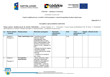 „Przedszkole równych szans” Projekt współfinansowany ze środków Unii Europejskiej w ramach Europejskiego Funduszu Społecznego Załącznik Nr 1 Szczegółowy opis przedmiotu zamówienia Zakup pomocy dydaktycznych do metody Daltońskiej, w ramach Zadania nr 1 : Utworzenie 2 nowych grup przedszkolnych dla 48 dzieci w Przedszkolu Samorządowym w Ujeździe i Osiedlu Niewiadów w ramach projektu „ Przedszkole równych szans”. Lp. Numer zadania i pozycja Rodzaj zakupu Minimalne wymagania 1 Zadanie 1 Pozycja 12 Zegar organizujący czas - pozwala zrozumieć dzieciom długość upływającego czasu podzielony jest na cztery kolory odpowiadające: żółty 30 minut, czerwony 5 min., zielony 10 min., niebieski 15 min. - posiada mechanizm zegara i specjalną strzałkę - tarcza wykonana ze sklejki wiórowej Parametry oferowanych pomocy Ilość Cena Stawka Wartość brutto jednostkowa VAT brutto 2 szt. - średnica nie mniejsza niż: 22cm 2 Zadanie 1 Pozycja 12 Dni tygodnia – przesuwanka - listwa wykonana z płyty wiórowej z kolorowymi kwiatkami oznaczającymi kolejne dni tygodnia: poniedziałek – czerwony , wtorek – niebieski, środa – pomarańczowy, czwartek – 2 szt. GMINA UJAZD REALIZATOR PROJEKTU BIURO PROJEKTU Urząd Gminy Ujazd Plac Kościuszki 6 97-225 Ujazd tel. 044 7192129 w. 31 [email protected] „Przedszkole równych szans” Projekt współfinansowany ze środków Unii Europejskiej w ramach Europejskiego Funduszu Społecznego 3 Zadanie 1 Pozycja 12 Dni tygodnia 4 Zadanie 1 Sygnalizator Pozycja 12 5 Zadanie 1 Obowiązki – obrazki zielony, piątek – żółty - listwa posiada prowadnicę, po której swobodnie porusza się zamontowana na listwie strzałka - wymiary listwy: nie ,mniejsze niż: 49 x 14 cm - 7 elementów kwadratowych z magnesem wykonane ze sklejki z kolorowymi kwiatkami - kwiatki w kolorze: poniedziałek – czerwony , wtorek – niebieski, środa – pomarańczowy, czwartek – zielony, piątek – żółty, sobota – fioletowy, niedziela różowy - wym. każdego elementu nie mniejsze niż: 8x8cm - kształt prostokąta o wym. długość nie mniejsza niż 45cm, szerokość nie mniejsza niż 14cm wykonany z lakierowanej sklejki, posiada podstawę, trzy koła w kolorze: czerwonym, żółtym i zielonym, biała obręcz o średnicy kolorowych kół - co najmniej 15 tabliczek z magnesem przedstawiające 2 kpl 2 szt. 2 szt. GMINA UJAZD REALIZATOR PROJEKTU BIURO PROJEKTU Urząd Gminy Ujazd Plac Kościuszki 6 97-225 Ujazd tel. 044 7192129 w. 31 [email protected] „Przedszkole równych szans” Projekt współfinansowany ze środków Unii Europejskiej w ramach Europejskiego Funduszu Społecznego Pozycja 12 6 Zadanie 1 Pozycja 12 Plan dnia - obrazki 7 Zadanie 1 Zadania – obrazki Pozycja 12 obowiązki jakie dzieci wykonują w przedszkolu - wymiary tabliczek nie mniejsze niż: 8 x 8 cm - wykonane z e sklejki - co najmniej 24 tabliczki z magnesem przedstawiające poszczególne elementy rozkładu dnia w przedszkolu - wykonane ze sklejki - wymiary: 8 x 8cm - magnesem przedstawiające co najmniej 18 tabliczek z poszczególne zadania do wykonania przez dziec - wykonane ze sklejki 2 szt. 2 szt. - wymiary: 8 x 8cm 8 Zadanie 1 Magnetyczne krążki Pozycja 12 - kolorowe magnetyczne krążki odpowiadające barwom poszczególnych dni tygodnia, wykonane ze sklejki 10 kpl - wymiary: średnia nie większa niż 2,5cm- co najmniej 25 szt. w komplecie 9 Zadanie 1 Pozycja 12 Tygodniowa tablica zadań - biała tablica magnetyczna z zaokrąglonymi rogami podzielona 25 poziomymi liniami i 8 liniami pionowymi, w górnej części wydzielone miejsca na tabliczki z 2 szt. GMINA UJAZD REALIZATOR PROJEKTU BIURO PROJEKTU Urząd Gminy Ujazd Plac Kościuszki 6 97-225 Ujazd tel. 044 7192129 w. 31 [email protected] „Przedszkole równych szans” Projekt współfinansowany ze środków Unii Europejskiej w ramach Europejskiego Funduszu Społecznego zadaniami z prawej strony tablicy wydzielone miejsca na kolorowe krążki - wymiary nie mniejsze niż: 80 x 100cm 10 Zadanie 1 Pozycja 12 Tablica planu dnia 11 Zadanie 1 Breloczki przezroczyste - wykonany z przezroczystego tworzywa sztucznego do wkładania zdjęć dzieci - w komplecie 10 szt. Pozycja 12 - biała tablica magnetyczna z zaokrąglonymi rogami w kształcie prostokątawymiary: nie mniejsze niż: 24 x 100cm 2 szt. 2 szt. OGÓŁEM : GMINA UJAZD REALIZATOR PROJEKTU BIURO PROJEKTU Urząd Gminy Ujazd Plac Kościuszki 6 97-225 Ujazd tel. 044 7192129 w. 31 [email protected]