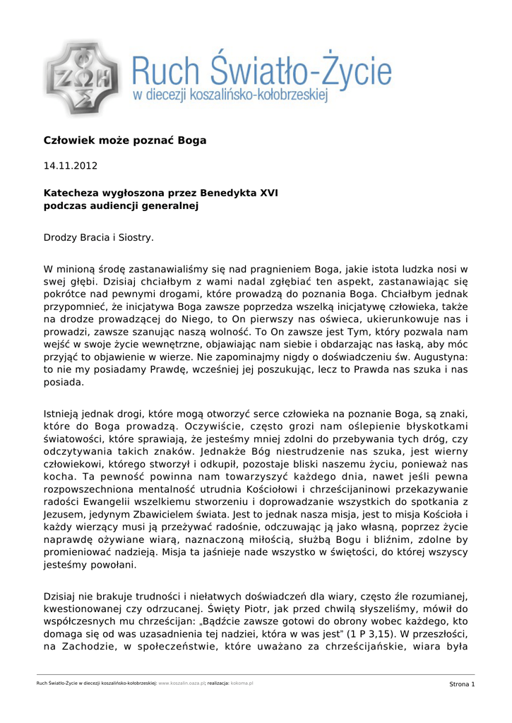 Człowiek może poznać Boga 14.11.2012 Katecheza wygłoszona przez Benedykta XVI podczas audiencji generalnej Drodzy Bracia i Siostry. W minioną środę zastanawialiśmy się nad pragnieniem Boga, jakie istota ludzka nosi w swej głębi. Dzisiaj chciałbym z wami nadal zgłębiać ten aspekt, zastanawiając się pokrótce nad pewnymi drogami, które prowadzą do poznania Boga. Chciałbym jednak przypomnieć, że inicjatywa Boga zawsze poprzedza wszelką inicjatywę człowieka, także na drodze prowadzącej do Niego, to On pierwszy nas oświeca, ukierunkowuje nas i prowadzi, zawsze szanując naszą wolność. To On zawsze jest Tym, który pozwala nam wejść w swoje życie wewnętrzne, objawiając nam siebie i obdarzając nas łaską, aby móc przyjąć to objawienie w wierze. Nie zapominajmy nigdy o doświadczeniu św. Augustyna: to nie my posiadamy Prawdę, wcześniej jej poszukując, lecz to Prawda nas szuka i nas posiada. Istnieją jednak drogi, które mogą otworzyć serce człowieka na poznanie Boga, są znaki, które do Boga prowadzą. Oczywiście, często grozi nam oślepienie błyskotkami światowości, które sprawiają, że jesteśmy mniej zdolni do przebywania tych dróg, czy odczytywania takich znaków. Jednakże Bóg niestrudzenie nas szuka, jest wierny człowiekowi, którego stworzył i odkupił, pozostaje bliski naszemu życiu, ponieważ nas kocha. Ta pewność powinna nam towarzyszyć każdego dnia, nawet jeśli pewna rozpowszechniona mentalność utrudnia Kościołowi i chrześcijaninowi przekazywanie radości Ewangelii wszelkiemu stworzeniu i doprowadzanie wszystkich do spotkania z Jezusem, jedynym Zbawicielem świata. Jest to jednak nasza misja, jest to misja Kościoła i każdy wierzący musi ją przeżywać radośnie, odczuwając ją jako własną, poprzez życie naprawdę ożywiane wiarą, naznaczoną miłością, służbą Bogu i bliźnim, zdolne by promieniować nadzieją. Misja ta jaśnieje nade wszystko w świętości, do której wszyscy jesteśmy powołani. Dzisiaj nie brakuje trudności i niełatwych doświadczeń dla wiary, często źle rozumianej, kwestionowanej czy odrzucanej. Święty Piotr, jak przed chwilą słyszeliśmy, mówił do współczesnych mu chrześcijan: „Bądźcie zawsze gotowi do obrony wobec każdego, kto domaga się od was uzasadnienia tej nadziei, która w was jest” (1 P 3,15). W przeszłości, na Zachodzie, w społeczeństwie, które uważano za chrześcijańskie, wiara była Ruch Światło-Życie w diecezji koszalińsko-kołobrzeskiej: www.koszalin.oaza.pl; realizacja: kokoma.pl Strona 1 środowiskiem, w którym się żyło. Odniesienie do Boga i posłuszeństwo Bogu były dla większości ludzi częścią życia powszedniego. To raczej ten, kto nie wierzył musiał uzasadnić swoje niedowiarstwo. W naszym świecie, sytuacja się zmieniła i coraz bardziej człowiek wierzący musi być zdolny do uzasadnienia swej wiary. Błogosławiony Jan Paweł II w swej encyklice „Fides et ratio” podkreślał, że wiara jest wystawiona na próbę także w epoce współczesnej, przenikniętej subtelnymi i podstępnymi formami ateizmu teoretycznego i praktycznego (por. nn. 46-47). Od czasów Oświecenia nasiliła się krytyka religii. Historia odnotowała również obecność systemów ateistycznych, w których Boga uważano jedynie za projekcję ludzkiego umysłu, jakąś iluzję i wytwór społeczeństwa zniekształconego i tak już licznymi alienacjami. Ponadto miniony wiek zaznał silnego procesu laicyzacji, pod hasłem absolutnej autonomii człowieka, uważanego za miarę i twórcę rzeczywistości, ale pozbawionego prawdy o tym, że jest stworzeniem „na obraz i podobieństwo Boga”. W naszych czasach pojawiło się zjawisko szczególnie niebezpieczne dla wiary: istnieje forma ateizmu, który określamy mianem „praktycznego”. Nie zaprzecza on prawdom wiary czy obrzędom religijnym, ale uważa je po prostu za nieistotne dla życia codziennego, oderwane od życia, bezużyteczne. Często więc wierzy się w Boga w sposób powierzchowny, ale żyje się tak, „jak gdyby Bóg nie istniał” (etsi Deus non daretur). W ostateczności jednak ten sposób życia okazuje się jeszcze bardziej destrukcyjny, bo prowadzi do obojętność wobec wiary i kwestii Boga. W istocie człowiek oddzielony od Boga sprowadzony jest jedynie do wymiaru horyzontalnego i właśnie ten redukcjonizm jest jedną z podstawowych przyczyn totalitaryzmów, które miały tragiczne konsekwencje w ubiegłym wieku, a także kryzysu wartości, jaki widzimy dzisiaj. Przysłaniając odniesienie do Boga przysłonięto także horyzont etyczny, zostawiając miejsce dla relatywizmu i dwuznacznej koncepcji wolności, która zamiast wyzwalać, prowadzi do skrępowania człowieka przez bożki. Pokusy, jakimi Jezus stawił czoło na pustyni, zanim rozpoczął swoją misję publiczną dobrze ukazują jakie „bożki” fascynują człowieka, kiedy nie wykracza poza samego siebie. Jeśli Bóg traci miejsce centralne, to człowiek traci właściwe mu miejsce, nie odnajduje już swego umiejscowienia w rzeczywistości stworzonej, w relacjach z innymi. Nie przeminęło to, co starożytna mądrość przywoływała w micie o Prometeuszu: człowiek myśli, że może sam stać się „bogiem”, panem życia i śmierci. W obliczu takiej sytuacji Kościół, wierny poleceniu Chrystusa, nigdy nie przestaje głosić prawdy o człowieku i jego przeznaczeniu. Sobór Watykański II zwięźle stwierdza: „ Szczególny charakter godności ludzkiej polega na powołaniu człowieka do łączności z Bogiem. Człowiek jest zaproszony jest do rozmowy z Bogiem już od chwili narodzin: istnieje on bowiem tylko dlatego, że stworzony przez Boga z miłości jest zawsze z miłości zachowywany, i nie żyje w pełnej zgodności z prawdą, jeżeli w sposób wolny nie uzna tej miłości i nie odda się Stworzycielowi” (Konstytucja „Gaudium et spes”, 19). Do dania jakich odpowiedzi, ze „słodyczą i sza