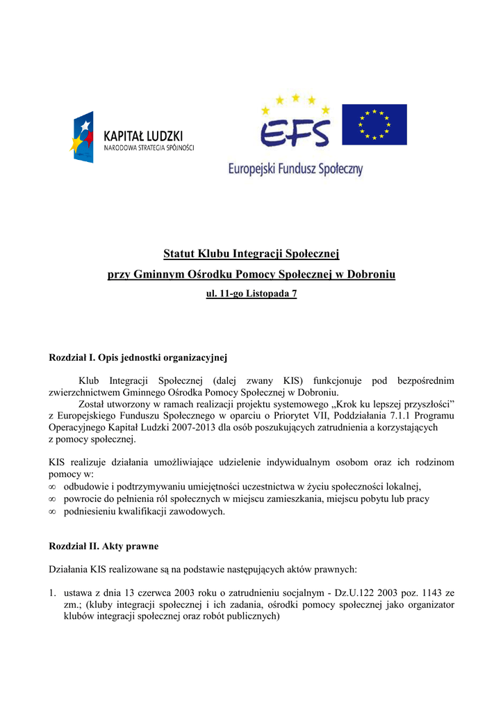 Statut Klubu Integracji Społecznej przy Gminnym Ośrodku Pomocy Społecznej w Dobroniu ul. 11-go Listopada 7 Rozdział I. Opis jednostki organizacyjnej Klub Integracji Społecznej (dalej zwany KIS) funkcjonuje pod bezpośrednim zwierzchnictwem Gminnego Ośrodka Pomocy Społecznej w Dobroniu. Został utworzony w ramach realizacji projektu systemowego „Krok ku lepszej przyszłości” z Europejskiego Funduszu Społecznego w oparciu o Priorytet VII, Poddziałania 7.1.1 Programu Operacyjnego Kapitał Ludzki 2007-2013 dla osób poszukujących zatrudnienia a korzystających z pomocy społecznej. KIS realizuje działania umoŜliwiające udzielenie indywidualnym osobom oraz ich rodzinom pomocy w: • odbudowie i podtrzymywaniu umiejętności uczestnictwa w Ŝyciu społeczności lokalnej, • powrocie do pełnienia ról społecznych w miejscu zamieszkania, miejscu pobytu lub pracy • podniesieniu kwalifikacji zawodowych. Rozdział II. Akty prawne Działania KIS realizowane są na podstawie następujących aktów prawnych: 1. ustawa z dnia 13 czerwca 2003 roku o zatrudnieniu socjalnym - Dz.U.122 2003 poz. 1143 ze zm.; (kluby integracji społecznej i ich zadania, ośrodki pomocy społecznej jako organizator klubów integracji społecznej oraz robót publicznych) 2. ustawa z dnia 12 marca 2004 roku o pomocy społecznej - Dz.U.64 2004, poz. 593, ze zmianami (m.in. strategia rozwiązywania problemów społecznych, tworzenie ośrodków wsparcia, kontrakt, rozwijanie nowych form pomocy społecznej i samopomocy) 3. ustawa z dnia 20 kwietnia 2004 Dz. U.Nr99,poz.1001 ze zm. / o promocji zatrudnienia i instytucjach rynku pracy (partnerstwo, aktywizacja społeczna i zawodowa) 4. ustawa z dnia 26 października 1982 roku o wychowaniu w trzeźwości i przeciwdziałaniu alkoholizmowi - Dz.U.147 2002 poz. 1231 ze zm. (m.in. finansowanie zadań związanych z przeciwdziałaniem lub likwidacją skutków naduŜywania alkoholu) 5. ustawa z dnia 24 kwietnia 2003 roku o działalności poŜytku publicznego i o wolontariacie - Dz.U.96 2003 poz. 873 ze zm. (wolontariat) Podstawa prawna procedury tworzenia KIS - art. 18 ust.1 ustawy o zatrudnieniu socjalnym: ,,Gmina, ośrodek pomocy społecznej lub organizacja pozarządowa prowadzące reintegrację społeczną i zawodową dla osób, o których mowa w art. 1, mogą: prowadzić kluby integracji społecznej organizujące działania o charakterze terapeutycznym, zatrudnieniowym i samopomocowym”. Ośrodek Pomocy Społecznej art. 15 pkt. 6 ustawy o pomocy społecznej wskazuje: ,,na rozwijanie nowych form pomocy społecznej i samopomocy w ramach zidentyfikowanych potrzeb”. Rozdział III. Działalność KIS Zakres działalności KIS obejmuje współpracę z Gminnym Ośrodkiem Pomocy Społecznej w Dobroniu, Urzędem Gminy Dobroń, PUP w Pabianicach, Punktem Wsparcia Interwencyjno – Kryzysowego, Zespołem Szkół im. Jana Długosza w Dobroniu oraz organizacjami pozarządowymi w ramach których realizowane są: 1. − − − − Działania terapeutyczne w tym: udzielanie wsparcia psychologicznego, prowadzenie terapii indywidualnej i rodzinnej zwłaszcza osobom z uzaleŜnieniem, kierowanie do właściwych zakładów lecznictwa, opieki zdrowotnej 2. − − − − Działania edukacyjno-pomocowe w tym; organizowanie kursów i szkoleń w zakresie: przygotowania zawodowego, autoprezentacji, podstaw prawa pracy, tworzenia firm 3. Poradnictwo prawno-administracyjne w tym; − pomoc oraz porady w zakresie sporządzania i kierowania pism, wniosków, itp., − moŜliwość korzystania z rozwiązań ustawowych w zakresie ustaw, na których bazuje Gminny Ośrodek Pomocy Społecznej w Dobroniu − pomoc w rozwiązywaniu problemów socjalnych, mieszkaniowych − przygotowanie uczestników do podjęcia zatrudnienia wspierającego − opracowywanie indywidualnych programów zatrudnienia socjalnego dla uczestników zajęć w KIS. Katalog grup osób, które mogą uczestniczyć w KIS nie jest zamknięty. Oznacza to, Ŝe moŜe być rozszerzony o inne kategorie potencjalnych odbiorców. KIS nie musi skupiać wszystkich grup wskazanych w ustawie o zatrudnieniu socjalnym. Rozdział IV. Cele główne i szczegółowe 1. Cel ogólny: − reintegracja społeczna i zawodowa mieszkańców gminy Dobroń korzystających z pomocy społecznej, zagroŜonych wykluczeniem społecznym 2. Cele szczegółowe: − pomoc w zapewnieniu uczestnikom KIS bezpieczeństwa socjalnego, − reintegracja zawodowa i społeczna, − pomoc w zaspokajaniu przez beneficjentów samodzielności ekonomicznej oraz zdobywanie umiejętności gospodarowania własnymi środkami, − wspieranie uczestników KIS w odbudowywaniu i dąŜeniu do stosowania trwałego systemu wartości, zasad i reguł w codziennym Ŝyciu, − rozwijanie osobistych aspiracji i wyznaczanie sobie celów Ŝyciowych, − współpraca z partnerami w zakresie kierowania uczestników KIS do robót interwencyjnych, publicznych, prac społecznie uŜytecznych, staŜów pracy, zatrudnienia w oparciu o umowę o pracę. Rozdział V. Adresaci Programu Adresatami programu są: I. Osoby bezrobotne (w rozumieniu przepisów ustawy o promocji zatrudnienia i instytucjach rynku pracy) lub nie pozostające w zatrudnieniu będące w wieku aktywności zawodowej i korzystające ze świadczeń pomocy społecznej (w rozumieniu przepisów o pomocy społecznej), w szczególności naleŜące do następujących grup: 1. długotrwale bezrobotnych, 2. osób niepełnosprawnych w tym z zaburzeniami psychicznymi, 3. osób po zwolnieniu z zakładu karnego lub innej placówki penitencjarnej (do 1 roku od jej opuszczenia), 4. osób bezdomnych, 5. osób nieaktywnych zawodowo ze względu na opiekę nad dziećmi lub innymi osobami zaleŜnymi, 6. osób uzaleŜnionych od alkoholu lub innych środków odurzających, poddających się procesowi leczenia lub po jego zakończeniu (w okresie do roku po jego ukończeniu) II. MłodzieŜ w wieku od 15 do 25 lat, pochodząca ze środowisk zagroŜonych wykluczeni