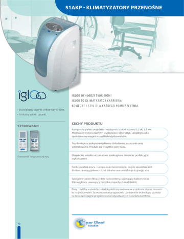 51AKP - KLIMATYZATORY PRZENOŚNE IGLOO OCHŁODZI T WÓJ DOM! IGLOO TO KLIMAT YZATOR CARRIERA: KOMFORT I ST YL DLA KAŻDEGO POMIESZCZENIA. • Ekologiczny czynnik chłodniczy R-410a. • Unikalny włoski projekt. STEROWANIE CECHY PRODUKTU Kompletna paleta urządzeń – wydajność chłodnicza od 2,2 do 3,1 kW. Możliwość wyboru różnych wydajności i kolorystyki urządzenia dla spełnienia wymagań wszystkich użytkowników. Trzy funkcje w jednym urządzeniu: chłodzenie, osuszanie oraz wentylowanie. Produkt na wszystkie pory roku. Sterownik bezprzewodowy Eleganckie włoskie wzornictwo: zaokrąglone linie oraz perfekcyjne wykończenie. Funkcja cichej pracy – lampki są przyciemnione, świeże powietrze jest dostarczane wyjątkowo cicho: idealne warunki dla spokojnego snu. Specjalny system filtracji: filtr nanosrebrny, usuwający bakterie oraz filtr węglowy, usuwający brzydkie zapachy (51AKP260H). Duży i czytelny wyświetlacz ciekłokrystaliczny zarówno na urządzeniu jak i na sterowniku na podczerwień. Zaawansowana i przyjazna dla użytkownika technologia pozwala na łatwe i precyzyjne programowanie indywidualnych warunków komfortu. 70 Klimatyzatory przenośne Model 51AKP300E 51AKP220M 51AKP240M 51AKP310M kW 2,2 3,0 2,3 2,5 3,1 2,7 Pobór mocy W 820 1175 820 875 1225 940 W/W 2,68 2,55 2,80 2,86 2,53 2,83 B C A A C A 410 588 410 438 613 470 E.E.R. Klasa sprawności energetycznej Roczne zużycie energii KWh 51AKP260H Osuszanie l/h 0,9 1,3 0,9 1,1 1,3 1,1 Przepływ powietrza (n/w) l/s 61/111 61/111 61/111 61/111 61/111 61/111 Ciśnienie akustyczne (n/w) dB(A) 43/48 44/49 43/48 43/48 44/49 43/48 Moc akustyczna (n/w) dB(A) 54,1/56,9 54,9/57,4 54,1/56,9 54,1/56,9 54,9/57,4 54,1/56,9 Wymiary (wys × dł × głęb) mm 860 × 480 × 410 860 × 480 × 410 860 × 480 × 410 860 × 480 × 410 860 × 480 × 410 860 × 480 × 410 Waga kg 36 36 36 36 36 36 V-ph-Hz 230-1-50 230-1-50 230-1-50 230-1-50 230-1-50 230-1-50 mm 2000 2000 2000 2000 2000 2000 A 4,8 6,0 4,8 5,2 6,2 5,2 51AKP210E 51AKP300E 51AKP220M 51AKP240M 51AKP310M 51AKP260H Biały Biały Biały Biały / Błękitny Biały / Błękitny Srebrny 3 3 3 3 3 3 Termostat Tak Tak Tak Tak Tak Tak Oddzielna funkcja osuszania Tak Tak Tak Tak Tak Tak Oddzielna funkcja wentylowania Tak Tak Tak Tak Tak Tak Sterowanie elektroniczne Tak Tak Tak Tak Tak Tak Automatyczne wentylowawnie Tak Tak Tak Tak Tak Tak Paca nocna Tak Tak Tak Tak Tak Tak Programator Tak Tak Tak Tak Tak Tak Podstawowe Podstawowe Podstawowe Aktywne węglowe Aktywne węglowe Aktywny Węglowy+Srebrny Zasilanie Maks. długość rury wypływu powietrza Prąd pracy Model Kolor Prędkości pracy wentylatora Filtry Ilość Pilot na podczerwień Nie Nie Tak Tak Tak Tak Czynnik chłodniczy R410A R410A R410A R410A R410A R410A 51AKP 51AKP210E Wydajność chłodnicza Stylowy klimatyzator, który oczyszcza twoje powietrze Ta stylowa jednostka nie tylko chłodzi powietrze, lecz również je oczyszcza dzięki specjalnym filtrom Srebrnym i Aktywnym Węglowym. 51AKP260H Przyjemny akcent w twoim domu Przyjemne kolory i elegancka sylwetka sprawiają, że jednostki są dyskretne i przyjazne a powietrze zawsze świeże. 51AKP240M 51AKP310M Komfort w każdym miejscu Prosty w obsłudze, przyjazny użytkownikowi klimatyzator oferuje efektywność i prostotę: łatwy do przemieszczania, może być ustawiony w każdym miejscu, w którym potrzebujesz komfortu i przyjemnego środowiska. 51AKP210E 51AKP300E 51AKP220M 71