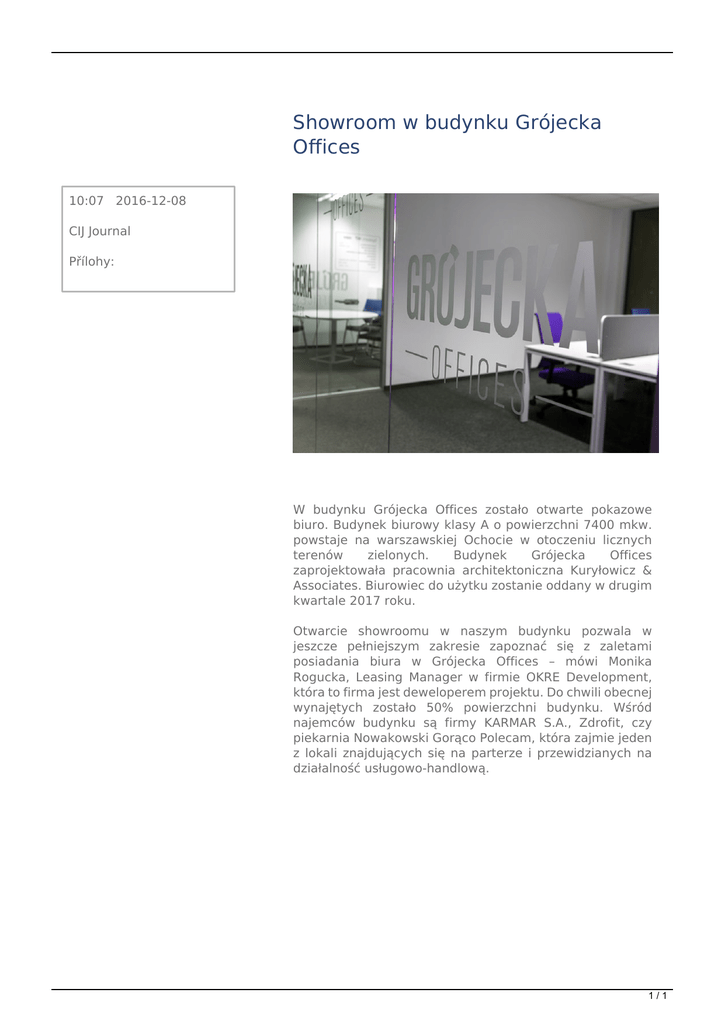 Showroom w budynku Grójecka Offices 10:07 2016-12-08 CIJ Journal Přílohy: W budynku Grójecka Offices zostało otwarte pokazowe biuro. Budynek biurowy klasy A o powierzchni 7400 mkw. powstaje na warszawskiej Ochocie w otoczeniu licznych terenów zielonych. Budynek Grójecka Offices zaprojektowała pracownia architektoniczna Kuryłowicz & Associates. Biurowiec do użytku zostanie oddany w drugim kwartale 2017 roku. Otwarcie showroomu w naszym budynku pozwala w jeszcze pełniejszym zakresie zapoznać się z zaletami posiadania biura w Grójecka Offices – mówi Monika Rogucka, Leasing Manager w firmie OKRE Development, która to firma jest deweloperem projektu. Do chwili obecnej wynajętych zostało 50% powierzchni budynku. Wśród najemców budynku są firmy KARMAR S.A., Zdrofit, czy piekarnia Nowakowski Gorąco Polecam, która zajmie jeden z lokali znajdujących się na parterze i przewidzianych na działalność usługowo-handlową. 1/1