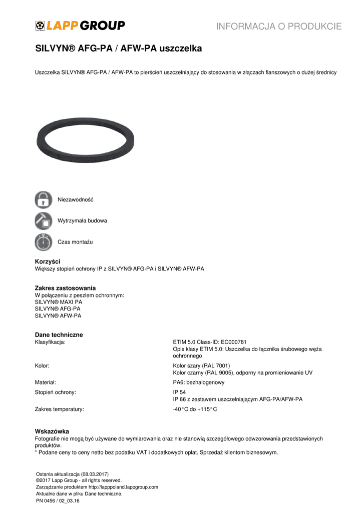INFORMACJA O PRODUKCIE SILVYN® AFG-PA / AFW-PA uszczelka Uszczelka SILVYN® AFG-PA / AFW-PA to pierścień uszczelniający do stosowania w złączach flanszowych o dużej średnicy Niezawodność Wytrzymała budowa Czas montażu Korzyści Większy stopień ochrony IP z SILVYN® AFG-PA i SILVYN® AFW-PA Zakres zastosowania W połączeniu z peszlem ochronnym: SILVYN® MAXI PA SILVYN® AFG-PA SILVYN® AFW-PA Dane techniczne Klasyfikacja: ETIM 5.0 Class-ID: EC000781 Opis klasy ETIM 5.0: Uszczelka do łącznika śrubowego węża ochronnego Kolor: Kolor szary (RAL 7001) Kolor czarny (RAL 9005), odporny na promieniowanie UV Materiał: PA6: bezhalogenowy Stopień ochrony: IP 54 IP 66 z zestawem uszczelniającym AFG-PA/AFW-PA Zakres temperatury: -40°C do +115°C Wskazówka Fotografie nie mogą być używane do wymiarowania oraz nie stanowią szczegółowego odwzorowania przedstawionych produktów. * Podane ceny to ceny netto bez podatku VAT i dodatkowych opłat. Sprzedaż klientom biznesowym. Ostania aktualizacja (08.03.2017) ©2017 Lapp Group - all rights reserved. Zarządzanie produktem http://lapppoland.lappgroup.com Aktualne dane w pliku Dane techniczne. PN 0456 / 02_03.16 Powered by TCPDF (www.tcpdf.org) 55001082 70 55001083 95 SILVYN® AFG-PA / AFW-PA uszczelka SILVYN® uszczelnienie do AFG-PA, AFW-PA Ostania aktualizacja (08.03.2017) ©2017 Lapp Group - all rights reserved. Zarządzanie produktem http://lapppoland.lappgroup.com Aktualne dane w pliku Dane techniczne. PN 0456 / 02_03.16 INFORMACJA O PRODUKCIE Powered by TCPDF (www.tcpdf.org) Wielkość nominalna Numer katalogowy