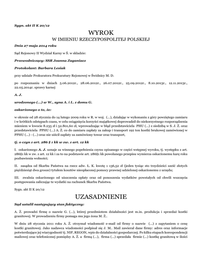 Sygn. akt II K 20/12 WYROK W IMIENIU RZECZYPOSPOLITEJ POLSKIEJ Dnia 27 maja 2014 roku Sąd Rejonowy II Wydział Karny w Ś. w składzie: Przewodniczący: SSR Joanna Zaganiacz Protokolant: Barbara Lesiak przy udziale Prokuratora Prokuratury Rejonowej w Świdnicy M. D. po rozpoznaniu w dniach 5.06.2012r., 28.06.2012r., 26.07.2012r., 25.09.2012r., 8.10.2013r., 12.11.2013r., 22.05.2014r. sprawy karnej A. J. urodzonego (...) w W., syna A. i L. z domu G. oskarżonego o to, że: w okresie od 28 stycznia do 14 lutego 2009 roku w R. w woj. (...), działając w wykonaniu z góry powziętego zamiaru i w krótkich odstępach czasu, w celu osiągnięcia korzyści majątkowej doprowadził do niekorzystnego rozporządzenia mieniem w kwocie 8.235 zł i 52.801,60 zł, wprowadzając w błąd przedstawiciela PHU (...) z siedzibą w S. J. Ż. oraz przedstawiciela PPHU (...) A. Ż. co do zamiaru zapłaty za zakup i transport 192 ton kostki brukowej zamówionej w PPHU (...) - (...) oraz nie uiścił zapłaty za zamówiony towar oraz transport, tj. o czyn z art. 286 § 1 kk w zw. z art. 12 kk I. oskarżonego A. J. uznaje za winnego popełnienia czynu opisanego w części wstępnej wyroku, tj. występku z art. 286§1 kk w zw. z art. 12 kk i za to na podstawie art. 286§1 kk powołanego przepisu wymierza oskarżonemu karę roku pozbawienia wolności; II. zasądza od Skarbu Państwa na rzecz adw. Ł. K. kwotę 1 136,52 zł (jeden tysiąc sto trzydzieści sześć złotych pięćdziesiąt dwa grosze) tytułem kosztów nieopłaconej pomocy prawnej udzielonej oskarżonemu z urzędu; III. zwalnia oskarżonego od uiszczenia opłaty oraz od ponoszenia wydatków powstałych od chwili wszczęcia postępowania zaliczając te wydatki na rachunek Skarbu Państwa. Sygn. akt II K 20/12 UZASADNIENIE Sąd ustalił następujący stan faktyczny: A. Ż. prowadzi firmę o nazwie G. (...), której przedmiotem działalności jest m.in. produkcja i sprzedaż kostki granitowej. W prowadzeniu firmy pomaga mu jego żona M. Ż.. W dniu 28 stycznia 2011 roku A. Ż. otrzymał wiadomość e-mail od firmy o nazwie (...) z zapytaniem o cenę kostki granitowej. Jako nadawca wiadomości podpisał się J. M.. Mail zawierał dane firmy: adres oraz informacje potwierdzające jej wiarygodność tj. NIP, REGON, wpis do działalności gospodarczej. Po kilku etapach korespondencji mailowej oraz telefonicznej pomiędzy A. Ż. a firmą (...), firma (...) sprzedała firmie (...) kostkę granitową w ilości 192 ton o wartości 52,801,60 zł. Rozmowy telefoniczne były prowadzone z osobą, która przedstawiała się jako A. J.. Sprzedaż nastąpiła w 7 etapach. Strony ustaliły, iż A. Ż. zorganizuje transport kostki, a za transport zapłaci odbiorca. Transport został zlecony firmie PHU (...) prowadzonej przez ojca pokrzywdzonego - J. Ż.. K. została zawieziona w kilku transportach na wyznaczone miejsce tj. na plac budowy Firmy (...) z/s przy ul. (...) w D.. Plac był wynajmowany przez A. J. od E. C.. Za dostawę firma PHU (...) wystawiła dwie faktury na łączną kwotę 8235 zł brutto, z 7 dniowym terminem płatności każda. Z uwagi na to, iż była to zima i w tym okresie nie ma popytu na kostkę granitową A. Ż. nie chcąc blokować miejsca na kolejne wyprodukowane partie towaru zgodził się na odroczony do 30 dni termin płatności. • Dowód: • zeznania świadka M. Ż., k. 2-5, • zeznania świadka A. Ż. k. 51 – odwrót, • zeznania świadka E. C. k. 74 – 75 • wydruk korespondencji mailowej prowadzonej między stronami k. 6 -8 • kopie faktur k. 9, 10, 11, 13, 15, 17, 19, 21, 23 Cały towar został odebrany przez właściciela firmy (...) i jego odbiór został udokumentowany na zasadzie kwitów (...). Działalność (...) została zarejestrowana na A. J.. Po upływie terminu płatności firma (...) nie uregulowała swoich zobowiązań, ani wobec (...) ani wobec firmy PHU (...). Mimo wielokrotnych prób ze strony zarówno M. Ż. jak i A. Ż. nie udało nawiązać się kontaktu z przedstawicielami firmy (...). Do chwili obecnej zadłużenie nie zostało w żaden sposób uregulowane. - zeznania świadka M. Ż., k. 2-5 - zeznania świadka A. O. k.60 – odwrót - kopie kwitów WZ k. 12, 14, 16, 18, 20, 22, 24 A. J. ma 47 lata, jest rozwiedziony, ma jedno dorosłe dziecko, nikt nie pozostaje na jego utrzymaniu. Ma wykształcenie wyższe techniczne, a jego wyuczony zawód to technik mechanik precyzyjny, bezrobotny. Był uprzednio karany sądownie. Dowód: • wyjaśnienia oskarżonego, k. 234 -236 • zaświadczenie Centralnej Bazy Danych Systemu Informatycznego Prokuratury k. 179-181 • dane o karalności, k. 482-483 Oskarżony A. J. zarówno w postępowaniu przygotowawczym jak i na rozprawie nie przyznał się do popełnienia zarzucanego mu czynu i zaprzeczył aby zajmował się kontraktami związanymi z materiałami budowlanymi i kostką granitową. W toku postępowania przygotowawczego wyjaśnił, że prowadził działalność gospodarczą pod nazwą (...), jednakże firma jego zajmowała się pośrednictwem handlowym m.in. sprzedażą naczyń emaliowanych na rynek bułgarski. Zaprzeczył, aby zawierał umowy z pokrzywdzonymi : „ nic mi nie mówią nazwisko Ż. jak też nazwy firm (...) i B.”. Wskazał, iż w jego firmie umowami i negocjacjami zajmował się M. P. i być może to on zawarł umowy. Na rozprawie przed Sądem oskarżony przedstawił wersję tożsamą, z tą którą przedstawił w trakcie postępowania przygotowawczego. Podtrzymał zeznania złożone w postępowaniu przygotowawczym. Ponownie zaprzeczył, aby kiedykolwiek składał zamówienie na kostkę granitową, podpisywał umowę bądź zamówienie lub aby kiedykolwiek prowadził w tym przedmiocie rozmowy. Zaprzeczył również, aby kontaktował się z przedstawicielami firmy (...). Na pytania podał, że do pomieszczeń biurowych w których znajdowały się m.in. pieczątka jego firmy miał dostęp M. P.. Zeznał, że nie korzystał z adresu [email protected]