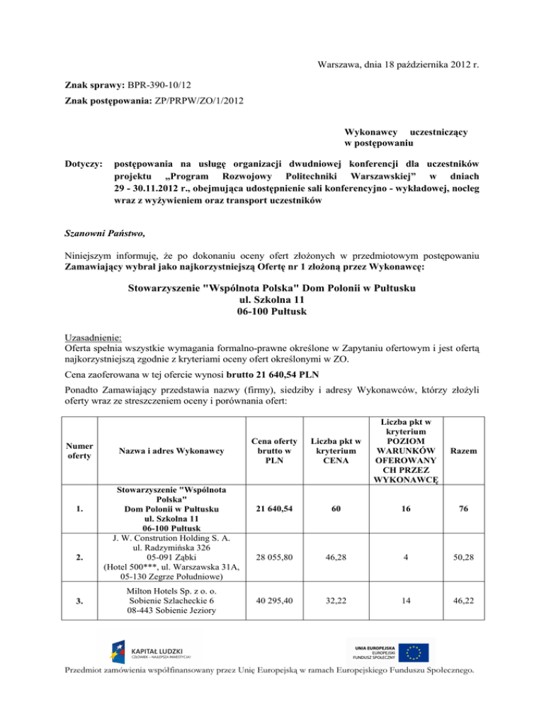Warszawa, dnia 18 października 2012 r. Znak sprawy: BPR-390-10/12 Znak postępowania: ZP/PRPW/ZO/1/2012 Wykonawcy uczestniczący w postępowaniu Dotyczy: postępowania na usługę organizacji dwudniowej konferencji dla uczestników projektu „Program Rozwojowy Politechniki Warszawskiej” w dniach 29 - 30.11.2012 r., obejmująca udostępnienie sali konferencyjno - wykładowej, nocleg wraz z wyżywieniem oraz transport uczestników Szanowni Państwo, Niniejszym informuję, że po dokonaniu oceny ofert złożonych w przedmiotowym postępowaniu Zamawiający wybrał jako najkorzystniejszą Ofertę nr 1 złożoną przez Wykonawcę: Stowarzyszenie "Wspólnota Polska" Dom Polonii w Pułtusku ul. Szkolna 11 06-100 Pułtusk Uzasadnienie: Oferta spełnia wszystkie wymagania formalno-prawne określone w Zapytaniu ofertowym i jest ofertą najkorzystniejszą zgodnie z kryteriami oceny ofert określonymi w ZO. Cena zaoferowana w tej ofercie wynosi brutto 21 640,54 PLN Ponadto Zamawiający przedstawia nazwy (firmy), siedziby i adresy Wykonawców, którzy złożyli oferty wraz ze streszczeniem oceny i porównania ofert: Numer oferty 1. 2. 3. Nazwa i adres Wykonawcy Stowarzyszenie "Wspólnota Polska" Dom Polonii w Pułtusku ul. Szkolna 11 06-100 Pułtusk J. W. Constrution Holding S. A. ul. Radzymińska 326 05-091 Ząbki (Hotel 500***, ul. Warszawska 31A, 05-130 Zegrze Południowe) Milton Hotels Sp. z o. o. Sobienie Szlacheckie 6 08-443 Sobienie Jeziory Cena oferty brutto w PLN Liczba pkt w kryterium CENA Liczba pkt w kryterium POZIOM WARUNKÓW OFEROWANY CH PRZEZ WYKONAWCĘ 21 640,54 60 16 76 28 055,80 46,28 4 50,28 40 295,40 32,22 14 46,22 Razem Przedmiot zamówienia współfinansowany przez Unię Europejską w ramach Europejskiego Funduszu Społecznego. 4. AGMA – SPORT Agnieszka Matuszczyk Antoniówka 259 26-630 Jedlnia-Letnisko (Kuźnia Napoleońska, ul. Sochaczewska 5, 96-515 Teresin, Paprotnia) 35 793,00 36,28 14 50,28 5. Ossa Sp. z o. o. Ossa 1 96-200 Rawa Mazowiecka 32 083,20 40,47 30 70,47 Z poważaniem, ….……………………………… (podpis Kierownika) Przedmiot zamówienia współfinansowany przez Unię Europejską w ramach Europejskiego Funduszu Społecznego.