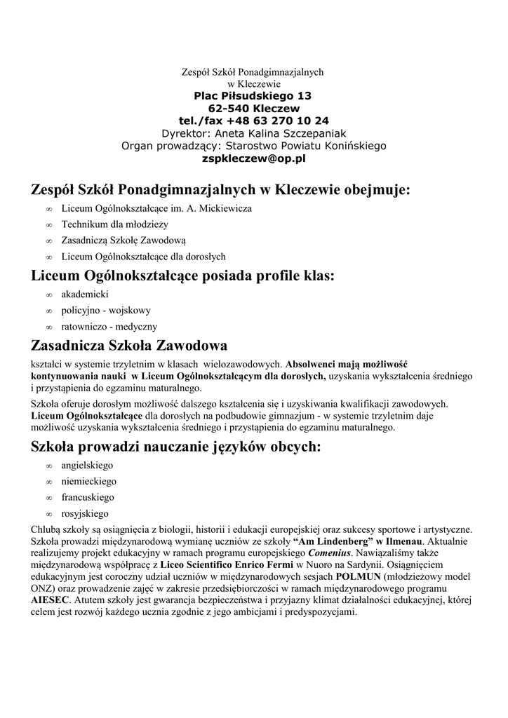 Zespół Szkół Ponadgimnazjalnych w Kleczewie Plac Piłsudskiego 13 62-540 Kleczew tel./fax +48 63 270 10 24 Dyrektor: Aneta Kalina Szczepaniak Organ prowadzący: Starostwo Powiatu Konińskiego [email protected] Zespół Szkół Ponadgimnazjalnych w Kleczewie obejmuje: • Liceum Ogólnokształcące im. A. Mickiewicza • Technikum dla młodzieży • Zasadniczą Szkołę Zawodową • Liceum Ogólnokształcące dla dorosłych Liceum Ogólnokształcące posiada profile klas: • akademicki • policyjno - wojskowy • ratowniczo - medyczny Zasadnicza Szkoła Zawodowa kształci w systemie trzyletnim w klasach wielozawodowych. Absolwenci mają możliwość kontynuowania nauki w Liceum Ogólnokształcącym dla dorosłych, uzyskania wykształcenia średniego i przystąpienia do egzaminu maturalnego. Szkoła oferuje dorosłym możliwość dalszego kształcenia się i uzyskiwania kwalifikacji zawodowych. Liceum Ogólnokształcące dla dorosłych na podbudowie gimnazjum - w systemie trzyletnim daje możliwość uzyskania wykształcenia średniego i przystąpienia do egzaminu maturalnego. Szkoła prowadzi nauczanie języków obcych: • angielskiego • niemieckiego • francuskiego • rosyjskiego Chlubą szkoły są osiągnięcia z biologii, historii i edukacji europejskiej oraz sukcesy sportowe i artystyczne. Szkoła prowadzi międzynarodową wymianę uczniów ze szkoły “Am Lindenberg” w Ilmenau. Aktualnie realizujemy projekt edukacyjny w ramach programu europejskiego Comenius. Nawiązaliśmy także międzynarodową współpracę z Liceo Scientifico Enrico Fermi w Nuoro na Sardynii. Osiągnięciem edukacyjnym jest coroczny udział uczniów w międzynarodowych sesjach POLMUN (młodzieżowy model ONZ) oraz prowadzenie zajęć w zakresie przedsiębiorczości w ramach międzynarodowego programu AIESEC. Atutem szkoły jest gwarancja bezpieczeństwa i przyjazny klimat działalności edukacyjnej, której celem jest rozwój każdego ucznia zgodnie z jego ambicjami i predyspozycjami.