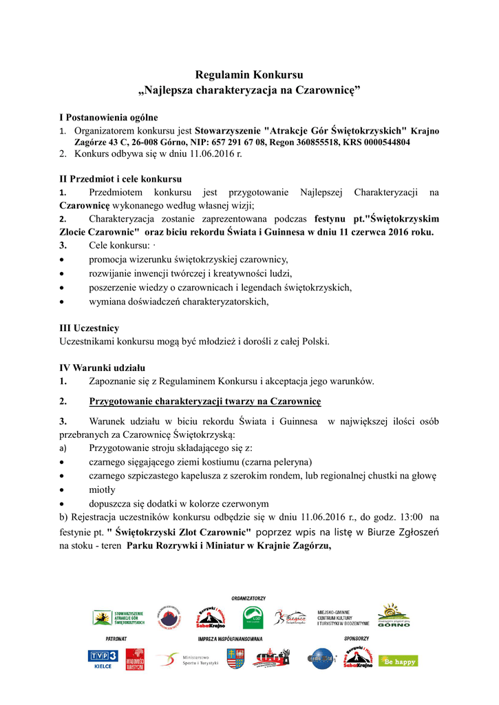Regulamin Konkursu „Najlepsza charakteryzacja na Czarownicę” I Postanowienia ogólne 1. Organizatorem konkursu jest Stowarzyszenie "Atrakcje Gór Świętokrzyskich" Krajno Zagórze 43 C, 26-008 Górno, NIP: 657 291 67 08, Regon 360855518, KRS 0000544804 2. Konkurs odbywa się w dniu 11.06.2016 r. II Przedmiot i cele konkursu 1. Przedmiotem konkursu jest przygotowanie Najlepszej Charakteryzacji na Czarownicę wykonanego według własnej wizji; 2. Charakteryzacja zostanie zaprezentowana podczas festynu pt."Świętokrzyskim Zlocie Czarownic" oraz biciu rekordu Świata i Guinnesa w dniu 11 czerwca 2016 roku. 3. Cele konkursu: · promocja wizerunku świętokrzyskiej czarownicy, rozwijanie inwencji twórczej i kreatywności ludzi, poszerzenie wiedzy o czarownicach i legendach świętokrzyskich, wymiana doświadczeń charakteryzatorskich, III Uczestnicy Uczestnikami konkursu mogą być młodzież i dorośli z całej Polski. IV Warunki udziału 1. Zapoznanie się z Regulaminem Konkursu i akceptacja jego warunków. 2. Przygotowanie charakteryzacji twarzy na Czarownicę 3. Warunek udziału w biciu rekordu Świata i Guinnesa w największej ilości osób przebranych za Czarownicę Świętokrzyską: a) Przygotowanie stroju składającego się z: czarnego sięgającego ziemi kostiumu (czarna peleryna) czarnego szpiczastego kapelusza z szerokim rondem, lub regionalnej chustki na głowę miotły dopuszcza się dodatki w kolorze czerwonym b) Rejestracja uczestników konkursu odbędzie się w dniu 11.06.2016 r., do godz. 13:00 na festynie pt. " Świętokrzyski Zlot Czarownic" poprzez wpis na listę w Biurze Zgłoszeń na stoku - teren Parku Rozrywki i Miniatur w Krajnie Zagórzu, Prezentacja najlepszych charakteryzacji twarzy będzie miała miejsce dnia 11 czerwca 2016 r. podczas festynu pt. " Świętokrzyski Zlot Czarownic" w Parku Rozrywki i Miniatur w Krajnie Zagórzu, V Przebieg konkursu 1. Uczestnicy konkursu stawią się w przebraniu czarownicy zgodnie z warunkami, o których mowa pkt. 4, ppkt 2, niniejszego regulaminu i pełną charakteryzacją twarzy według własnego pomysłu. 2. Komisję konkursową stanowić będą przedstawiciele Sponsorów i Organizatorów. 3. Ogłoszenie wyników konkursu i wręczenie nagród nastąpi 11 czerwca 2016 r. podczas festynu pt. "Świętokrzyski Zlot Czarownic Parku Rozrywki i Miniatur Krajno Zagórze. b) VI Kryteria oceny prac 1. Charakteryzację twarzy zostaną ocenione w II kategoriach wiekowych: a. młodzież 13 -17 lat b. dorośli od 18 lat 2. Charakteryzacja będzie oceniana według następujących kryteriów: · Pomysłowość Estetyka wykonania charakteryzacji Wkład pracy Technika wykonania charakteryzacji Kompletny strój VII Zasady przyznawania nagród 1. W każdej kategorii wiekowej Komisja przyzna trzy miejsca (od I do III). 2. Laureaci otrzymają dyplomy pamiątkowe oraz nagrody. 3. Decyzje Komisji są ostateczne i nieodwołalne. VIII Ogłoszenie wyników 1. Ogłoszenie wyników Konkursu oraz wręczenie nagród nastąpi 11 czerwca 2016 r. na Świętokrzyskim Zlocie Czarownic w Parku Rozrywki i Miniatur w Krajnie Zagórzu przez Przewodniczącego Komisji. 2. Laureaci Konkursu są zobowiązani do osobistego odbioru nagrody. IX Postanowienia końcowe 1. Organizator zastrzega sobie, a także podmiotom z nim powiązanym, prawo do przeprowadzenia z każdym z Uczestników za zgodą opiekunów wywiadów, robienia zdjęć i/lub filmowania, używania imion i nazwisk, wizerunku, głosu oraz innych materiałów pochodzących lub związanych z uczestnictwem w Konkursie na potrzeby reklamowe, promocyjne, a także możliwość ich wykorzystania w Internecie lub 2. 3. 4. 5. transmisjach radiowo-telewizyjnych oraz na wszelkie inne potrzeby komercyjne z prawem do ich modyfikowania. Organizator zastrzega sobie, a także podmiotom powiązanym prawo do nieodpłatnego wykorzystania wszelkich zdjęć, materiałów filmowych, wywiadów i nagrań przedstawiających Uczestników, które mogą być bezpłatnie umieszczane na wybranych nośnikach elektronicznych, katalogach oraz mediach: telewizja, radio, gazety, magazyny, strony internetowe na potrzeby reklamowe i promocyjne. Uczestnik oświadcza, że Organizator nie jest i nie będzie zobligowany do uiszczenia jakichkolwiek opłat związanych z działaniami opisanymi w niniejszym punkcie, udzielając tym samym nieograniczonej licencji na używanie wypowiedzi, swojego wizerunku, informacji bez powiadomienia w celu reklamy i promocji Konkursu oraz innych wydarzeń organizowanych przez Organizatora i partnerów II Pucharu Gór Świętokrzyskich Festiwalu Biegowego. Uczestnik bierze udział w Konkursie wyłącznie na własną odpowiedzialność i ponosi związane z tym ryzyko. Regulamin konkursu opublikowany jest na stronach: www.sabatkrajno.pl oraz www.wokollysejgory.pl