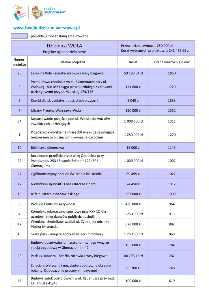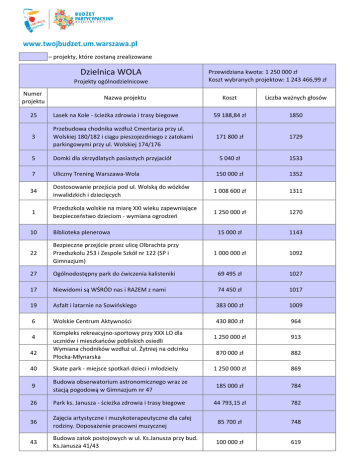 – projekty, które zostaną zrealizowane Dzielnica WOLA Projekty ogólnodzielnicowe Numer projektu Nazwa projektu Przewidziana kwota: 1 250 000 zł Koszt wybranych projektow: 1 243 466,99 zł Koszt Liczba ważnych głosów 59 188,84 zł 1850 171 800 zł 1729 5 040 zł 1533 150 000 zł 1352 25 Lasek na Kole - ścieżka zdrowia i trasy biegowe 3 Przebudowa chodnika wzdłuż Cmentarza przy ul. Wolskiej 180/182 i ciągu pieszojezdniego z zatokami parkingowymi przy ul. Wolskiej 174/176 5 Domki dla skrzydlatych pasiastych przyjaciół 7 Uliczny Trening Warszawa-Wola 34 Dostosowanie przejścia pod ul. Wolską do wózków inwalidzkich i dziecięcych 1 008 600 zł 1311 1 Przedszkola wolskie na miarę XXI wieku zapewniające bezpieczeństwo dzieciom - wymiana ogrodzeń 1 250 000 zł 1270 10 Biblioteka plenerowa 15 000 zł 1143 22 Bezpieczne przejście przez ulicę Olbrachta przy Przedszkolu 253 i Zespole Szkół nr 122 (SP i Gimnazjum) 1 000 000 zł 1092 27 Ogólnodostępny park do ćwiczenia kalisteniki 69 495 zł 1027 17 Niewidomi są WŚRÓD nas i RAZEM z nami 74 450 zł 1017 19 Asfalt i latarnie na Sowińskiego 383 000 zł 1009 6 Wolskie Centrum Aktywności 430 800 zł 964 1 250 000 zł 913 870 000 zł 882 1 250 000 zł 869 4 42 Kompleks rekreacyjno-sportowy przy XXX LO dla uczniów i mieszkańców pobliskich osiedli Wymiana chodników wzdłuż ul. Żytniej na odcinku Płocka-Młynarska 40 Skate park - miejsce spotkań dzieci i młodzieży 9 Budowa obserwatorium astronomicznego wraz ze stacją pogodową w Gimnazjum nr 47 185 000 zł 784 26 Park ks. Janusza - ścieżka zdrowia i trasy biegowe 44 793,15 zł 782 36 Zajęcia artystyczne i muzykoterapeutyczne dla całej rodziny. Doposażenie pracowni muzycznej 85 700 zł 748 43 Budowa zatok postojowych w ul. Ks.Janusza przy bud. Ks.Janusza 41/43 100 000 zł 619 31 Rewitalizacja terenu osiedlowego 18 Mural - Kadry z filmów z Janem Himilsbachem i Zdzisławem Maklakiewiczem - pomiędzy rondami, nazwanymi w 2013 na cześć tych aktorów 460 407,80 zł 616 27 200 zł 573 Historyczna Wola bliższa integrującym się mieszkańcom Rewitalizacja terenu przy ul. Nowolipie 20 i Nowolipie 20A Budowa boiska z sztucznej trawy przy Liceum Sowińskiego 20 000 zł 568 194 449,80 zł 530 877 000 zł 527 28 Park ks. Janusza - siłownia pod chmurką 29 447,50 zł 504 13 Budowa boiska szkolnego z trybunami w Szkole nr 32 im. K.K. Baczyńskiego w Warszawie 1 148 916 zł 476 37 Budowa strzelnicy sportowej przy Gimnazjum nr 47 157 800 zł 463 41 Integracyjne zajęcia w wodzie dla dzieci i młodzieży 455 760 zł 455 36 541,60 zł 420 637 455 zł 365 16 2 20 12 35 Senior poliglotą - multimedialna sala do nauki języków obcych Wola Zmian - wolska liga piłki nożnej i sportowy pakiet rekreacyjny 15 Miejsca parkingowe przy Brożka 2B i 2A 174 574 zł 358 23 Włączenie otoczenia Muru Getta Warszawskiego w rejonie ulic Sienna-Złota do systemu miejskiego 125 000 zł 341 14 Asfalt i latarnie na Baltazara i Norwida 867 000 zł 298 11 Międzynarodowy Festiwal Folklorystyczny "WARSFOLK" 198 900 zł 292 21 Wymiana nawierzchni podwórka przy ul. Nowolipki 25, Nowolipki 25A, Nowolipki 25B, Smocza 3 394 048,83 zł 273 33 Koncerty u mariawitów 18 450 zł 251 30 Audyt ZGN Wola 80 000 zł 228 24 Nocna podróż z książką po świecie 46 500 zł 197 38 Piknik rodzinny - razem po zdrowie 27 349 zł 190 8 Mistrzostwa Olimpijskie - szkolne zawody umiejętności edukacyjnych 130 000 zł 183 32 Dzielnicowy Informator Senioralny 123 000 zł 168 29 Rewitalizacja podwórka Nowolipki 21, 21a, 21b 490 000 zł 163 39 Wola siatkówką stoi - siatkówka rodzinna 30 000 zł 128 Dzielnica WOLA Obszar: Koło Numer projektu Nazwa projektu Przewidziana kwota: 168 000 zł Koszt wybranych projektow: 163 540 zł Koszt Liczba ważnych głosów 13 Monitoring bezpiecznej i spokojnej drogi od ul. Obozowej do L.O. im. K. Norwida 79 000 zł 526 7 Doposażenie placu zabaw - Kolonia "Mszczonowska" 30 000 zł 508 9 Dziecięce parki aktywności wielozmysłowej w przedszkolach na Kole 160 000 zł 488 1 Przejście do Parku Moczydło 40 940 zł 480 11 Ścieżki zdrowia w przedszkolach na Kole szansą na kształtowanie zdrowego stylu życia dzieci 160 000 zł 464 4 Miejsca postojowe - parkingowe 67 982,72 zł 330 2 Zajęcia muzyczne dla dzieci z grup 0-3 30 800 zł 325 3 Wybieg zamknięty dla psów i msce spotkań ich właścicieli 43 969,11 zł 301 8 WYBIEG DLA PSÓW w Parku im. Księcia Janusza 44 602,10 zł 299 14 Plac zabaw i teren rekreacyjny wokół świetlicy Gniazdo 96 800 zł 261 15 Bezpieczna świetlica 8 500 zł 164 12 Z rodziną na Kole 64 000 zł 147 6 Zaśpiewajmy razem 5 100 zł 143 5 Bezpiecznym okiem 6 700 zł 112 10 Remont śmietnika 15 000 zł 100 Dzielnica WOLA Obszar: Ulrychów + Odolany Numer projektu Nazwa projektu Przewidziana kwota: 275 000 zł Koszt wybranych projektow: 269 383,40 zł Koszt Liczba ważnych głosów 6 Ścieżka rowerowa Olbrachta 171 000 zł 1 095 5 Zielone Odolany 211 320 zł 1 043 15 Poprawa bezpieczeństwa przejść dla pieszych 35 500 zł 883 14 Budowa chodnika przy ulicy Olbrachta 15 500 zł 821 65 200 zł 758 63 300 zł 630 90 000 zł 525 16 728 zł 500 112 422 zł 453 90 500 zł 413 19 455,40 zł 367 9 2 10 8 1 Generalny remont toalet w Szkole Podstawowej nr 351 przy ul. Jana Olbrachta Budowa ogrodzenia boiska przy Zespole Szkół nr 122 (Szkoła Podstawowa, Gimnazjum) przy ulicy Jana Olbrachta Miejsca postojowe Olbrachta 29 Montaż rolet wewnętrznych w salach lekcyjnych w Szkole Podstawowej nr 351 Bezpieczna nawierzchnia na placu zabaw w Przedszkolu nr 273 16 Klub Mam na Odolanach 17 Utworzenie ogródka kwiatowego przy Środowiskowym Ognisku Wychowawczym Towarzystwa Przyjaciół Dzieci 3 Wola na rowery 11 200 zł 367 11 Szklarnia edukacyjna "Zielone Odolany" 212 695 zł 326 4 Cool-turalna Gimbaza 36 404 zł 286 7 Parking dla społeczności szkolnej wzdłuż ulicy Elekcyjnej przy Zespole Szkół nr 65 121 000 zł 214 12 Styl życia mieszkańców Ulrychowa i Odolan? 