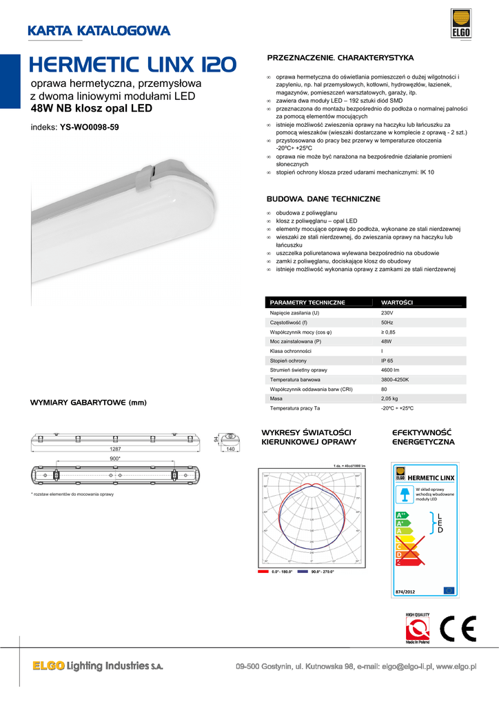 HERMETIC LINX 120 oprawa hermetyczna, przemysłowa z dwoma liniowymi modułami LED 48W NB klosz opal LED indeks: YS-WO0098-59 PRZEZNACZENIE. CHARAKTERYSTYKA • • • • • • • oprawa hermetyczna do oświetlania pomieszczeń o dużej wilgotności i zapyleniu, np. hal przemysłowych, kotłowni, hydrowęzłów, łazienek, magazynów, pomieszczeń warsztatowych, garaży, itp. zawiera dwa moduły LED – 192 sztuki diód SMD przeznaczona do montażu bezpośrednio do podłoża o normalnej palności za pomocą elementów mocujących istnieje możliwość zwieszenia oprawy na haczyku lub łańcuszku za pomocą wieszaków (wieszaki dostarczane w komplecie z oprawą - 2 szt.) przystosowana do pracy bez przerwy w temperaturze otoczenia -20ºC÷ +25ºC oprawa nie może być narażona na bezpośrednie działanie promieni słonecznych stopień ochrony klosza przed udarami mechanicznymi: IK 10 BUDOWA. DANE TECHNICZNE • • • • • • • WYMIARY GABARYTOWE (mm) obudowa z poliwęglanu klosz z poliwęglanu – opal LED elementy mocujące oprawę do podłoża, wykonane ze stali nierdzewnej wieszaki ze stali nierdzewnej, do zwieszania oprawy na haczyku lub łańcuszku uszczelka poliuretanowa wylewana bezpośrednio na obudowie zamki z poliwęglanu, dociskające klosz do obudowy istnieje możliwość wykonania oprawy z zamkami ze stali nierdzewnej PARAMETRY TECHNICZNE WARTOŚCI Napięcie zasilania (U) 230V Częstotliwość (f) 50Hz Współczynnik mocy (cos φ) ≥ 0,85 Moc zainstalowana (P) 48W Klasa ochronności I Stopień ochrony IP 65 Strumień świetlny oprawy 4600 lm Temperatura barwowa 3800-4250K Współczynnik oddawania barw (CRI) 80 Masa 2,05 kg Temperatura pracy Ta -20ºC ÷ +25ºC WYKRESY ŚWIATŁOŚCI KIERUNKOWEJ OPRAWY EFEKTYWNOŚĆ ENERGETYCZNA