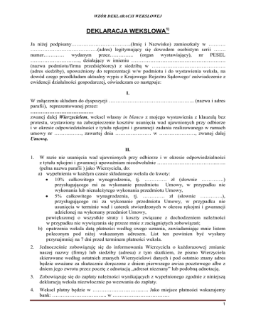 WZÓR DEKLARACJI WEKSLOWEJ DEKLARACJA WEKSLOWA1) Ja niżej podpisany……………………………..(Imię i Nazwisko) zamieszkały w ………. …………………………………(adres) legitymujący się dowodem osobistym serii ……. numer………… wydanym przez………….. (organ wystawiający), nr PESEL ……………………….., działający w imieniu ………………………………………………. (nazwa podmiotu/firma przedsiębiorcy) z siedzibą w ……………………………………. (adres siedziby), upoważniony do reprezentacji w/w podmiotu i do wystawienia weksla, na dowód czego przedkładam aktualny wypis z Krajowego Rejestru Sądowego/ zaświadczenie z ewidencji działalności gospodarczej, oświadczam co następuje: I. W załączeniu składam do dyspozycji ………………………………………….. (nazwa i adres parafii), reprezentowanej przez: ………………………….…… zwanej dalej Wierzycielem, weksel własny in blanco z mojego wystawienia z klauzulą bez protestu, wystawiony na zabezpieczenie kosztów usunięcia wad ujawnionych przy odbiorze i w okresie odpowiedzialności z tytułu rękojmi i gwarancji zadania realizowanego w ramach umowy nr ……….……, zawartej dnia ………………… w …………………, zwanej dalej Umową. II. 1. W razie nie usunięcia wad ujawnionych przy odbiorze i w okresie odpowiedzialności z tytułu rękojmi i gwarancji upoważniam nieodwołalnie ……………………………...….. (pełna nazwa parafii ) jako Wierzyciela, do: a) wypełnienia w każdym czasie składanego weksla do kwoty: • 10% całkowitego wynagrodzenia, tj. …………. zł (słownie ………….) przysługującego mi za wykonanie przedmiotu Umowy, w przypadku nie wykonania lub nienależytego wykonania przedmiotu Umowy, • 5% całkowitego wynagrodzenia, tj. …………. zł (słownie ………….), przysługującego mi za wykonanie przedmiotu Umowy, w przypadku nie usunięcia w terminie wad i usterek stwierdzonych w okresu rękojmi i gwarancji udzielonej na wykonany przedmiot Umowy, powiększonej o wszystkie straty i koszty związane z dochodzeniem należności w przypadku nie wywiązania się przeze mnie z zaciągniętych zobowiązań; b) opatrzenia weksla datą płatności według swego uznania, zawiadamiając mnie listem poleconym pod niżej wskazanym adresem. List ten powinien być wysłany przynajmniej na 7 dni przed terminem płatności weksla. 2. Jednocześnie zobowiązuję się do informowania Wierzyciela o każdorazowej zmianie naszej nazwy (firmy) lub siedziby (adresu) z tym skutkiem, że pismo Wierzyciela skierowane według ostatnich znanych Wierzycielowi danych i pod ostatnio znany adres będzie uważane za skutecznie doręczone z dniem pierwszego awiza pocztowego albo z dniem jego zwrotu przez pocztę z adnotacją „adresat nieznany” lub podobną adnotacją. 3. Zobowiązuję się do zapłaty należności wynikających z wypełnionego zgodnie z niniejszą deklaracją weksla niezwłocznie po wezwaniu do zapłaty. 4. Weksel płatny będzie w ………………………..…. Jako miejsce płatności wskazujemy bank: ………………………….. w …………………………… 1 WZÓR DEKLARACJI WEKSLOWEJ III. Weksel podlega zwrotowi wystawcy weksla niezwłocznie po uiszczeniu wszelkich należności objętych wekslem, bezpośrednio do rąk wystawcy weksla lub listem poleconym wysłanym na pod ostatnio wskazany adres wystawcy weksla. Miejsce i data ………………….….. 1) 2) Nazwa i adres wystawcy weksla oraz czytelne podpisy osób upoważnionych do wystawiania weksli w imieniu wystawcy weksla2) ….…………………………………………… Deklaracja wekslowa winna być wypełniona odręcznie przez osobę wystawiającą weksel. Deklaracja wekslowa winna zawierać nazwę i adres wystawcy weksla lub jego pieczątkę firmową oraz czytelne podpisy osób uprawnionych do wystawienia weksla. Nazwę i adres wystawcy weksla lub pieczęć firmowa powinna zostać złożona nad podpisami. 2