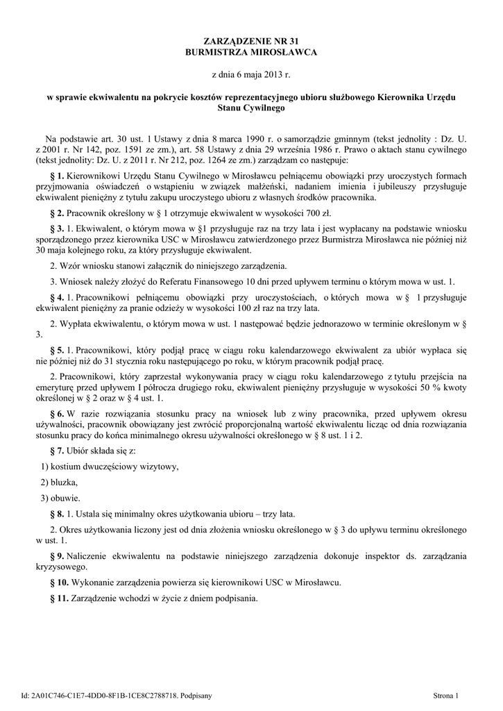 ZARZĄDZENIE NR 31 BURMISTRZA MIROSŁAWCA z dnia 6 maja 2013 r. w sprawie ekwiwalentu na pokrycie kosztów reprezentacyjnego ubioru służbowego Kierownika Urzędu Stanu Cywilnego Na podstawie art. 30 ust. 1 Ustawy z dnia 8 marca 1990 r. o samorządzie gminnym (tekst jednolity : Dz. U. z 2001 r. Nr 142, poz. 1591 ze zm.), art. 58 Ustawy z dnia 29 września 1986 r. Prawo o aktach stanu cywilnego (tekst jednolity: Dz. U. z 2011 r. Nr 212, poz. 1264 ze zm.) zarządzam co następuje: § 1. Kierownikowi Urzędu Stanu Cywilnego w Mirosławcu pełniącemu obowiązki przy uroczystych formach przyjmowania oświadczeń o wstąpieniu w związek małżeński, nadaniem imienia i jubileuszy przysługuje ekwiwalent pieniężny z tytułu zakupu uroczystego ubioru z własnych środków pracownika. § 2. Pracownik określony w § 1 otrzymuje ekwiwalent w wysokości 700 zł. § 3. 1. Ekwiwalent, o którym mowa w §1 przysługuje raz na trzy lata i jest wypłacany na podstawie wniosku sporządzonego przez kierownika USC w Mirosławcu zatwierdzonego przez Burmistrza Mirosławca nie później niż 30 maja kolejnego roku, za który przysługuje ekwiwalent. 2. Wzór wniosku stanowi załącznik do niniejszego zarządzenia. 3. Wniosek należy złożyć do Referatu Finansowego 10 dni przed upływem terminu o którym mowa w ust. 1. § 4. 1. Pracownikowi pełniącemu obowiązki przy uroczystościach, o których mowa w § 1 przysługuje ekwiwalent pieniężny za pranie odzieży w wysokości 100 zł raz na trzy lata. 2. Wypłata ekwiwalentu, o którym mowa w ust. 1 następować będzie jednorazowo w terminie określonym w § 3. § 5. 1. Pracownikowi, który podjął pracę w ciągu roku kalendarzowego ekwiwalent za ubiór wypłaca się nie później niż do 31 stycznia roku następującego po roku, w którym pracownik podjął pracę. 2. Pracownikowi, który zaprzestał wykonywania pracy w ciągu roku kalendarzowego z tytułu przejścia na emeryturę przed upływem I półrocza drugiego roku, ekwiwalent pieniężny przysługuje w wysokości 50 % kwoty określonej w § 2 oraz w § 4 ust. 1. § 6. W razie rozwiązania stosunku pracy na wniosek lub z winy pracownika, przed upływem okresu używalności, pracownik obowiązany jest zwrócić proporcjonalną wartość ekwiwalentu licząc od dnia rozwiązania stosunku pracy do końca minimalnego okresu używalności określonego w § 8 ust. 1 i 2. § 7. Ubiór składa się z: 1) kostium dwuczęściowy wizytowy, 2) bluzka, 3) obuwie. § 8. 1. Ustala się minimalny okres użytkowania ubioru – trzy lata. 2. Okres użytkowania liczony jest od dnia złożenia wniosku określonego w § 3 do upływu terminu określonego w ust. 1. § 9. Naliczenie ekwiwalentu na podstawie niniejszego zarządzenia dokonuje inspektor ds. zarządzania kryzysowego. § 10. Wykonanie zarządzenia powierza się kierownikowi USC w Mirosławcu. § 11. Zarządzenie wchodzi w życie z dniem podpisania. Id: 2A01C746-C1E7-4DD0-8F1B-1CE8C2788718. Podpisany Strona 1 Załącznik Nr 1 do Zarządzenia Nr 31 Burmistrza Mirosławca z dnia 6 maja 2013 r. Wniosek o wypłatę ekwiwalentu pieniężnego na sfinansowanie kosztów zakupu reprezentacyjnego ubioru służbowego dla Kierownika USC w Mirosławcu. Dane pracownika: Imię i nazwisko: …………………………………………. Stanowisko ………………………………………………. Data wypłaty ostatniego ekwiwalentu/wypłata po raz pierwszy*: …………………….. Wysokość wypłaconego ekwiwalentu (jeżeli dotyczy): …………………… zł. Inspektor ds. zarządzania kryzysowego: Wyżej wymieniona osoba spełnia warunki do wypłaty ekwiwalentu w wysokości ………………….. zł (słownie złotych ……………………………………………….), który stanowi kwotę określoną zgodnie z § 2 i § 4 ust 1 i 2 oraz § 5 ust 1 i 2 zarządzenia nr 31/2013 Burmistrza Mirosławca z dnia 6 maja 2013 roku. …………………………………………………. (data, pieczątka i podpis inspektora ds. zarządzania kryzysowego) Id: 2A01C746-C1E7-4DD0-8F1B-1CE8C2788718. Podpisany …………………………………..… (data, pieczątka i podpis Burmistrza Mirosławca) Strona 1