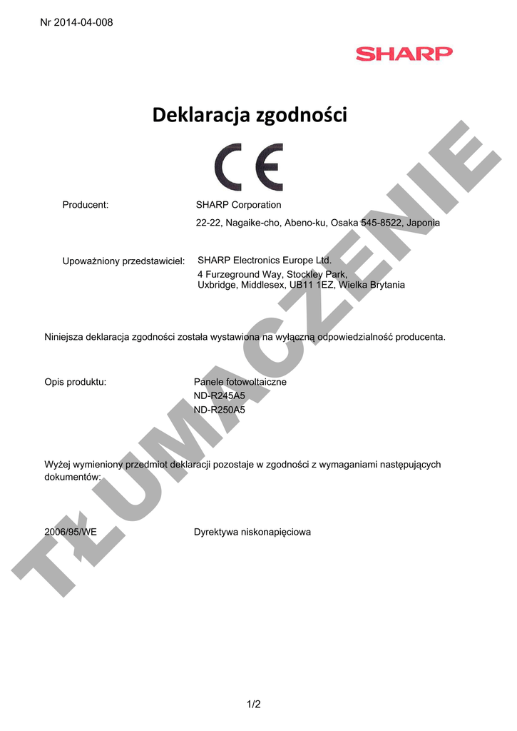 Nr 2014-04-008 Producent: SHARP Corporation N IE Deklaracja zgodności 22-22, Nagaike-cho, Abeno-ku, Osaka 545-8522, Japonia SHARP Electronics Europe Ltd. 4 Furzeground Way, Stockley Park, Uxbridge, Middlesex, UB11 1EZ, Wielka Brytania Z E Upoważniony przedstawiciel: Panele fotowoltaiczne ND-R245A5 ND-R250A5 M A Opis produktu: C Niniejsza deklaracja zgodności została wystawiona na wyłączną odpowiedzialność producenta. ŁU Wyżej wymieniony przedmiot deklaracji pozostaje w zgodności z wymaganiami następujących dokumentów: Dyrektywa niskonapięciowa T 2006/95/WE 1/2 Nr 2014-04-008 N IE Domniemanie zgodności z powyższymi dyrektywami i regulacjami prawnymi zostało przyjęte na podstawie zgodności z następującymi normami: Numer referencyjny: wydanie EN 61730-1:2007 + A1:2012 E EN 61730-2:2007 + A1:2012 IEC 61730-1 (wyd. 1); A2 Z IEC 61730-2 (wyd 1); A1 EN 61215: 2005 Data: A C IEC 61215 (wyd. 2) 14.04.2014 Podpis ŁU Stanowisko: I.V. Dieter Malinka Manager Product Compliance ppa. Frank Forstreuter General Manager SHARP Electronics GmbH (oddział SHARP Electronics Europe Ltd.), Sonninstraße 3, 20097 Hamburg, Niemcy T Kontakt: Hamburg _______________________ ____________________________________ M Nazwisko: Miejscowość: 2/2