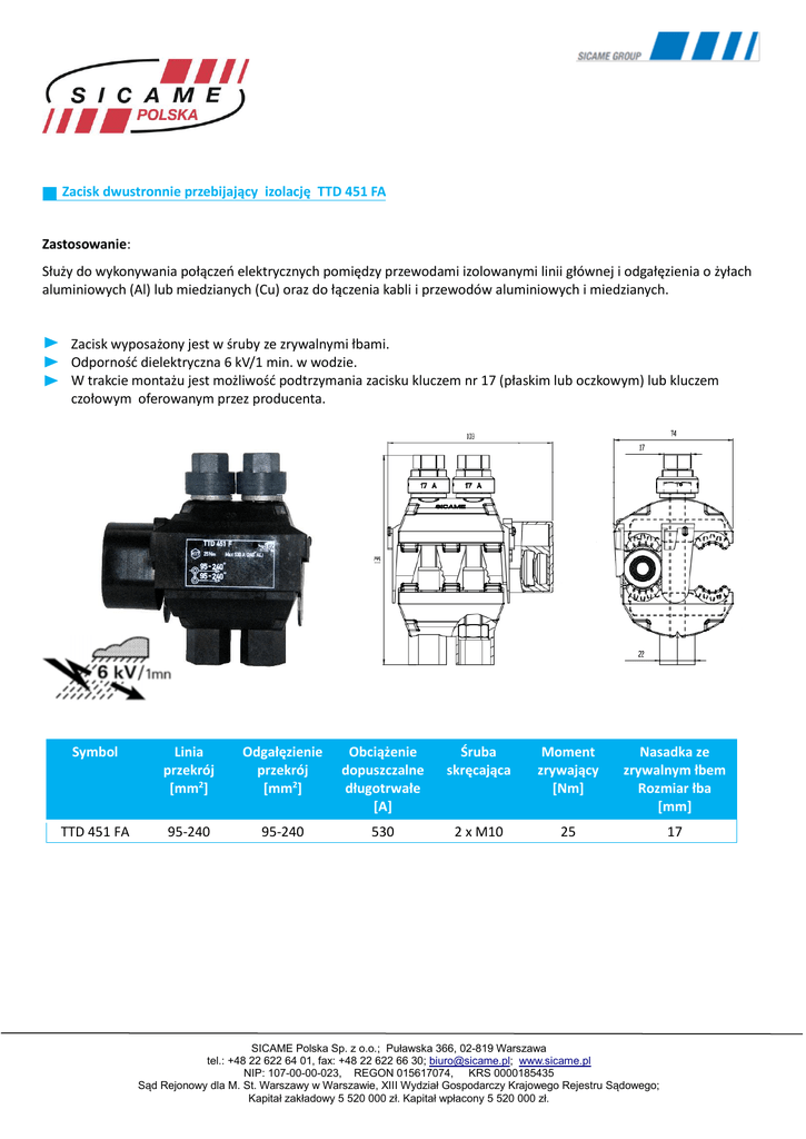 Zacisk dwustronnie przebijający izolację TTD 451 FA Zastosowanie: Służy do wykonywania połączeń elektrycznych pomiędzy przewodami izolowanymi linii głównej i odgałęzienia o żyłach aluminiowych (Al) lub miedzianych (Cu) oraz do łączenia kabli i przewodów aluminiowych i miedzianych. Zacisk wyposażony jest w śruby ze zrywalnymi łbami. Odporność dielektryczna 6 kV/1 min. w wodzie. W trakcie montażu jest możliwość podtrzymania zacisku kluczem nr 17 (płaskim lub oczkowym) lub kluczem czołowym oferowanym przez producenta. Symbol Linia przekrój [mm2] Odgałęzienie przekrój [mm2] Obciążenie dopuszczalne długotrwałe [A] Śruba skręcająca Moment zrywający [Nm] Nasadka ze zrywalnym łbem Rozmiar łba [mm] TTD 451 FA 95-240 95-240 530 2 x M10 25 17 SICAME Polska Sp. z o.o.; Puławska 366, 02-819 Warszawa tel.: +48 22 622 64 01, fax: +48 22 622 66 30; [email protected]; www.sicame.pl NIP: 107-00-00-023, REGON 015617074, KRS 0000185435 Sąd Rejonowy dla M. St. Warszawy w Warszawie, XIII Wydział Gospodarczy Krajowego Rejestru Sądowego; Kapitał zakładowy 5 520 000 zł. Kapitał wpłacony 5 520 000 zł.