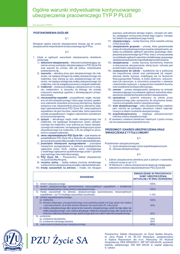 Ogólne warunki indywidualnie kontynuowanego ubezpieczenia pracowniczego TYP P PLUS Kod warunków: PTKP32 POSTANOWIENIA OGÓLNE §1 Niniejsze ogólne warunki ubezpieczenia stosuje siê do umów ubezpieczenia indywidualnie kontynuowanego typ P Plus. §2 1. U¿yte w ogólnych warunkach ubezpieczenia okreœlenia oznaczaj¹: 1) dokument ubezpieczenia – dokument potwierdzaj¹cy zawarcie umowy pomiêdzy ubezpieczaj¹cym a PZU ¯ycie SA oraz warunki tej umowy, taki jak polisa, indywidualne potwierdzenie itp., 2) macocha – aktualn¹ ¿onê ojca ubezpieczonego lub ma³¿onka, nie bêd¹c¹ biologiczn¹ matk¹ ubezpieczonego lub ma³¿onka, oraz wdowê po ojcu ubezpieczonego lub ma³¿onka, nie bêd¹c¹ biologiczn¹ matk¹ ubezpieczonego lub ma³¿onka, o ile nie wst¹pi³a ponownie w zwi¹zek ma³¿eñski, 3) ma³¿onek – osobê pozostaj¹c¹ z ubezpieczonym w zwi¹zku ma³¿eñskim, w stosunku do którego nie zosta³a orzeczona separacja zgodnie z obowi¹zuj¹cymi przepisami prawa, 4) nieszczêœliwy wypadek – przypadkowe, nag³e, niezale¿ne od woli ubezpieczonego i stanu jego zdrowia, gwa³towne zdarzenie wywo³ane przyczyn¹ zewnêtrzn¹, bêd¹ce wy³¹czn¹ oraz bezpoœredni¹ przyczyn¹ zdarzenia objêtego odpowiedzialnoœci¹ PZU ¯ycie SA, nieszczêœliwym wypadkiem nie jest choroba, nawet taka, która ujawniona zosta³a przypadkowym i nag³ym zdarzeniem wywo³anym przyczyn¹ zewnêtrzn¹, 5) ojczym – aktualnego mê¿a matki ubezpieczonego lub ma³¿onka, nie bêd¹cego biologicznym ojcem ubezpieczonego lub ma³¿onka, oraz wdowca po matce ubezpieczonego lub ma³¿onka, nie bêd¹cego biologicznym ojcem ubezpieczonego lub ma³¿onka, o ile nie wst¹pi³ on ponownie w zwi¹zek ma³¿eñski, 6) okres odpowiedzialnoœci PZU ¯ycie SA – czas trwania odpowiedzialnoœci PZU ¯ycie SA w stosunku do ubezpieczonego wyznaczony przez daty pocz¹tku i koñca odpowiedzialnoœci, 7) przeciêtne miesiêczne wynagrodzenie – przeciêtne miesiêczne wynagrodzenie w sektorze przedsiêbiorstw og³aszane przez GUS, wed³ug stanu wynikaj¹cego z ostatniego og³oszenia opublikowanego przed 1 grudnia poprzedniego roku kalendarzowego, 8) PZU ¯ycie SA – Powszechny Zak³ad Ubezpieczeñ na ¯ycie Spó³ka Akcyjna, 9) rocznica polisy – ka¿d¹ kolejn¹ rocznicê okreœlonego w dokumencie ubezpieczenia pocz¹tku odpowiedzialnoœci, 10) trwa³y uszczerbek na zdrowiu – trwa³e, nie rokuj¹ce poprawy uszkodzenie danego organu, narz¹du lub uk³adu, polegaj¹ce na fizycznej utracie tego organu, narz¹du lub uk³adu lub upoœledzeniu jego funkcji, 11) ubezpieczaj¹cy – osobê fizyczn¹, która zawar³a umowê z PZU ¯ycie SA, 12) ubezpieczenie grupowe – umowê, która gwarantowa³a prawo do indywidualnego kontynuowania ubezpieczenia, zawart¹ na podstawie ogólnych warunków grupowego ubezpieczenia pracowniczego typ P Plus, wraz z umow¹ zawart¹ na podstawie ogólnych warunków dodatkowego grupowego ubezpieczenia prawa do indywidualnego kontynuowania, 13) ubezpieczony – osobê fizyczn¹ wymienion¹ imiennie w dokumencie ubezpieczenia, której ¿ycie i zdrowie jest przedmiotem ubezpieczenia, 14) uczêszczanie do szko³y – kszta³cenie siê w publicznej lub niepublicznej szkole oraz pañstwowej lub niepañstwowej szkole wy¿szej, znajduj¹cej siê na terytorium Rzeczypospolitej Polskiej, w trybie dziennym, wieczorowym lub zaocznym, w rozumieniu przepisów o oœwiacie i szkolnictwie wy¿szym, z wy³¹czeniem wszelkich kursów oraz kszta³cenia korespondencyjnego, 15) umowa – umowê ubezpieczenia zawieran¹ na wniosek ubezpieczaj¹cego na podstawie ogólnych warunków ubezpieczenia i potwierdzon¹ dokumentem ubezpieczenia, 16) uposa¿ony – podmiot wskazany na piœmie przez ubezpieczonego jako uprawniony do otrzymania œwiadczenia w przypadku œmierci ubezpieczonego, 17) wiek ubezpieczonego – wiek ubezpieczonego ustalony jako ró¿nica lat pomiêdzy aktualnym rokiem kalendarzowym a rokiem urodzenia ubezpieczonego, 18) wspó³ubezpieczony – objêtego ubezpieczeniem cz³onka rodziny ubezpieczonego. 2. W zasadach ustalania œwiadczeñ nale¿nych z tytu³u umowy nie ma zastosowania stopa techniczna. PRZEDMIOT I ZAKRES UBEZPIECZENIA ORAZ ŒWIADCZENIA Z TYTU£U UMOWY §3 Przedmiotem ubezpieczenia jest: 1) ¿ycie ubezpieczonego i ¿ycie wspó³ubezpieczonych, 2) zdrowie ubezpieczonego. §4 1. Zakres ubezpieczenia okreœlony jest w jednym z wariantów, o których mowa w ust. 2 i 3. 2. W Wariancie 1 zakres ubezpieczenia obejmuje nastêpuj¹ce zdarzenia w okresie odpowiedzialnoœci PZU ¯ycie SA: ŒWIADCZENIE W PROCENTACH SUMY UBEZPIECZENIA AKTUALNEJ W DNIU ZDARZENIA ZDARZENIE 1) œmieræ ubezpieczonego 2) œmieræ ubezpieczonego spowodowana nieszczêœliwym wypadkiem – dodatkowo oprócz œwiadczenia z tytu³u œmierci ubezpieczonego 3) trwa³y uszczerbek na zdrowiu ubezpieczonego spowodowany nieszczêœliwym wypadkiem – za 1% trwa³ego uszczerbku na zdrowiu 4) œmieræ wspó³ubezpieczonego: a) ma³¿onka b) dziecka w³asnego, przysposobionego oraz pasierba (je¿eli nie ¿yje ojciec lub matka) – pod warunkiem, ¿e w dniu œmierci dziecko nie ukoñczy³o 25. roku ¿ycia c) rodzica ubezpieczonego albo ojczyma lub macochy ubezpieczonego, je¿eli nie ¿yje ojciec lub matka ubezpieczonego, oraz rodzica aktualnego ma³¿onka ubezpieczonego albo ojczyma lub macochy ma³¿onka ubezpieczonego, je¿eli nie ¿yje ojciec lub matka ma³¿onka ubezpieczonego 5) urodzenie: a) urodzenie siê dziecka b) urodzenie martwego dziecka 6) osierocenie dziecka przez ubezpieczonego 100% 100% 1–4% 100% 30% 20% 10% 20% 40% Powszechny Zak³ad Ubezpieczeñ na ¯ycie Spó³ka Akcyjna, al. Jana Paw³a II 24, 00-133 Warszawa, zarejestrowana w S¹dzie Rejonowym dla m.st. Warszawy XII Wydzia³ Gospodarczy, KRS 0000030211, NIP 527-020-60-56, wysokoœæ kapita³u zak³adowego: 295 000 000,00 z³, kapita³ wp³acony w ca³oœci 3. W Wariancie 2 zakres ubezpieczenia obejmuje nastêpuj¹ce zdarzenia w okresie odpowiedzialnoœci 