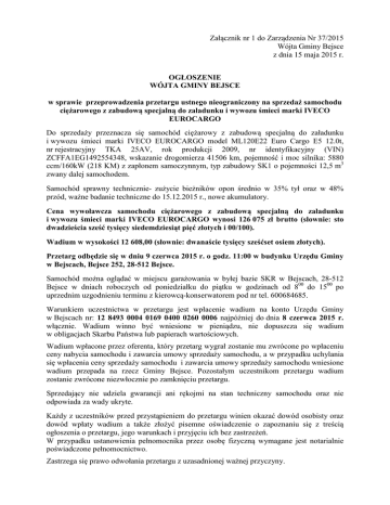 Załącznik nr 1 do Zarządzenia Nr 37/2015 Wójta Gminy Bejsce z dnia 15 maja 2015 r. OGŁOSZENIE WÓJTA GMINY BEJSCE w sprawie przeprowadzenia przetargu ustnego nieograniczony na sprzedaż samochodu ciężarowego z zabudową specjalną do załadunku i wywozu śmieci marki IVECO EUROCARGO Do sprzedaży przeznacza się samochód ciężarowy z zabudową specjalną do załadunku i wywozu śmieci marki IVECO EUROCARGO model ML120E22 Euro Cargo E5 12.0t, nr rejestracyjny TKA 25AV, rok produkcji 2009, nr identyfikacyjny (VIN) ZCFFA1EG1492554348, wskazanie drogomierza 41506 km, pojemność i moc silnika: 5880 ccm/160kW (218 KM) z zapłonem samoczynnym, typ zabudowy SK1 o pojemności 12,5 m3 zwany dalej samochodem. Samochód sprawny technicznie- zużycie bieżników opon średnio w 35% tył oraz w 48% przód, ważne badanie techniczne do 15.12.2015 r., nowe akumulatory. Cena wywoławcza samochodu ciężarowego z zabudową specjalną do załadunku i wywozu śmieci marki IVECO EUROCARGO wynosi 126 075 zł brutto (słownie: sto dwadzieścia sześć tysięcy siedemdziesiąt pięć złotych i 00/100). Wadium w wysokości 12 608,00 (słownie: dwanaście tysięcy sześćset osiem złotych). Przetarg odbędzie się w dniu 9 czerwca 2015 r. o godz. 11:00 w budynku Urzędu Gminy w Bejscach, Bejsce 252, 28-512 Bejsce. Samochód można oglądać w miejscu garażowania w byłej bazie SKR w Bejscach, 28-512 Bejsce w dniach roboczych od poniedziałku do piątku w godzinach od 800 do 1500 po uprzednim uzgodnieniu terminu z kierowcą-konserwatorem pod nr tel. 600684685. Warunkiem uczestnictwa w przetargu jest wpłacenie wadium na konto Urzędu Gminy w Bejscach nr: 12 8493 0004 0169 0400 0260 0006 najpóźniej do dnia 8 czerwca 2015 r. włącznie. Wadium winno być wniesione w pieniądzu, nie dopuszcza się wadium w obligacjach Skarbu Państwa lub papierach wartościowych. Wadium wpłacone przez oferenta, który przetarg wygrał zostanie mu zwrócone po wpłaceniu ceny nabycia samochodu i zawarcia umowy sprzedaży samochodu, a w przypadku uchylania się wpłacenia ceny sprzedaży samochodu i zawarcia umowy sprzedaży samochodu wniesione wadium przepada na rzecz Gminy Bejsce. Pozostałym uczestnikom przetargu wadium zostanie zwrócone niezwłocznie po zamknięciu przetargu. Sprzedający nie udziela gwarancji ani rękojmi na stan techniczny samochodu oraz nie odpowiada za wady ukryte. Każdy z uczestników przed przystąpieniem do przetargu winien okazać dowód osobisty oraz dowód wpłaty wadium a także złożyć pisemne oświadczenie o zapoznaniu się z treścią ogłoszenia o przetargu, jego warunkach i przyjęciu ich bez zastrzeżeń. W przypadku ustanowienia pełnomocnika przez osobę fizyczną wymagane jest notarialnie poświadczone pełnomocnictwo. Zastrzega się prawo odwołania przetargu z uzasadnionej ważnej przyczyny. Szczegółowe informacje można uzyskać w siedzibie Urzędu Gminy Bejsce , pokój nr 8 oraz pod nr tel. 3511010 wew. 30. Zdjęcia pojazdu dostępne są do obejrzenia na stronie internetowej www.bejsce.eu/smieciarka .