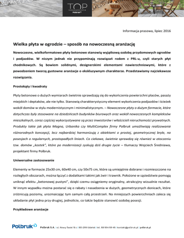 Informacja prasowa, lipiec 2016 Wielka płyta w ogrodzie – sposób na nowoczesną aranżację Nowoczesne, wielkoformatowe płyty betonowe stanowią wyjątkową ozdobę przydomowych ogrodów i podjazdów. W niczym jednak nie przypominają rozwiązań rodem z PRL-u, czyli starych płyt chodnikowych. Są bowiem solidnymi, designerskimi elementami nawierzchniowymi, które z powodzeniem tworzą gustowne aranżacje o ekskluzywnym charakterze. Przedstawiamy najciekawsze rozwiązania. Prostokąty i kwadraty Płyty betonowe o dużych wymiarach świetnie sprawdzają się do wykończenia powierzchni placów, pasaży miejskich i deptaków, ale nie tylko. Stanowią charakterystyczny element wykończenia podjazdów i ścieżek wokół domów w stylu modernistycznym i minimalistycznym. – Nowoczesne płyty o dużym formacie, które dotychczas były stosowane na dziedzińcach budynków biurowych oraz wokół nowoczesnych kompleksów mieszkalnych, coraz częściej wykorzystywane są przez inwestorów i właścicieli nieruchomości prywatnych. Produkty takie jak płyta Magna, Urbanika czy MultiComplex firmy Polbruk umożliwiają realizowanie różnorodnych koncepcji, lecz najbardziej harmonizują z obiektami o prostej, geometrycznej bryle, na posesjach o regularnych, prostopadłych liniach. Co ciekawe, świetnie sprawdzą się również w otoczeniu tzw. domów „kostek”, które po modernizacji zyskują dziś drugie życie – tłumaczy Wojciech Średniawa, projektant firmy Polbruk. Uniwersalne zastosowanie Elementy w formacie 25x30 cm, 60x40 cm, czy 50x75 cm, które są umiejętnie dobrane i rozmieszczone na rozległych obszarach, można łączyć z dodatkami takimi jak żwir i trawnik. Położone w sąsiedztwie pomogą uniknąć efektu „betonowej pustyni”, dzięki czemu osiągniemy oryginalny, atrakcyjny wizualnie rezultat. W innym wypadku można postarać się o rabaty i nasadzenia w dużych, geometrycznych donicach, które zróżnicują poziomy, urozmaicając tym samym całą przestrzeń. Na mniejszych powierzchniach zaleca się układanie płyt jedna przy drugiej, jednolicie, co także będzie stanowić ozdobę posesji. Przykładowe aranżacje Polbruk Magna o wymiarach 50x75 cm i grubości 10 cm w kolorze nerino, zachwyca gładką fakturą i tonacją melanżowych szarości. W świetny sposób dopełnia posesję nowoczesnego domu jednorodzinnego o prostych liniach. W rezultacie nawierzchnia harmonizuje z całym projektem tak pod względem koloru, jak i kształtu. Podobnie jest w przypadku płyt MultiComplex (nowość w ofercie firmy Polbruk), które dostępne są w wymiarach 20x40 cm, 40x40 cm, 60x40 cm i grubości 6 cm. Z jej pomocą stworzymy różnego rodzaju rozwiązania przestrzenne: niepowtarzalne aranżacje na tarasie, rozległe podjazdy czy ścieżki przydomowe i obejścia. Kostka dostępna jest w trzech różnych kolorach: latte, nerino i mokka. Z kolei Polbruk Urbanika, która dostępna jest w dwóch fakturach (gładka, płukana), dziesięciu kolorach i trzech wymiarach (15x30 cm, 20x30 cm, 25x30 cm; grubość 8 cm), tworzy atrakcyjne otoczenie budynków na Osiedlu Rainbow w Krakowie (tu w fakturze płukanej). W ostatnim czasie Polbruk Urbanika uświetniła także aranżacje posesji budynków Archiwum Państwowego w Rzeszowie i Teatru Muzycznego w Lublinie, co tylko potwierdza wszechstronność tego produktu. Ponadto duża grubość wymienionych płyt oraz ich dostępność w wielu różnych kolorach i fakturach pozwala uzupełniać atrakcyjne aranżacje, tak pod względem estetycznym, jak i technicznym, tworząc solidne i odporne na duże obciążenia nawierzchnie. Elementy o gładkiej fakturze dodatkowo zapewniają łatwość utrzymania powierzchni w czystości. Więcej o produktach firmy Polbruk na: www.polbruk.pl oraz www.facebook.com/Polbruk. www.polbruk.pl -O firmie polbruk.pl facebook.com/polbruk pinterest.com/polbruk/ googleplus.polbruk.pl/ Kontakt: Katarzyna Stankiewicz, Specjalista ds. Marketingu tel.: 605 634 591 e-mail: [email protected] Kontakt dla mediów: Mateusz Byś, Key Account Manager tel. 722 344 837 e-mail: [email protected]