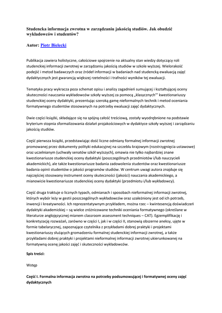 Studencka informacja zwrotna w zarządzaniu jakością studiów. Jak obudzić wykładowców i studentów? Autor: Piotr Bielecki Publikacja zawiera holistyczne, całościowe spojrzenie na aktualny stan wiedzy dotyczący roli studenckiej informacji zwrotnej w zarządzaniu jakością studiów w szkole wyższej. Wielorakość podejść i metod badawczych oraz źródeł informacji w badaniach nad studencką ewaluacją zajęć dydaktycznych jest gwarancją większej rzetelności i trafności wyników tej ewaluacji. Tematyka pracy wykracza poza schemat opisu i analizy zagadnień sumującej i kształtującej oceny skuteczności nauczania wykładowców szkoły wyższej za pomocą „klasycznych’” kwestionariuszy studenckiej oceny dydaktyki, prezentując szeroką gamę nieformalnych technik i metod oceniania formatywnego studentów stosowanych na potrzeby ewaluacji zajęć dydaktycznych. Dwie części książki, składające się na spójną całość treściową, zostały wyodrębnione na podstawie kryterium stopnia sformalizowania działań projakościowych w dydaktyce szkoły wyższej i zarządzaniu jakością studiów. Część pierwsza książki, przedstawiając dość liczne odmiany formalnej informacji zwrotnej promowanej przez dokumenty polityki edukacyjnej na szczeblu krajowym (rozstrzygnięcia ustawowe) oraz uczelnianym (uchwały senatów szkół wyższych), omawia nie tylko najbardziej znane kwestionariusze studenckiej oceny dydaktyki (poszczególnych przedmiotów i/lub nauczycieli akademickich), ale także kwestionariusze badania zadowolenia studentów oraz kwestionariusze badania opinii studentów o jakości programów studiów. W centrum uwagi autora znajduje się najczęściej stosowany instrument oceny skuteczności (jakości) nauczania akademickiego, a mianowicie kwestionariusze studenckiej oceny dydaktyki (przedmiotu i/lub wykładowcy). Część druga traktuje o licznych typach, odmianach i sposobach nieformalnej informacji zwrotnej, których wybór leży w gestii poszczególnych wykładowców oraz uzależniony jest od ich potrzeb, inwencji i kreatywności. Ich reprezentatywnym przykładem, można rzec – kwintesencją doświadczeń dydaktyki akademickiej – są wielce zróżnicowane techniki oceniania formatywnego (określane w literaturze anglojęzycznej mianem classroom assessment techniques – CAT). Egzemplifikację i konkretyzację rozważań, zarówno w części I, jak i w części II, stanowią obszerne aneksy, ujęte w formie tabelarycznej, zapoznające czytelnika z przykładami dobrej praktyki i projektami kwestionariuszy służących gromadzeniu formalnej studenckiej informacji zwrotnej, a także przykładami dobrej praktyki i projektami nieformalnej informacji zwrotnej ukierunkowanej na formatywną ocenę jakości zajęć i skuteczności wykładowców. Spis treści: Wstęp Część I. Formalna informacja zwrotna na potrzeby podsumowującej i formatywnej oceny zajęć dydaktycznych Rozdział I. Wprowadzenie: studencka informacja zwrotna w kontekście zmian w szkolnictwie wyższym Rozdział II. Dyskusja na temat celów informacji zwrotnej od studentów Rozdział III. Decyzje dotyczące wyboru mechanizmu informacji zwrotnej od studentów Rozdział IV. Gromadzenie i analiza danych w badaniach wykorzystujących kwestionariusze ankietowe Rozdział V. Internetowy system oceny zajęć dydaktycznych Rozdział VI. Upublicznienie i upowszechnienie rezultatów ocen studenckich i działań poewaluacyjnych Rozdział VII. Konkluzje Aneks I. Przykłady dobrej praktyki i projekty: kwestionariusze służące gromadzeniu studenckiej informacji zwrotnej Część II. Nieformalna informacja zwrotna na potrzeby formatywnej oceny zajęć dydaktycznych Rozdział VIII. Wprowadzenie: nieformalna informacja zwrotna kluczem do sukcesu dydaktycznego wykładowcy i sukcesu akademickiego studentów Rozdział IX. Charakterystyka wybranych technik i metod nieformalnej studenckiej informacji zwrotnej 9.1. Techniki oceniania formatywnego jako przedmiot badań nad oceną zajęć dydaktycznych (classroom research) 9.2. Techniki służące ocenianiu wiedzy i umiejętności związanych z danym przedmiotem 9.2.1. Sonda uprzednio nabytej wiedzy (Background Knowledge Probe) 9.2.2. Jednominutowa wypowiedź (One-Minute Paper) 9.2.3. Schemat ? gur geometrycznych (Shape Frameworks) 9.2.4. Lista słów kluczowych (Focused Listing) 9.2.5. Niekompletne konspekty (Empty Outlines) 9.2.6. Macierz pamięci (Memory Matrix) 9.2.7. Najbardziej niejasny punkt zajęć (The Muddiest Point) 9.2.8. Streszczanie (Summarizing) 9.2.9. Karta KWL/KWHL (KWL/KWHL Chart) 9.2.10. Macierz kategoryzacji (Categorizing Grid) 9.2.11. Macierz cech wyróżniających (De? ning Features Matrix) 9.2.12. Macierz argumentów „za i przeciw” (Pro and Con Grid) 9.2.13. Jednozdaniowe podsumowanie (One-Sentence Summary) 9.2.14. Przybliżone analogie (Approximate Analogies) 9.2.15. Mapy myśli/umysłu (Concept Maps/Mind Maps) 9.2.16. Jaka jest zasada? (What’s the Principle) 9.2.17. Udokumentowane rozwiązania problemu (Documented Problem Solutions) 9.2.18. Ukierunkowane parafrazowanie (Directed Paraphrasing) 9.2.19. Karty zastosowań praktycznych (Application Cards) 9.3. Techniki służące ocenianiu postaw, wartości i samoświadomości studenta 9.3.1. Reguła podwójnego zapisu (Double-Entry Journals) 9.3.2. Kwestionariusz pewności swoich umiejętności związanych z przedmiotem (Course-Related SelfCon? dence Surveys) 9.3.3. Listy kontrolne (Checklists) 9.3.3.1. Zapis pewności swojej wiedzy (Confidence Logs) 9.3.3.2. Treść poszczególnych zajęć (Content in a Single Sessions) 9.3.3.3. Macierz nauczania i uczenia się (Teaching and Learning Matrix) 9.3.4. Gradacja i zgodność celów kształcenia (Goal Ranking and Matching) 9.3.5. Samoocena stylów uczenia się (Self-assessment of Ways of Learning) 9.3.6. Wykłady przerywane (Punctuated Lectures) 9.4. Techniki służące ocenianiu reakcji studenta na oddziaływania dydaktyczne 9.4.1. Ła