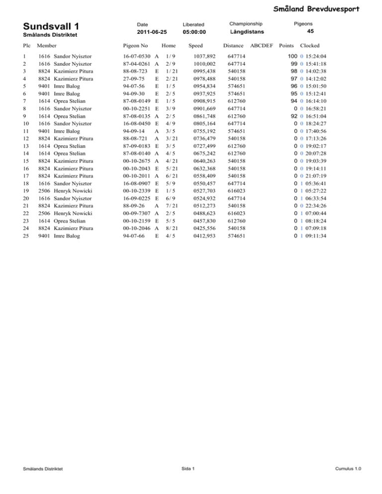 Småland Brevduvesport Sundsvall 1 Smålands Distriktet Date Liberated Championship 2011-06-25 05:00:00 Långdistans Plc Member Pigeon No 1 2 3 4 5 6 7 8 9 10 11 12 13 14 15 16 17 18 19 20 21 22 23 24 25 1616 1616 8824 8824 9401 9401 1614 1616 1614 1616 9401 8824 1614 1614 8824 8824 8824 1616 2506 1616 8824 2506 1614 8824 9401 16-07-0530 87-04-0261 88-08-723 27-09-75 94-07-56 94-09-30 87-08-0149 00-10-2251 87-08-0135 16-08-0450 94-09-14 88-08-721 87-09-0183 87-08-0140 00-10-2675 00-10-2043 00-10-2011 16-08-0907 00-10-2339 16-09-0225 88-09-26 00-09-7307 00-10-2159 00-10-2046 94-07-66 Sandor Nyisztor Sandor Nyisztor Kazimierz Pitura Kazimierz Pitura Imre Balog Imre Balog Oprea Stelian Sandor Nyisztor Oprea Stelian Sandor Nyisztor Imre Balog Kazimierz Pitura Oprea Stelian Oprea Stelian Kazimierz Pitura Kazimierz Pitura Kazimierz Pitura Sandor Nyisztor Henryk Nowicki Sandor Nyisztor Kazimierz Pitura Henryk Nowicki Oprea Stelian Kazimierz Pitura Imre Balog Smålands Distriktet Home A A E E E E E E A E A A E A A E A E E E A A E A E 1/ 9 2/ 9 1 / 21 2 / 21 1/ 5 2/ 5 1/ 5 3/ 9 2/ 5 4/ 9 3/ 5 3 / 21 3/ 5 4/ 5 4 / 21 5 / 21 6 / 21 5/ 9 1/ 5 6/ 9 7 / 21 2/ 5 5/ 5 8 / 21 4/ 5 Speed 1037,892 1010,002 0995,438 0978,488 0954,834 0937,925 0908,915 0901,669 0861,748 0805,164 0755,192 0736,479 0727,499 0675,242 0640,263 0632,368 0558,409 0550,457 0527,703 0524,932 0512,273 0488,623 0457,830 0425,556 0412,953 Sida 1 Distance 647714 647714 540158 540158 574651 574651 612760 647714 612760 647714 574651 540158 612760 612760 540158 540158 540158 647714 616023 647714 540158 616023 612760 540158 574651 ABCDE F Pigeons 45 Points 100 99 98 97 96 95 94 0 92 0 0 0 0 0 0 0 0 0 0 0 0 0 0 0 0 Clocked 0 0 0 0 0 0 0 0 0 0 0 0 0 0 0 0 0 1 1 1 0 1 1 1 1 15:24:04 15:41:18 14:02:38 14:12:02 15:01:50 15:12:41 16:14:10 16:58:21 16:51:04 18:24:27 17:40:56 17:13:26 19:02:17 20:07:28 19:03:39 19:14:11 21:07:19 05:36:41 05:27:22 06:33:54 22:34:26 07:00:44 08:18:24 07:09:18 09:11:34 Cumulus 1.0