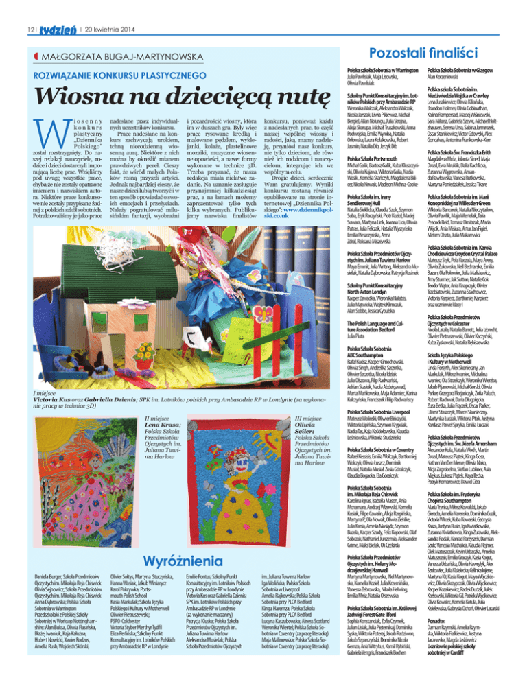 20 kwietnia 2014 12 Pozostali finaliści MAŁGORZATA BUGAJ-MARTYNOWSKA ROZWIĄZANIE KONKURSU PLASTYCZNEGO Wiosna na dziecięcą nutę W iosenny konkurs plastyczny „Dziennika Polskiego” został rozstrzygnięty. Do naszej redakcji nauczyciele, rodzice i dzieci dostarczyli imponującą liczbę prac. Wzięliśmy pod uwagę wszystkie prace, chyba że nie zostały opatrzone imieniem i nazwiskiem autora. Niektóre prace konkursowe nie zostały przypisane żadnej z polskich szkół sobotnich. Potraktowaliśmy je jako prace nadesłane przez indywidualnych uczestników konkursu. Prace nadesłane na konkurs zachwycają urokiem, tchną niecodzienną wiosenną aurą. Niektóre z nich można by określić mianem prawdziwych pereł. Cieszy fakt, że wśród małych Polaków rosną przyszli artyści. Jednak najbardziej cieszy, że nasze dzieci lubią tworzyć i w ten sposób opowiadać o swoich emocjach i przeżyciach. Należy pogratulować milusińskim fantazji, wyobraźni i pozazdrościć wiosny, która im w duszach gra. Były więc prace rysowane kredką i malowane pędzlem, wyklejanki, kolaże, plastelinowe mozaiki, muzyczne wiosenne opowieści, a nawet formy wykonane w technice 3D. Trzeba przyznać, że nasza redakcja miała niełatwe zadanie. Na uznanie zasługuje przynajmniej kilkadziesiąt prac, a na łamach możemy zaprezentować tylko tych kilka wybranych. Publikujemy nazwiska finalistów konkursu, ponieważ każda z nadesłanych prac, to część naszej wspólnej wiosny i radości, jaką, mamy nadzieję, przyniósł nasz konkurs, nie tylko dzieciom, ale również ich rodzicom i nauczycielom, integrując ich we wspólnym celu. Drogie dzieci, serdecznie Wam gratulujemy. Wyniki konkursu zostaną również opublikowane na stronie internetowej „Dziennika Polskiego”: www.dziennikpolski.co.uk Polska szkoła Sobotnia w Warrington Julia Pawlisiak, Maja Lisowska, Oliwia Pawlisiak Szkolny Punkt Konsultacyjny im. Lotników Polskich przy Ambasadzie RP WeronikaWalczak, AleksandraWalczak, Nicola Jarszak, Liwia Pikiewicz, Michał Bergiel, Allan Nolungu, Julia Strojna, Alicja Skorupa, Michał,Truszkowski, Anna Podwojska, EmiliaWyroba, Natalia Orłowska, Laura Kołakowska, Robert Jasmin, Natalia Dib, Jerzyk Dib Polska Szkoła Św. Franciszka Erith Magdalena Mróz, Jolanta Sined, Maja Drozd, Ewa Mruklik, Dalia Kachlicka, ZuzannaWągrowska, Amanda Pawłowska,Vanesa Rutkowska, Martyna Poniedziałek, JessicaTikare Polska Szkoła im. Ireny Sendlerowej Hull Natalia Sieklicka, Klaudia Szulc, Szymon Suba, Eryk Raczyński, Piotr Kozioł, Maciej Suwara, Martyna Link, Joanna Lica, Oliwia Putras, Julia Felczak, NataliaWyszyńska Emilia Pieszczyńska, Anna Zdral, Roksana Miszewska Polska Szkoła Sobotnia im. Marii Konopnickiej na Willesden Green Wiktoria Bancerek, Natalia Nieczytailow, Oliwia Pawlik, MajaWiertelak,Talia Peacock Reid,Tomasz Dmitrzak, Maria Wójcik, Ania Misiura, Artur Jan Figiel, Miriam Olszta, Julia Makarewicz Szkolny Punkt Konsultacyjny North-Acton Londyn Kacper Zawadka,Weronika Hałabis, Julia Mątwicka,Wojtek Klimczuk, Alan Sobbe, Jessica Cybulska The Polish Language and Culture Association Bedford Julia Pluta a II miejsce Lena Krasa; Polska Szkoła Przedmiotów Ojczystych im. Juliana Tuwima Harlow III miejsce Oliwia Seiler; Polska Szkoła Przedmiotów Ojczystych im. Juliana Tuwima Harlow Polska Szkoła Sobotnia ABC Southampton Rafał Kucisz, Kacper Cimochowski, Oliwia Singh, Andżelika Szczotka, Oliwier Szczotka, Nicola Idziak Julia Olszowa, Filip Radwański, Adrian Stasiuk, Nadia Abdelgawad, Marta Mańkowska, Maja Adamiec, Karina Kulczyńska, Franciszek i Filip Radwańscy Polska Szkoła Sobotnia Liverpool MateuszWolinski, Oliwier Bińczycki, Wiktoria Lipińska, Szymon Krypciak, NadiaTas, Kaja Kościołowska, Klaudia Leśniowska,Wiktoria Studzińska Polska Szkoła Sobotnia w Coventry Rafael Kessisis, EmiliaWolczyk, Bartłomiej Wolczyk, Oliwia Łuszcz, Dominik Musiał, Natalia Musiał, Zosia Góralczyk, Claudia Bogacka, Ela Góralczyk Polska Szkoła Sobotnia im. Mikołaja Reja Chiswick Karolina Ignas, Isabella Mason, Ania Mcnamara, AndrzejWizowski, Kornelia Kusiak, Filipe Cawalin, Alicja Rzepińska, Martyna P., Ola Nowak, Oliwia Ziehlke, Julia Kania, Amelia Mosiądz, Szymon Bazela, Kacper Szudy, Felix Kopowski, Olaf Sobczak, Nathaniel Jurczemia, Aleksander Grime, Maks Bielak, Oli Czekirda Wyróżnienia Daniela Burger; Szkoła Przedmiotów Ojczystych im. Mikołaja Reja Chiswick Olivia Sejnowicz; Szkoła Przedmiotów Ojczystych im. Mikołaja Reja Chiswick Anna Dąbrowska; Polska Szkoła Sobotnia w Warrington Przedszkolaki z Polskiej Szkoły Sobotniej w Worksop Nottinghamshire: Alan Buksa, Oliwia Flasińska, Błażej Iwaniuk, Kaja Kałużna, Hubert Nowicki, Xavier Rodzos, Amelia Rush, Wojciech Skórski, Olivier Sołtys, Martyna Stuczyńska, Hanna Wasiak, Jakub Winiarycz Karol Pokrywka; Portsmouth Polish School Kasia Markulak; Szkoła Języka Polskiego i Kultury w Motherwell Oliwier Pietruszewski; PSPO Colchester Victoria Styber Merthyr Tydfil Eliza Perlińska; Szkolny Punkt Konsultacyjny im. Lotników Polskich przy Ambasadzie RP w Londynie Emilie Pontus; Szkolny Punkt Konsultacyjny im. Lotników Polskich przy Ambasadzie RP w Londynie Victoria Kus oraz Gabriella Dzienis; SPK im. Lotników Polskich przy Ambasadzie RP w Londynie (za wykonanie marzanny) Patrycja Kluska; Polska Szkoła Przedmiotów Ojczystych im. Juliana Tuwima Harlow Aleksandra Musielak; Polska Szkoła Przedmiotów Ojczystych im. Juliana Tuwima Harlow Iga Wolińska; Polska Szkoła Sobotnia w Liverpool Amelia Rajkowska; Polska Szkoła Sobotnia przy PLCA Bedford Kinga Haremza; Polska Szkoła Sobotnia przy PLCA Bedford Lucyna Kaszubowska; Alness Scotland Weronika Wiertel; Polska Szkoła Sobotnia w Coventry (za pracę literacką) Maja Malinowska; Polska Szkoła Sobotnia w Coventry (za pracę literacką). Polska szkoła Sobotnia im. Niedźwiedzia Wojtka w Crawley Lena Juszkiewicz, Oliwia Kiliańska, Brandon Holmes, Olivia Gobinathan, Kalina