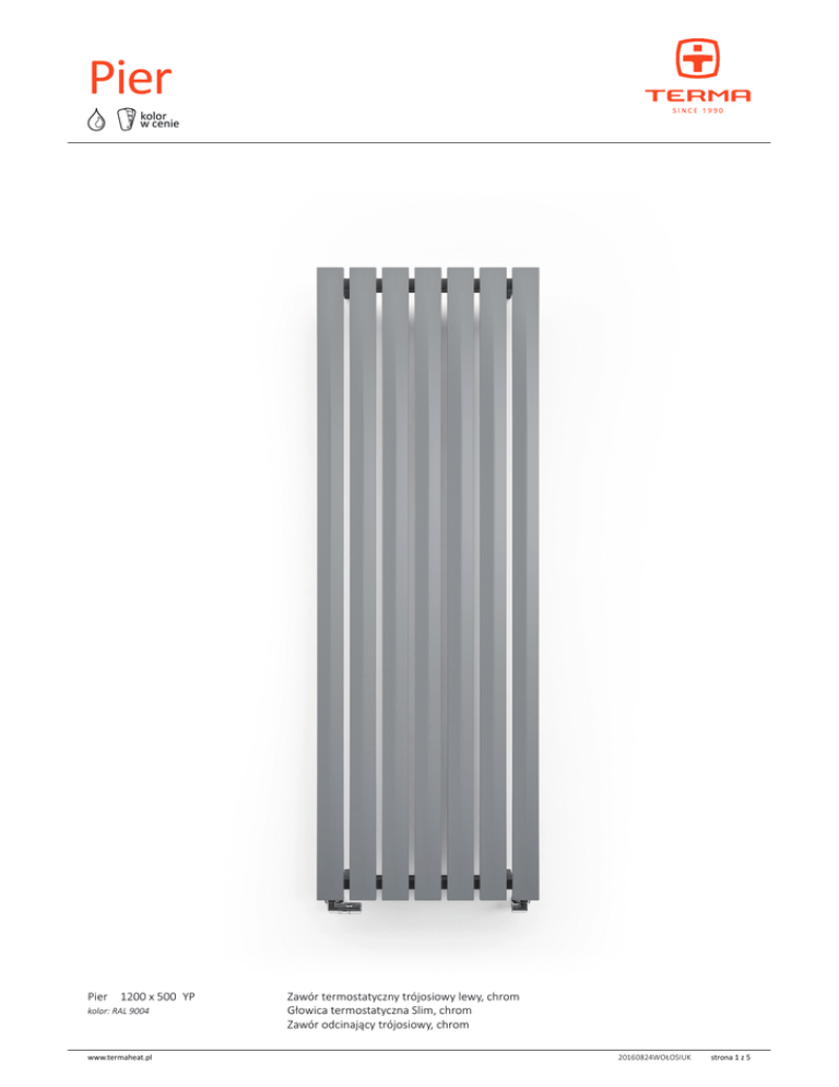 Pier kolor w cenie Pier 1200 x 500 YP kolor: RAL 9004 www.termaheat.pl Zawór termostatyczny trójosiowy lewy, chrom Głowica termostatyczna Slim, chrom Zawór odcinający trójosiowy, chrom 20160824WOŁOSIUK strona 1 z 5 Pier kolor w cenie projekt: Terma Polecamy: Podłączenia: a165] Zestaw trójosiowy termostatyczny dla podłączenia SX Zestaw maskujący pojedynczy Dostępne rozmiary: 5 5 1380 x 410 ↕ 7 1680 x 410 ↔ 1800 x 580 Specyfikacja: Ciśnienie robocze: 1,0 MPa Maksymalna temperatura pracy: 95°C g p v Kod A B C2 75|65|20°C 55|45|20°C D E F ↕ ↔ [mm] [W] [W] [W] [mm] [mm] [mm] [dm³] [kg] (konfiguracja s. 4) 1380 410 303 564 303 — 255 1310 35 6,81 17,7 WGB19138041 1680 410 360 687 360 — 255 1610 35 8,26 21,0 WGB19168041 1800 580 532 1025 532 — 425 1730 35 12,50 31,4 WGB19180058 www.termaheat.pl produktu 20160824WOŁOSIUK strona 2 z 5 Pier kolor w cenie SX G1/2" 57 ÷ 65 G1/2" C2 B D 107 ÷ 115 G1/2" G1/2" G1/2" G1/2" 4545 SX SX C2 C2 95 95 EE AA A B B D D 30 30 11 70 FF A – wysokość B – szerokość C1-C5 – rozstaw podłączeń D – rozstaw konsol w poziomie E – rozstaw konsol w pionie, F – odległość od osi dolnej konsoli do dolnej krawędzi kolektora Kolektor: Profil: 30 30 3030 1111 70 70 www.termaheat.pl 20160824WOŁOSIUK bl19-techniczny 2015.10.21 berda strona 3 z 5 Pier kolor w cenie W tabelach przy kartach technicznych produktów umieszczone są kody produktów, które dostarczają podstawowych informacji o produktach. W celu doprecyzowania właściwości produktu kody produktów należy uzupełnić o pełny kod konfiguracji. Kod konfiguracji należy umieścić w ciągu znaków po kodzie produktu jak w przykładzie poniżej: Budowa kodu konfiguracji grzejnika c.o. WGALE054030 K916SX KOD KARTOTEKI (umieszczony w tabeli przy produkcie) KOD KONFIGURACJI (uzupełniany ręcznie) Konfiguracja K 916 SX kod opakowania kod koloru kod podłączenia K - karton Proszkowy podkład cynkowy C – kod proszkowego podkładu cynkowego uzupełniany jest w kodzie nietypowości. WLALE054030 K916SX C www.termaheat.pl kod nietypowości 20160824WOŁOSIUK strona 4 z 5 Pier kolor w cenie Legenda Grzejnik dostępny w wersji c.o. Grzejnik przystosowany do pracy jako grzejnik c.o. z podłączoną grzałką elektryczną. Grzejnik dostępny w wersji elektrycznej z przewodem grzejnym lub z czynnikiem grzewczym i grzałką. Produkt fabrycznie przetestowany i gotowy do użytku. Cr Grzejnik dostępny w wersji chromowanej. Podstawowy wariant podłączenia grzejnika. Ikona wskazuje sposób zasilania oraz powrotu wody w danym podłączeniu, umiejscowienie wkładki termostatycznej i grzałki, jeśli istnieje możliwość ich zamontowania. Typ podłączenia opcjonalnego dla danego grzejnika. Moc grzejnika elektrycznego lub sugerowana moc grzałki przeznaczonej do grzejnika c.o. Waga. Pojemność. www.termaheat.pl 20160824WOŁOSIUK strona 5 z 5