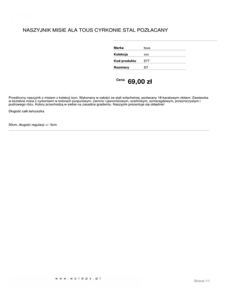 NASZYJNIK MISIE ALA TOUS CYRKONIE STAL POZŁACANY Marka tous Kolekcja xxx Kod produktu 577 Rozmiary ST Cena 69,00 zł Prześliczny naszyjnik z misiem z kolekcji icon. Wykonany w całości ze stali szlachetnej, pozłacany 18-karatowym złotem. Zawieszka w kształcie misia z cyrkoniami w kolorach purpurowym, ciemno i jasnoróżowym, szafirowym, szmaragdowym, przezroczystym i pudrowego różu. Kolory przechodzą w siebie na zasadzie gradientu. Naszyjnik prezentuje się obłędnie! Długość całk.łańcuszka 50cm, długość regulacji +/- 5cm Strona 1/1