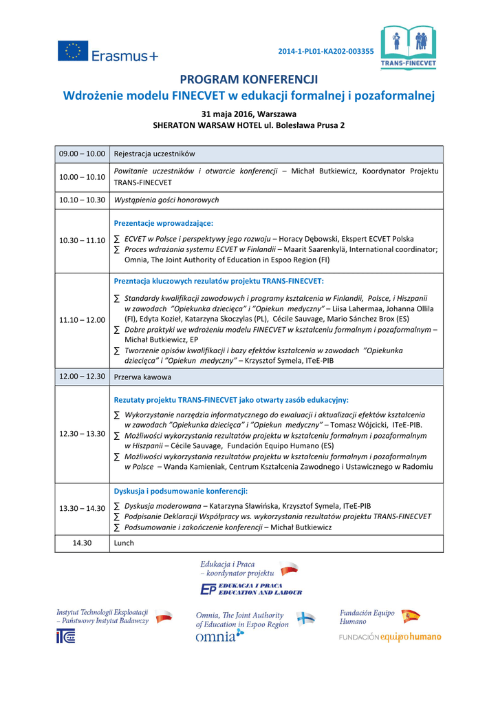 2014-1-PL01-KA202-003355 PROGRAM KONFERENCJI Wdrożenie modelu FINECVET w edukacji formalnej i pozaformalnej 31 maja 2016, Warszawa SHERATON WARSAW HOTEL ul. Bolesława Prusa 2 09.00 – 10.00 Rejestracja uczestników 10.00 – 10.10 Powitanie uczestników i otwarcie konferencji – Michał Butkiewicz, Koordynator Projektu TRANS-FINECVET 10.10 – 10.30 Wystąpienia gości honorowych Prezentacje wprowadzające: 10.30 – 11.10 · ECVET w Polsce i perspektywy jego rozwoju – Horacy Dębowski, Ekspert ECVET Polska · Proces wdrażania systemu ECVET w Finlandii – Maarit Saarenkylä, International coordinator; Omnia, The Joint Authority of Education in Espoo Region (FI) Prezntacja kluczowych rezulatów projektu TRANS-FINECVET: 11.10 – 12.00 12.00 – 12.30 · Standardy kwalifikacji zawodowych i programy kształcenia w Finlandii, Polsce, i Hiszpanii w zawodach ”Opiekunka dziecięca” i ”Opiekun medyczny” – Liisa Lahermaa, Johanna Ollila (FI), Edyta Kozieł, Katarzyna Skoczylas (PL), Cécile Sauvage, Mario Sánchez Brox (ES) · Dobre praktyki we wdrożeniu modelu FINECVET w kształceniu formalnym i pozaformalnym – Michał Butkiewicz, EP · Tworzenie opisów kwalifikacji i bazy efektów kształcenia w zawodach ”Opiekunka dziecięca” i ”Opiekun medyczny” – Krzysztof Symela, ITeE-PIB Przerwa kawowa Rezutaty projektu TRANS-FINECVET jako otwarty zasób edukacyjny: 12.30 – 13.30 · Wykorzystanie narzędzia informatycznego do ewaluacji i aktualizacji efektów kształcenia w zawodach ”Opiekunka dziecięca” i ”Opiekun medyczny” – Tomasz Wójcicki, ITeE-PIB. · Możliwości wykorzystania rezultatów projektu w kształceniu formalnym i pozaformalnym w Hiszpanii – Cécile Sauvage, Fundación Equipo Humano (ES) · Możliwości wykorzystania rezultatów projektu w kształceniu formalnym i pozaformalnym w Polsce – Wanda Kamieniak, Centrum Kształcenia Zawodnego i Ustawicznego w Radomiu Dyskusja i podsumowanie konferencji: 13.30 – 14.30 14.30 · Dyskusja moderowana – Katarzyna Sławińska, Krzysztof Symela, ITeE-PIB · Podpisanie Deklaracji Współpracy ws. wykorzystania rezultatów projektu TRANS-FINECVET · Podsumowanie i zakończenie konferencji – Michał Butkiewicz Lunch