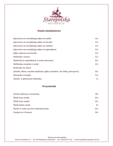 Dania śniadaniowe Jajecznica ze swojskiego jajka na maśle 14,-‐ Jajecznica ze swojskiego jajka na boczku 14,-‐ Jajecznica ze swojskiego jajka na cebulce 14,-‐ Jajecznica ze swojskiego jajka ze szpinakiem 14,-‐ Jajka sadzone na boczku 14,-‐ Naleśnik z serem 12,-‐ Naleśnik ze szpinakiem w sosie serowym 24,-‐ Kiełbaska swojska z wody 15,-‐ Jedzonko na desce (masło, dżem, szynka wędzona, jajko, pomidor, ser żółty, pieczywo) 24,-‐ Kaszanka swojska 14,-‐ Smalec w glinianym dzbanku 5,-‐ Przystawki Serek wędzony z żurawiną 18,-‐ Śledź trzy smaki 24,-‐ Śledź dwa smaki 16,-‐ Śledź jeden smak 8,-‐ Kurki w sosie serowo-‐śmietanowym 24,-‐ Carpaccio z łososia 26,-‐ Restauracja Staropolska Kuźnica Piaskowa 71 ·∙ 42-‐510 Wojkowice Kościelne ·∙ tel.: (32) 674 37 25 ·∙ [email protected] Zupy Rosół domowy 9,-‐ Zupa cebulowa z grzankami 11,-‐ Zupa grochowa 10,-‐ Żurek staropolski 13,-‐ Wodzianka 9,-‐ Barszcz czerwony wiejski 10,-‐ Barszcz czerwony z uszkami 13,-‐ Barszcz czerwony – kubek 7,-‐ Żurek – kubek 7,-‐ Sałatki Sałatka szlachecka (ser feta, sałata, pomidor, ogórek, oliwki) 24,-‐ Sałatka dworska (sałata, pomidor, ser, kurczak) 32,-‐ Sałatka z mozarellą (sałata, ser mozarella, pomidor, oliwki) 24,-‐ Dania jarskie, półmięsne Pierogi ruskie 18,-‐ Naleśnik ze szpinakiem w sosie serowym 24,-‐ Naleśnik z serem na słodko 12,-‐ Pierogi z mięsem 18,-‐ Pyzy z mięsem 18,-‐ Restauracja Staropolska Kuźnica Piaskowa 71 ·∙ 42-‐510 Wojkowice Kościelne ·∙ tel.: (32) 674 37 25 ·∙ [email protected] Dania mięsne Z drobiu Warkocz z grilla, ryż z warzywami, surówki 19,-‐ Filet z kurczaka w sosie grzybowym, ryż, surówki 29,-‐ Filet z kaczki z kluskami śl., jabłkiem, sosem żuraw., modra kapusta 39,-‐ Rolada z kurczaka ze szpinakiem w sosie serowym, ziemniaki, surówki 32,-‐ Z wieprzowiny Kotlet schabowy, frytki, surówki 19,-‐ Pieczeń wieprzowa, kluski śląskie, kapusta zasmażana 33,-‐ Stek z polędwicy-‐grill na grzance z jajkiem, kluski śląskie, modra kapusta 38,-‐ Karczek-‐grill, ziemniaki z patelni, surówki 19,-‐ Golonka pieczona w piwie i miodzie 100g / 7,-‐ Piramida (polędwica, ser, szynka) z żurawiną, ziemniaki 38,-‐ Polędwica na ostro z warzywami, ryż 39,-‐ Stek z grilla z kluskami śląskimi. modra kapusta 38,-‐ Z wołowiny Polędwica na ostro z warzywami, ryż 49,-‐ Stek z grilla z kluskami śląskie. modra kapusta 48,-‐ Rolada wołowa, kluski śląskie, modra kapusta 39,-‐ Restauracja Staropolska Kuźnica Piaskowa 71 ·∙ 42-‐510 Wojkowice Kościelne ·∙ tel.: (32) 674 37 25 ·∙ [email protected] Dania mięsne Ryby Pstrąg -‐ filet w sosie śmietanowo-‐koperkowym 100g / 11,-‐ Sandacz – filet w sosie śmietanowo-‐koperkowym, kapary 100g / 18,-‐ Łosoś z grilla 100g / 18,-‐ Menu dziecięce Kotleciki z kurczaka, frytki, surówki 15,-‐ Naleśnik z dżemem 12,-‐ Jajka sadzone, ziemniaki gotowane, surówki 15,-‐ Dodatki Ziemniaki gotowane 5,-‐ Ziemniaki z patelni 7,-‐ Kluski śląskie 8,-‐ Ryż lub ryz z warzywami 7,-‐ Frytki 7,-‐ Masło 3,-‐ Musztarda 3,-‐ Chrzan 3,-‐ Ketchup 3,-‐ Pieczywo -‐ wyrób własny 5,-‐ Smalec w glinianym dzbanku 5,-‐ Sos ostry, ziołowy lub czosnkowy 3,-‐ Restauracja Staropolska Kuźnica Piaskowa 71 ·∙ 42-‐510 Wojkowice Kościelne ·∙ tel.: (32) 674 37 25 ·∙ [email protected] Jarzyny gotowane i surówki Kapusta zasmażana 8,-‐ Bukiet warzyw gotowanych 8,-‐ Buraczki z chrzanem 7,-‐ Surówka z marchewki 7,-‐ Surówka z kapusty kiszonej 7,-‐ Kapusta czerwona duszona 8,-‐ Desery Lody z owocami, bitą śmietaną i adwokatem 16,-‐ Sernik – wyrób własny 10,-‐ Tiramisu -‐ wyrób własny 16,-‐ Jabłko pieczone z miodem 16,-‐ Banan z lodami, bitą śmietaną i adwokatem 16,-‐ Restauracja Staropolska Kuźnica Piaskowa 71 ·∙ 42-‐510 Wojkowice Kościelne ·∙ tel.: (32) 674 37 25 ·∙ [email protected] Napoje gorące Herbata – Dilmah Gold 200 ml 5,-‐ Herbata owocowa 200 ml 5,-‐ Herbata liściasta 200 ml 5,-‐ Kawa ekspres lub espresso 200 ml 6,-‐ Kawa rozpuszczalna lub parzona 200 ml 6,-‐ Latte 200 ml 9,-‐ Cappuccino 200 ml 9,-‐ Kawa mrożona 200 ml 9,-‐ Kawa z żółtkiem 200 ml 9,-‐ Czekolada na gorąco 200 ml 10,-‐ Kakao 200 ml 5,-‐ Napoje gorące alkoholizowane Herbata z rumem 200 ml 8,-‐ Herbata po góralsku 200 ml 12,-‐ Kawa Sweet Bitter 200 ml 9,-‐ Kawa Baileys 200 ml 12,-‐ Wino grzane z korzeniami 150 ml 15,-‐ Piwo grzane z cukrem 300 ml 7,-‐ Piwo grzane z cukrem i przyprawami 300 ml 8,-‐ Piwo grzane z cukrem 500 ml 9,-‐ Piwo grzane z cukrem i przyprawami 500 ml 10,-‐ Restauracja Staropolska Kuźnica Piaskowa 71 ·∙ 42-‐510 Wojkowice Kościelne ·∙ tel.: (32) 674 37 25 ·∙ [email protected] Napoje zimne Sok ze świeżych pomarańczy 200 ml 11,-‐ Sok ze świeżych grejpfruitów 200 ml 11,-‐ Sok ze świeżej marchwii 200 ml 11,-‐ Kompot 200 ml 5,-‐ Sok Cappy 100% 300 ml 5,-‐ Coca-‐Cola 200 ml 4,-‐ Maślanka 200 ml 5,-‐ Woda gazowana/niegazowana 200 ml 4,-‐ Drinki bezalkoholowe Syrop kokosowy 50 ml Mleko skondensowane 25 ml Sok ananasowy 25 ml 8,-‐ 10 ml 200 ml 7,-‐ Sok żurawinowy 10 ml Sok grejpfruitowy 200 ml 7,-‐ Blue Curacao Sok pomarańczowy Restauracja Staropolska Kuźnica Piaskowa 71 ·∙ 42-‐510 Wojkowice Kościelne ·∙ tel.: (32) 674 37 25 ·∙ [email protected]