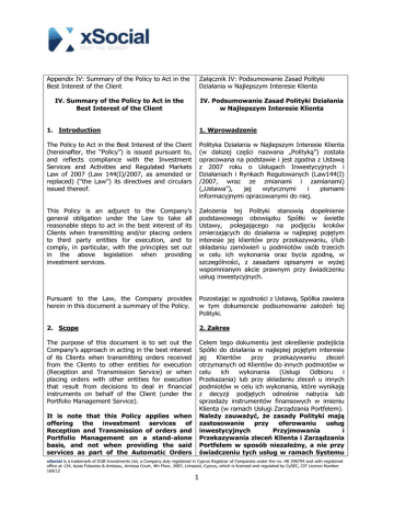 Appendix IV: Summary of the Policy to Act in the Best Interest of the Client Załącznik IV: Podsumowanie Zasad Polityki Działania w Najlepszym Interesie Klienta IV. Summary of the Policy to Act in the Best Interest of the Client IV. Podsumowanie Zasad Polityki Działania w Najlepszym Interesie Klienta 1. Introduction 1. Wprowadzenie The Policy to Act in the Best Interest of the Client (hereinafter, the “Policy”) is issued pursuant to, and reflects compliance with the Investment Services and Activities and Regulated Markets Law of 2007 (Law 144(I)/2007, as amended or replaced) (“the Law”) its directives and circulars issued thereof. Polityka Działania w Najlepszym Interesie Klienta (w dalszej części nazwana „Polityką”) została opracowana na podstawie i jest zgodna z Ustawą z 2007 roku o Usługach Inwestycyjnych i Działaniach i Rynkach Regulowanych (Law144(I) /2007, wraz ze zmianami i zamianami) („Ustawa”), jej wytycznymi i pismami informacyjnymi opracowanymi do niej. This Policy is an adjunct to the Company’s general obligation under the Law to take all reasonable steps to act in the best interest of its Clients when transmitting and/or placing orders to third party entities for execution, and to comply, in particular, with the principles set out in the above legislation when providing investment services. Założenia tej Polityki stanowią dopełnienie podstawowego obowiązku Spółki w świetle Ustawy, polegającego na podjęciu kroków zmierzających do działania w najlepiej pojętym interesie jej klientów przy przekazywaniu, i/lub składaniu zamówień u podmiotów osób trzecich w celu ich wykonania oraz bycia zgodną, w szczególności, z zasadami opisanymi w wyżej wspomnianym akcie prawnym przy świadczeniu usług inwestycyjnych. Pursuant to the Law, the Company provides herein in this document a summary of the Policy. Pozostając w zgodności z Ustawą, Spółka zawiera w tym dokumencie podsumowanie założeń tej Polityki. 2. Scope 2. Zakres The purpose of this document is to set out the Company’s approach in acting in the best interest of its Clients when transmitting orders received from the Clients to other entities for execution (Reception and Transmission Service) or when placing orders with other entities for execution that result from decisions to deal in financial instruments on behalf of the Client (under the Portfolio Management Service). Celem tego dokumentu jest określenie podejścia Spółki do działania w najlepiej pojętym interesie jej Klientów przy przekazywaniu zleceń otrzymanych od Klientów do innych podmiotów w celu ich wykonania (Usługi Odbioru i Przekazania) lub przy składaniu zleceń u innych podmiotów w celu ich wykonania, które wynikają z decyzji podjętych odnośnie nabycia lub sprzedaży instrumentów finansowych w imieniu Klienta (w ramach Usługi Zarządzania Portfelem). Należy zauważyć, że zasady Polityki mają zastosowanie przy oferowaniu usług inwestycyjnych Przyjmowania i Przekazywania zleceń Klienta i Zarządzania Portfelem w sposób niezależny, a nie przy świadczeniu tych usług w ramach Systemu It is note that this Policy applies when offering the investment services of Reception and Transmission of orders and Portfolio Management on a stand-alone basis, and not when providing the said services as part of the Automatic Orders xSocial is a trademark of DUB Investments Ltd, a Company duly registered in Cyprus Registrar of Companies under the no. HE 296794 and with registered office at 134, Ayias Fylaxeos & Amissou, Annissa Court, 4th Floor, 3087, Limassol, Cyprus, which is licensed and regulated by CySEC, CIF Licence Number 169/12 1 Feature of the Company. For the later, please refer to paragraph 7 below. Zleceń Automatycznych Spółki. W drugim przypadku, należy odwołać się do paragrafu 7 poniżej. The Policy applies both to Retail and Professional Clients. Zasady Polityki dotyczą zarówno Detalicznych, jak i Profesjonalnych. 3. Transmission and/or Placing of Orders for Execution 3. Przekazywanie lub Składanie Zleceń do Realizacji 3.1. Execution Factors 3.1. Czynniki brane Pod Uwagę Przy Realizacji Spółka ma obowiązek podjęcia wszelkich niezbędnych kroków w celu uzyskania jak najlepszych wyników dla swoich Klientów, biorąc pod uwagę poniższe czynniki przy przekazywaniu lub składaniu zleceń u innych podmiotów: cenę, koszty, szybkość, prawdopodobieństwo realizacji i rozliczenia, wielkość, wpływ rynku, lub inne płatności odnoszące się do realizacji zlecenia. The Company shall take all reasonable steps to obtain the best possible results for its Clients taking into account the following factors when transmitting and/or placing orders to other entities for execution: price, costs, speed, likelihood of execution and settlement, size, market impact or any other consideration relevant to the execution of the order. Klientów The Company does not consider the aforementioned list of execution factors as exhaustive and the order in which the above factors are presented shall not be taken as priority factor. Wymienione powyżej czynniki nie są uznawane przez Spółkę za katalog wyczerpujący, a kolejność ich przedstawienia nie świadczy o wadze ich znaczenia. 3.2. Best Execution Criteria 3.2. Najlepsze Kryteria Realizacji The Company shall determine the relative importance of the above execution factors by using its commercial judgment and experience in the light of the information available on the market and taking into account the below criteria: Spółka określi relatywny wpływ powyższych czynników warunkujących realizację, korzystając ze swojego doświadczenia i dokonując oceny handlowej na podstawie informacji dostępnych na rynku oraz biorąc pod uwagę poniższe kryteria: i. ii. iii. iv. The characteristics of the Client including the categorization of the Client as Retail or Professional; The characteristics of the Client order; The characteristics of th