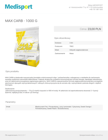 Sklep MEDISPORT ul. Haraszowskie 71a, 47-110 Kolonowskie +48 791 987 600 MAX CARB - 1000 G Cena: 23,00 PLN Opis słownikowy Dostawa 3 dni Producent TREC Skład Odżywki węglowodanowe Zastosowanie Masa Opis produktu MAX CARB to doskonale rozpuszczalny kompleks zróżnicowanych oligo- i polisacharydów, wzbogacony o niezbędne do zachowania wysokiej wydolności pierwiastki elektrolitowe. Preparat skutecznie uzupełnia traconą podczas ćwiczeń energię, zapobiega odwodnieniu, a po ich zakończeniu przyspiesza regenerację organizmu. MAX CARB to zaawansowana formuła węglowodanowa polecana szczególnie sportowcom dyscyplin wytrzymałościowych i siłowych, która przyczynia się do wzrostu siły i wytrzymałości podczas długich i ciężkich treningów. Dawkowanie: Jednorazową porcję preparatu – 75 g (2 miarki) rozpuścić w 500 ml wody. W zależności od zapotrzebowania stosować 2–3 porcji dziennie, najlepiej przed, w trakcie i po treningu. Parametry Smak Plik wygenerowano: 08-03-2017 Blackcurrant Fire / Porzeczkowy, Juicy Lemonade / Cytrynowy, Sweet Orange / Pomarańczowy, Sweet Peach / Brzoskwiniowy Oprogramowanie sklepu: AptusShop Sklep MEDISPORT ul. Haraszowskie 71a, 47-110 Kolonowskie +48 791 987 600 Galeria Plik wygenerowano: 08-03-2017 Powered by TCPDF (www.tcpdf.org) Oprogramowanie sklepu: AptusShop
