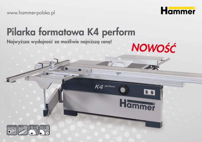 www.hammer-polska.pl Pilarka formatowa K4 perform Najwyższa wydajność za możliwie najniższą cenę! 5,5 KM (7,5 KM) 3200 mm 90° 103 mm 45° 72 mm Ø 315 mm ø 100 mm NOWOŚĆ Dane techniczne 1000 125 2780 840 1052 Agregat pilarki 1003 1702 1275 345 O S O S 1308 80 3038 1734 Osłona górna tarczy piły dla K4, odchylana Przykładnica równoległa Profi z obudową z szarego żeliwa Precyzyjna regulacja dla przykładnicy równoległej Profi Podcinak napędzany elektrycznie 1355 S W O S W S O 500 3x 400 V 3x 230 V 1x 230 V, 4,0 KM (3,0 kW) S6/40% 50 Hz 60 Hz 5,5 KM (4,0 kW) S6/40 % 7,5 KM (5,5 kW) S6/40 % 1074 1512 495 Wyposażenie elektryczne 1333 POZ K4 perform Stół formatowy 3200 mm, Długość cięcia formatowego 3200 mm S 3200 2600 Stół formatowy, anodowany Stoły wysięgnika i przykładnice poprzeczne Stół wysięgnika 1250 Szablon kątowy z siatką otworów dla stołu wysięgnika Przykładnica poprzeczna 900 mm dla wszystkich stołów formatowych Przykładnica poprzeczna 2600 mm dla stołu wysięgnika 1250 S O O S Ändgs. buchst Geändert Więcej informacji na www.hammer-polska. Bearbeitet Tag Name Fertigewicht 16.5.2011 H.G. K4 perform: 450 kg sliding table 3200: 150 kg Konstr. Gepr. Masstab Ciężar 1:15 Ciężar w kg (z przeciętnym wyposażeniem) netto/brutto Gepr am Gepr Gez am Gez Diese Zeichnung ist Eigentum der Firma FELDER KG und darf ohne Erlaubnis weder veräußert, kopiert, noch dritten Personen oder Konkurrenzfirmen mitgeteilt werden. Zuwiderhandlungen werden dem Gesetz entsprechend gerichtlich verfolgt. Fa. Felder KG, Maschinenbau Z.Name Maschinen- Aufstellmaße K4 - perform STK / EH ON- Nr: FELDER KG pl KR-FELDER-STR.1, A-6060 HALL in Tirol AUSTRIA, Tel: 05223 / 58 50-0 - Fax: DW 61 www.felder-group.com Profil- / Modellnummer: 550/620 kg S ... Wyposażenie standardowe, W ... Opcja bez dodatkowej dopłaty, O ... Opcja Detale, które Państwa zachwycą! Przykładnica równoległa obsługiwana jedną ręką, lekko chodząca i i dająca się dokładnie ustawić, za pomocą rączki zaciskowej. Do cięć pod kątem przykładnicę teleskopową można płynnie ustawiać w przedziale od 90° do 45°. CS · © 05/2011 · FELDER KG · KR-Felder-Straße 1 A-6060 HALL in Tirol · Tel. +43(0) 05223/58 500 Fax +43(0) 05223/56 130 · [email protected] 500.K4.11.POL